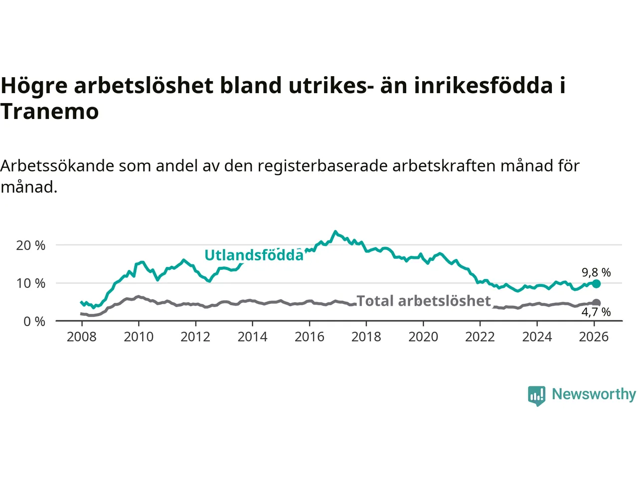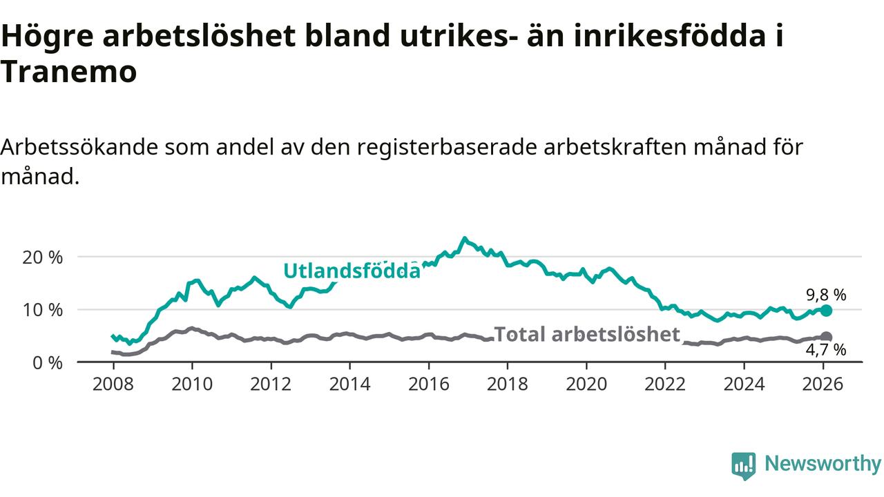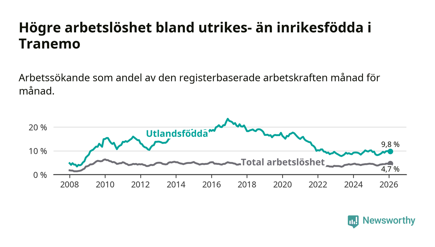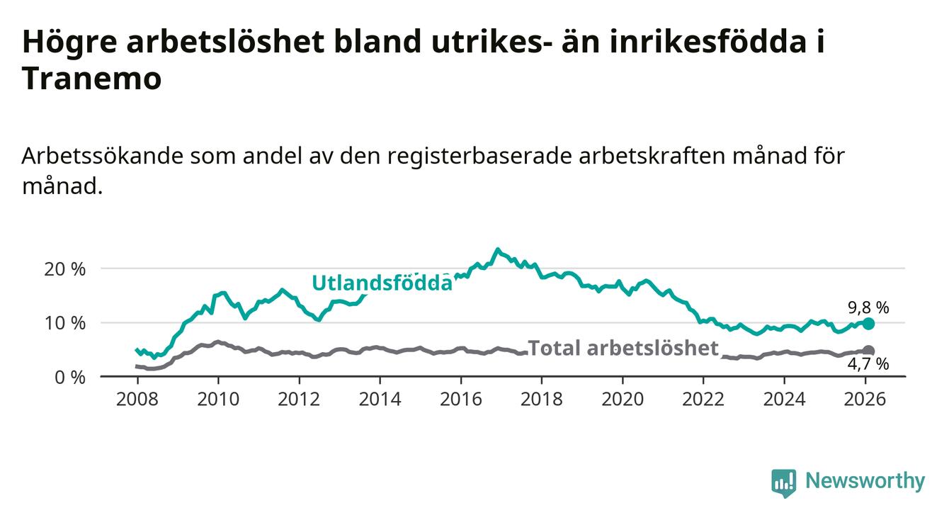 Arbetslösheten bland utlandsfödda var 9,8 procent i Tranemo under februari månad, motsvarande 120 av 1 224 personer. Det är 0,3 procentenheter fler än vid samma tidpunkt i fjol (+8 om man räknar personer). Den senaste månadens uppgång innebär ett trendbrott. Under de två föregående månaderna hade arbetslösheten bland utlandsfödda varit lägre än motsvarande tidpunkt året innan.