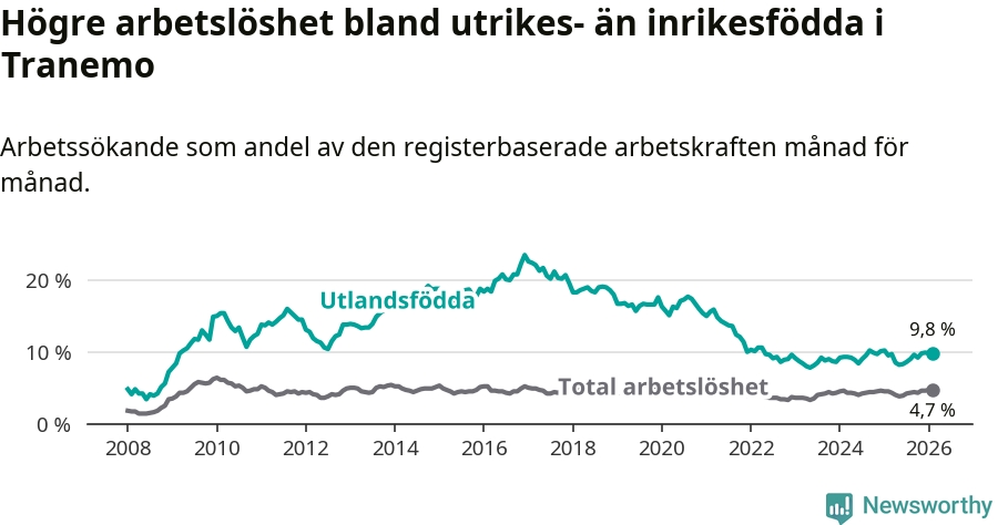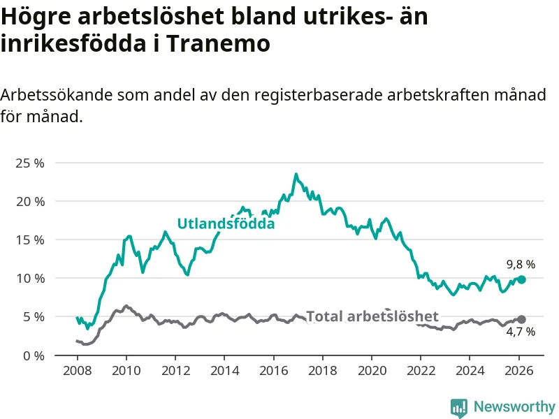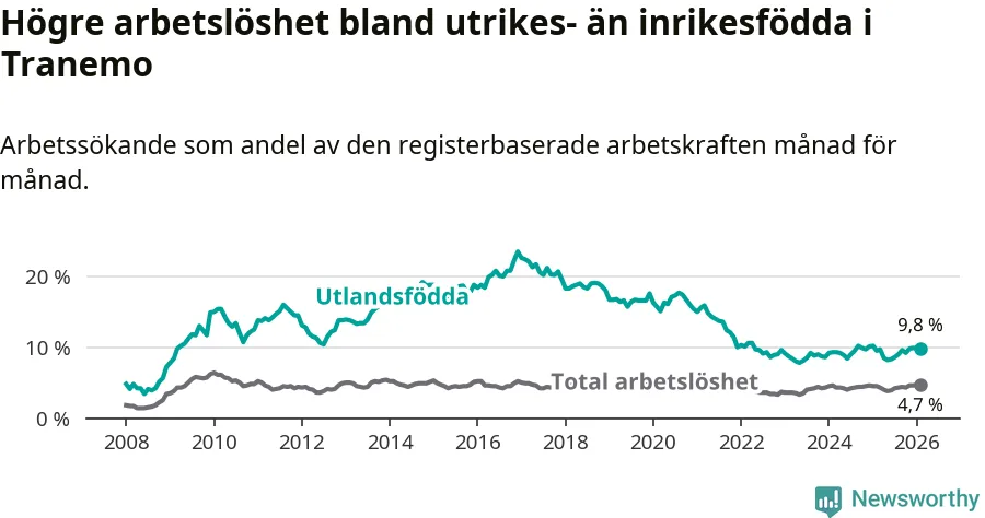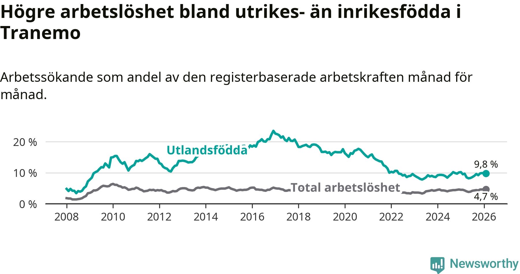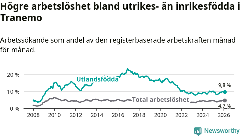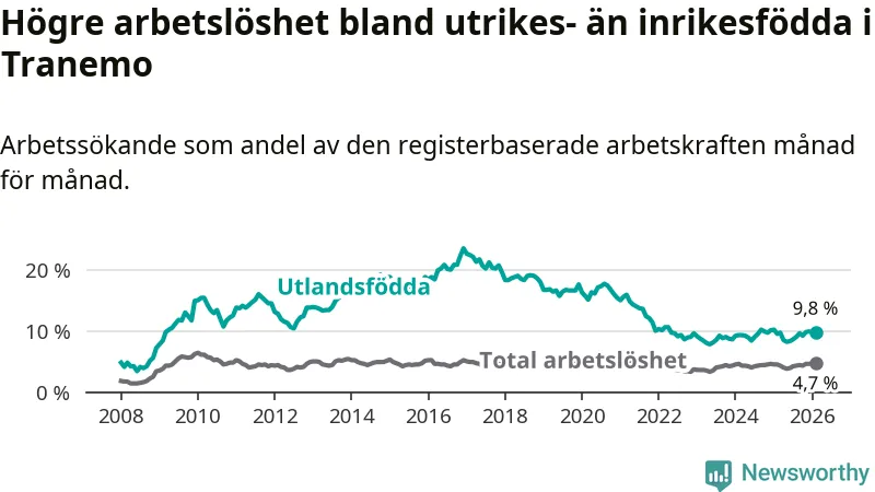 Arbetslösheten bland utlandsfödda var 9,8 procent i Tranemo under februari månad, motsvarande 120 av 1 224 personer. Det är 0,3 procentenheter fler än vid samma tidpunkt i fjol (+8 om man räknar personer). Den senaste månadens uppgång innebär ett trendbrott. Under de två föregående månaderna hade arbetslösheten bland utlandsfödda varit lägre än motsvarande tidpunkt året innan.