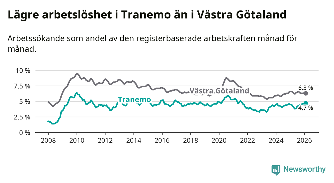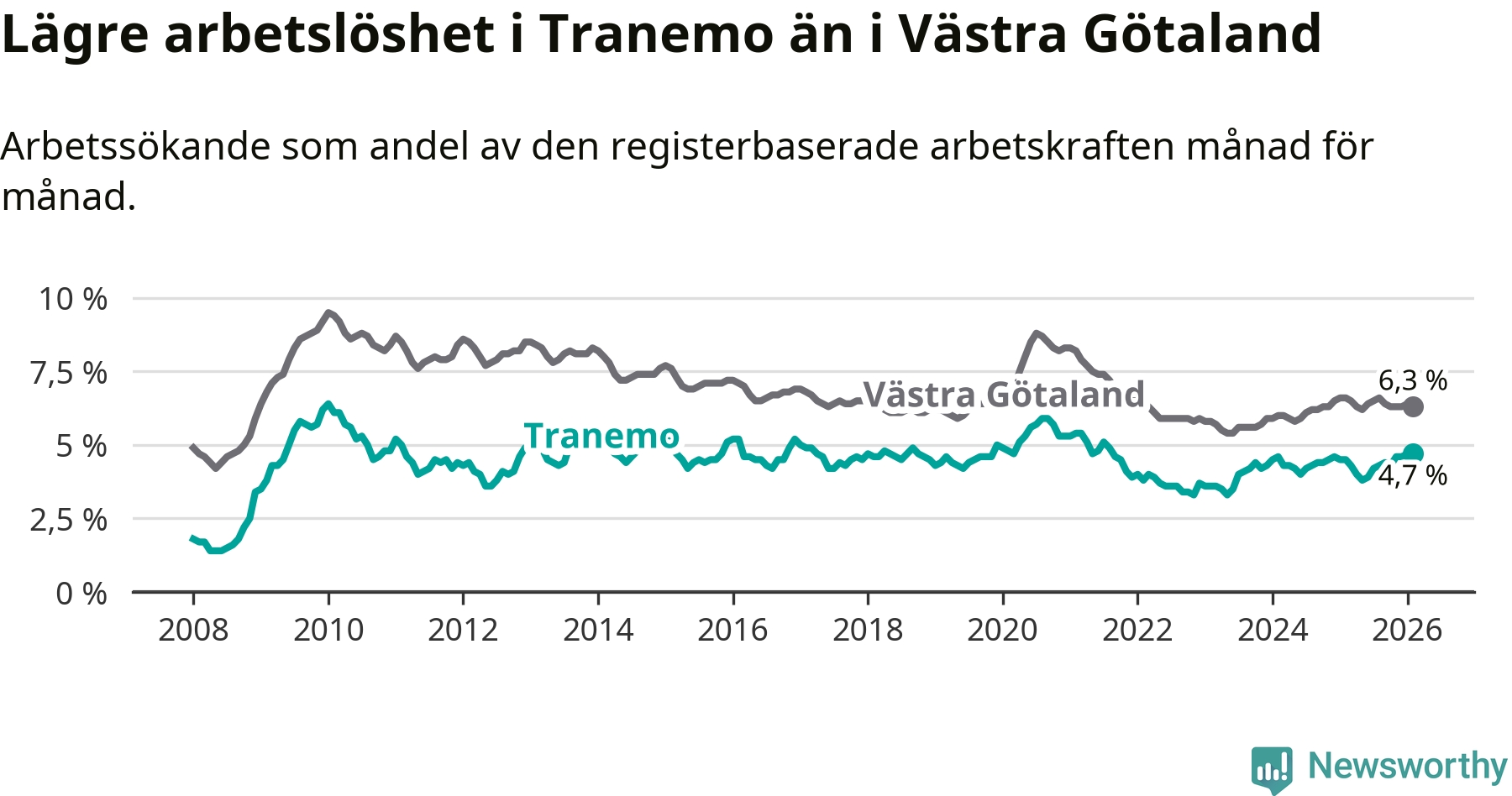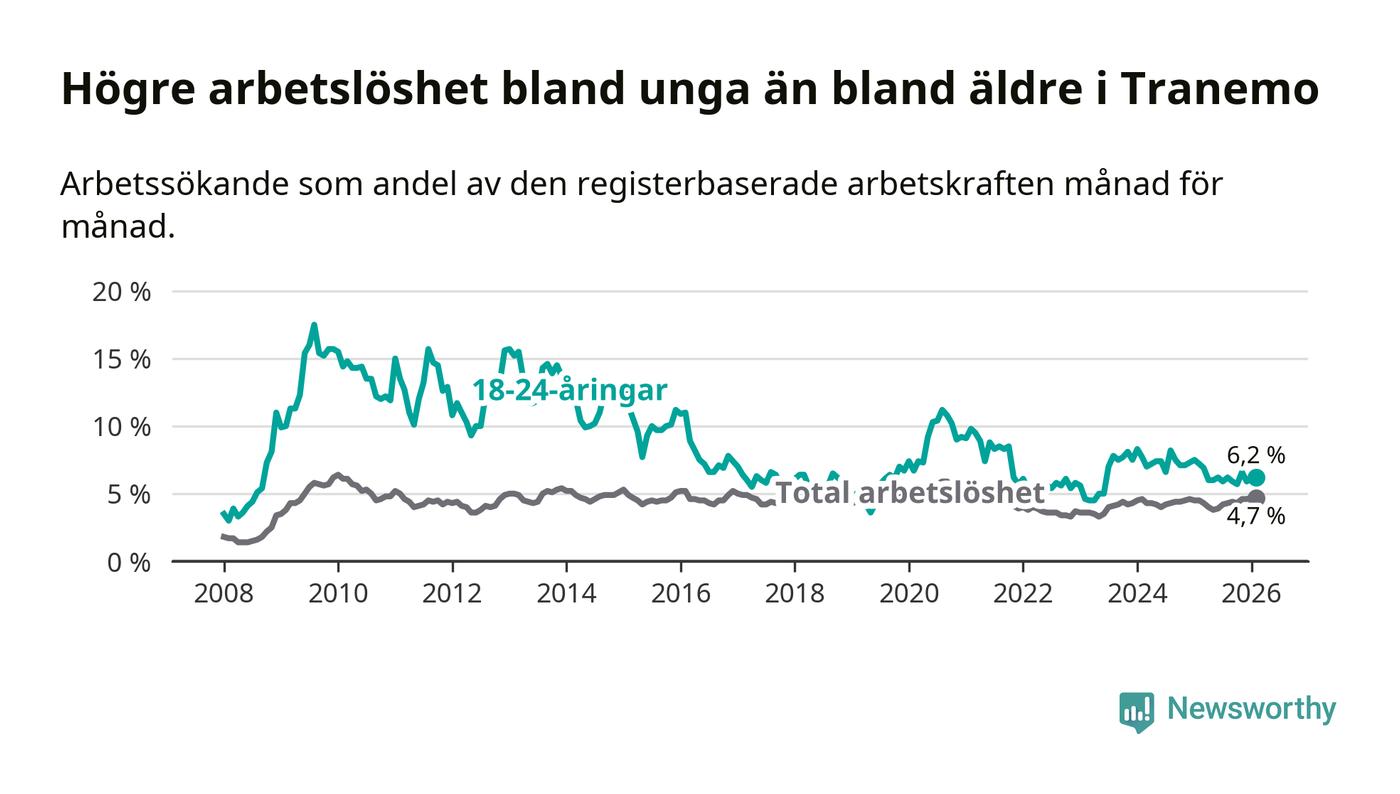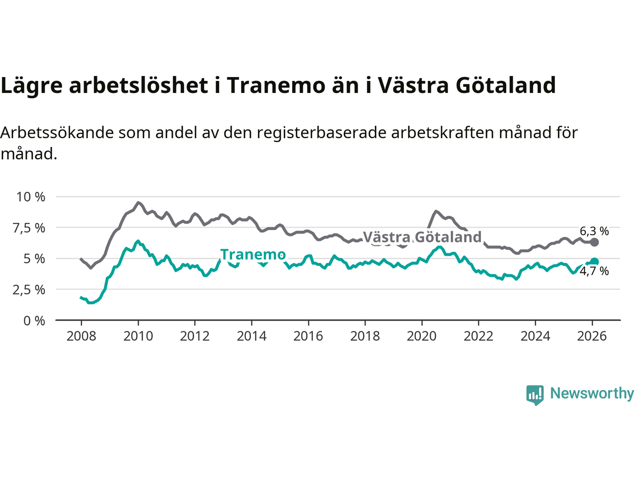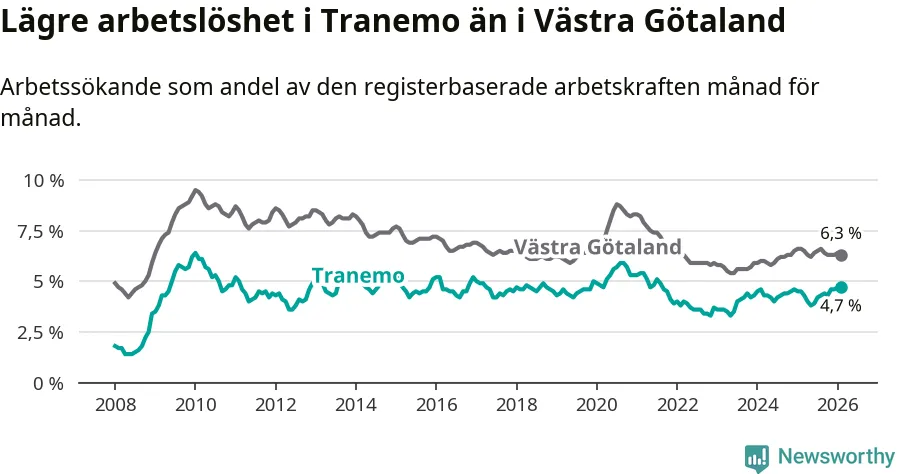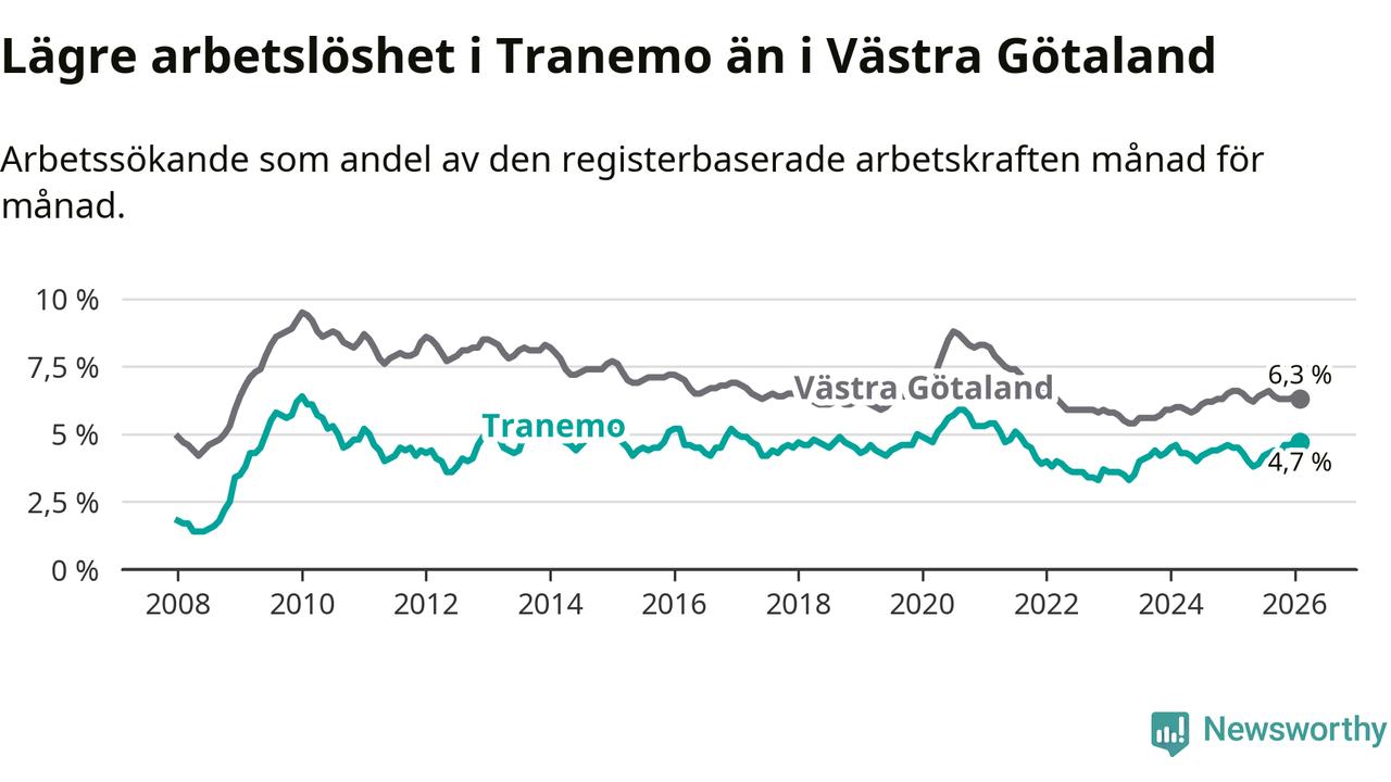 Under februari månad rapporterade Tranemo kommun en total arbetslöshet på 4,7 procent. Det är en ökning jämfört med samma tidpunkt i fjol (+0,2 procentenheter). I Västra Götalands län däremot sjunker arbetslösheten .