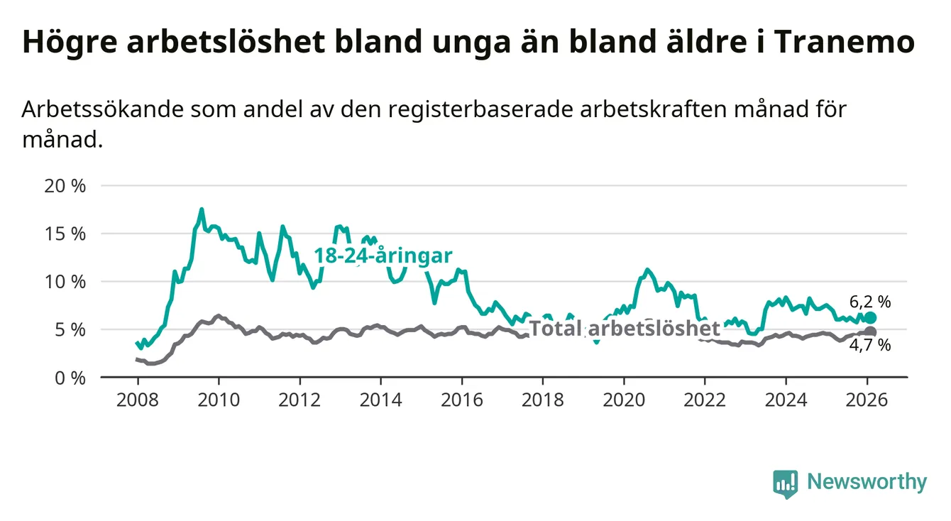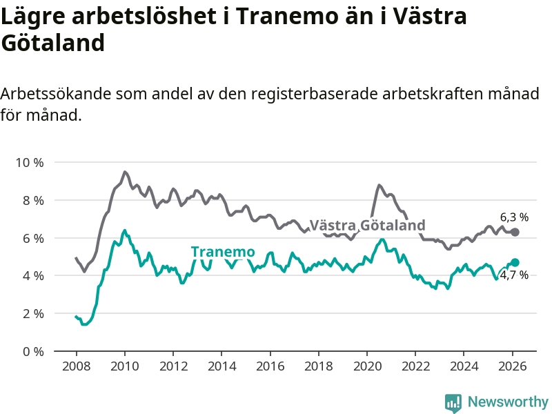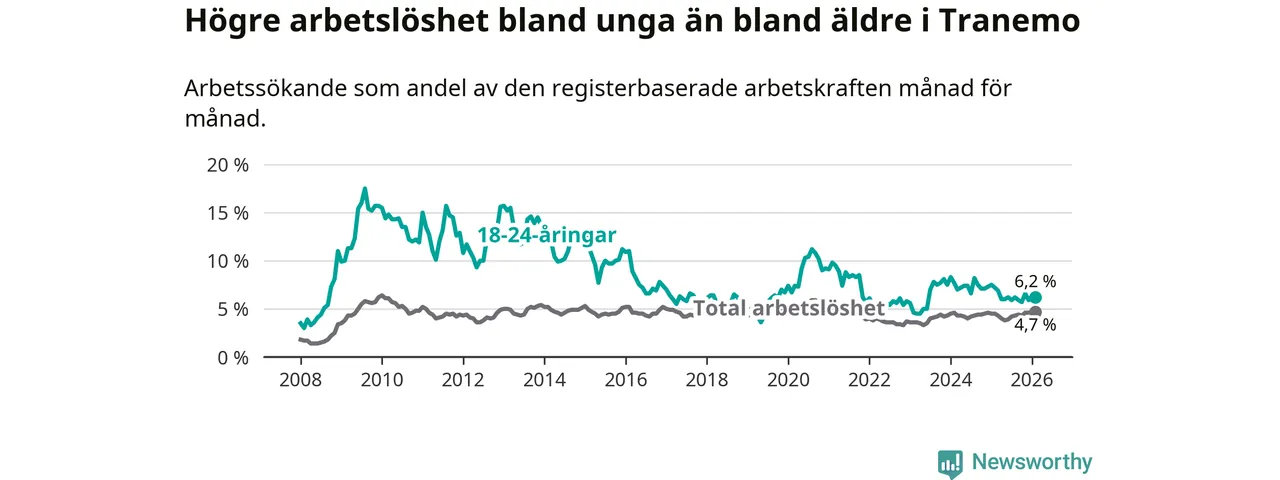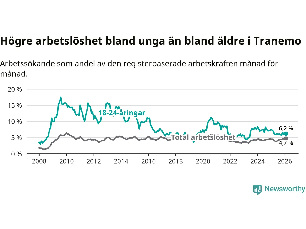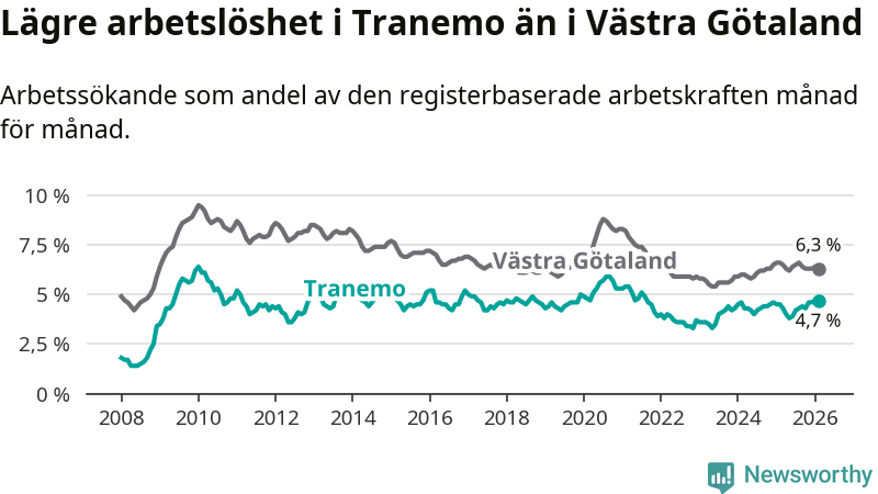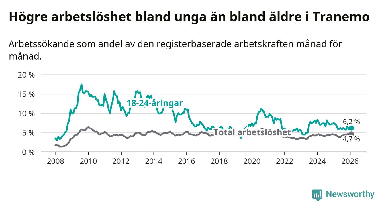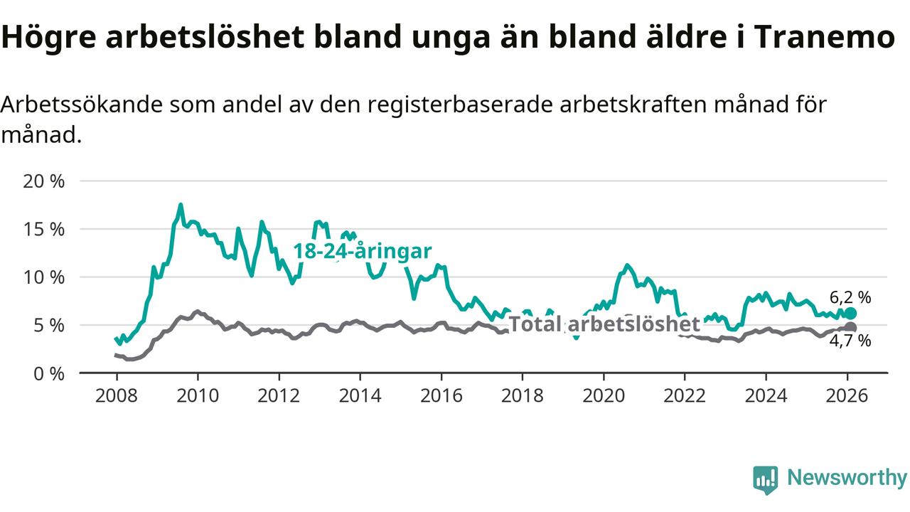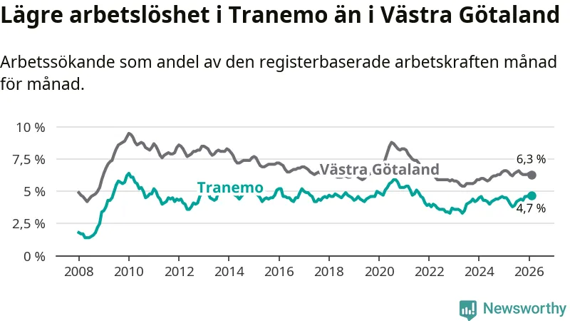 Under februari månad rapporterade Tranemo kommun en total arbetslöshet på 4,7 procent. Det är en ökning jämfört med samma tidpunkt i fjol (+0,2 procentenheter). I Västra Götalands län däremot sjunker arbetslösheten .