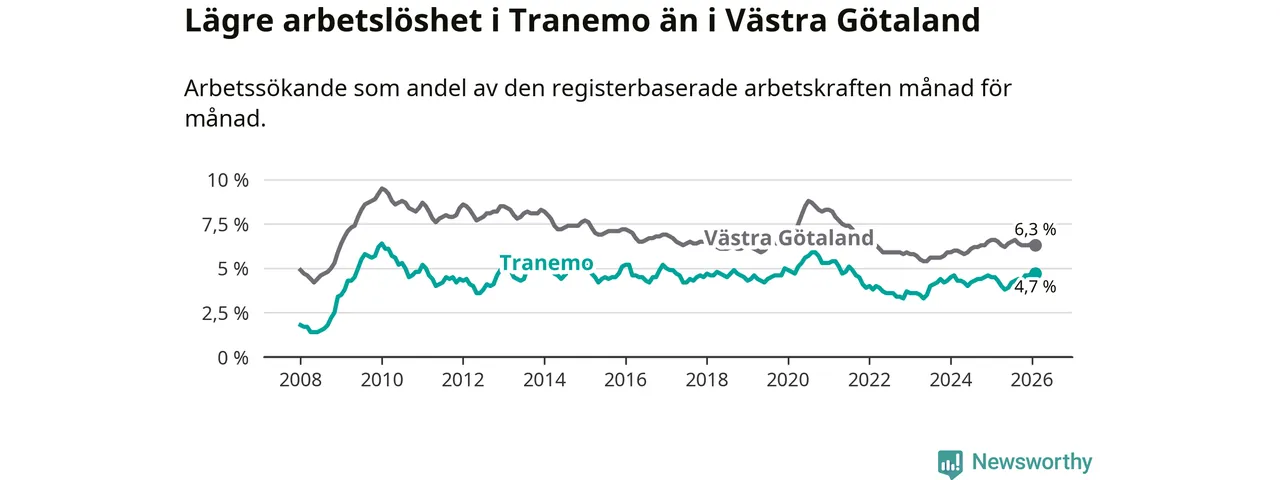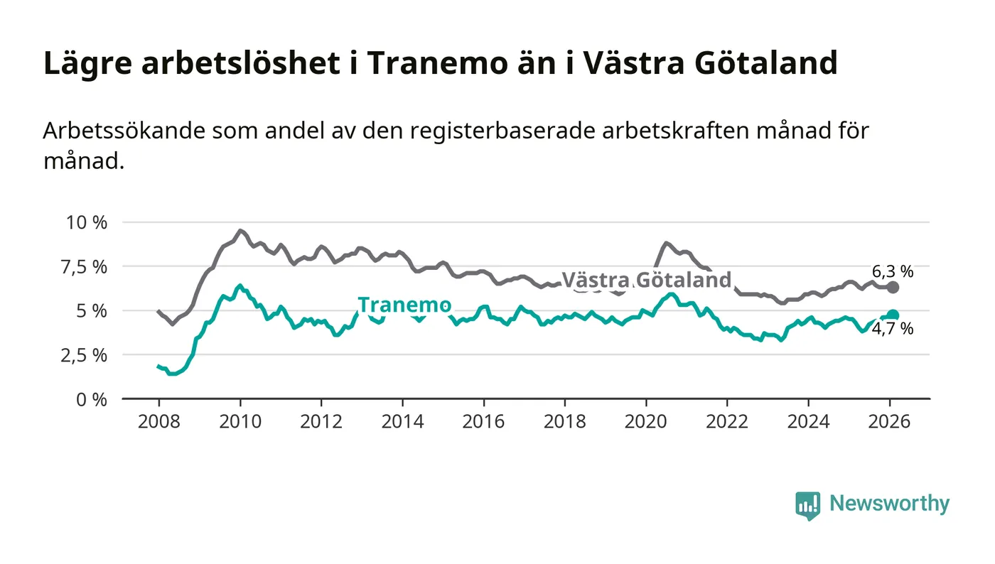 Tranemo går därmed mot strömmen i förhållande till andra kommuner i Västra Götalands län. I de flesta andra kommuner i länet går arbetslösheten nedåt. Störst är minskningen i Bengtsfors och Åmål, där arbetslösheten sjunker med 1,2 procentenheter. I tabellen längre ner ser du utvecklingen i samtliga kommuner i länet.