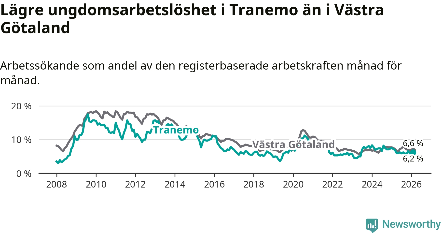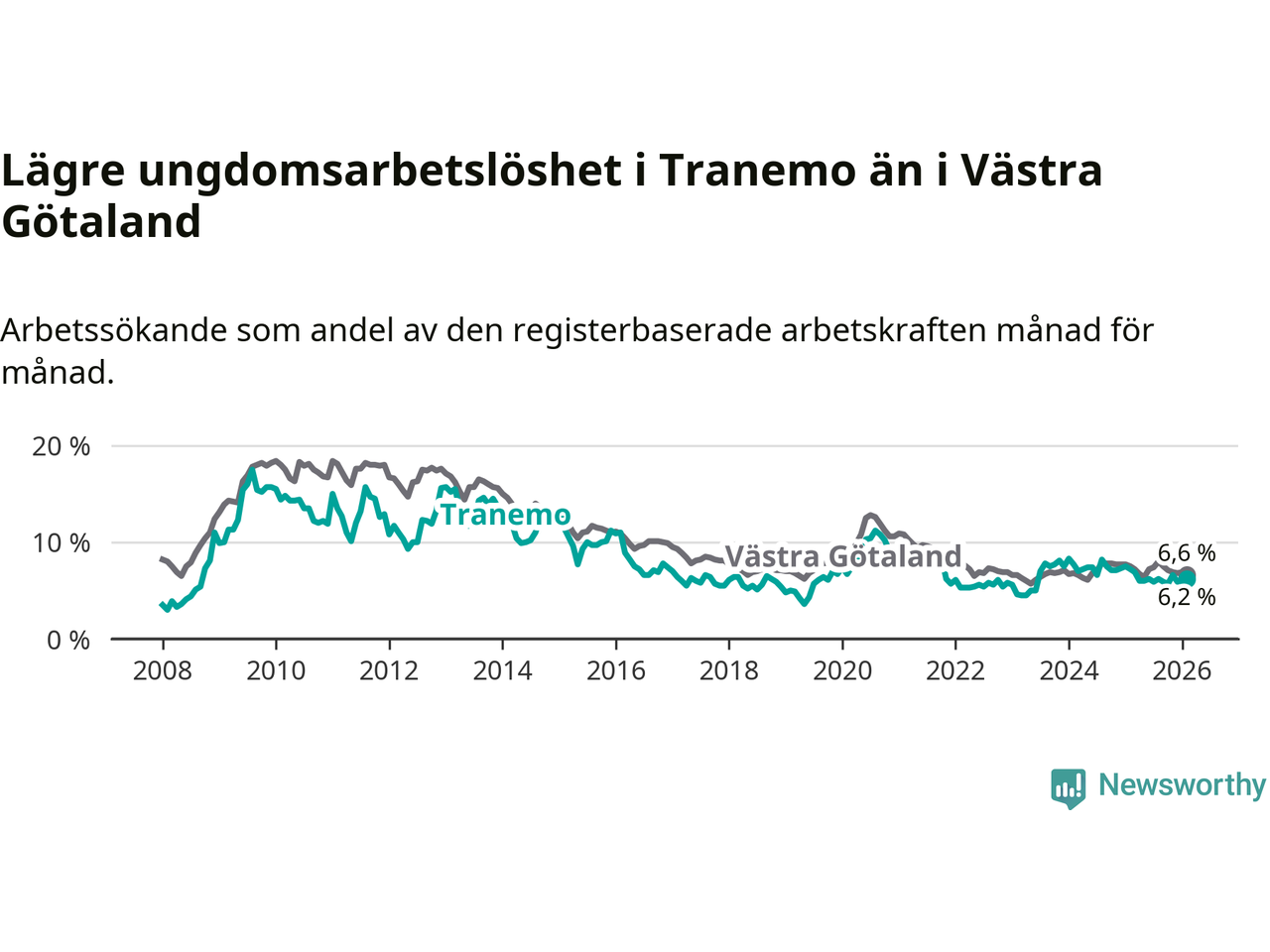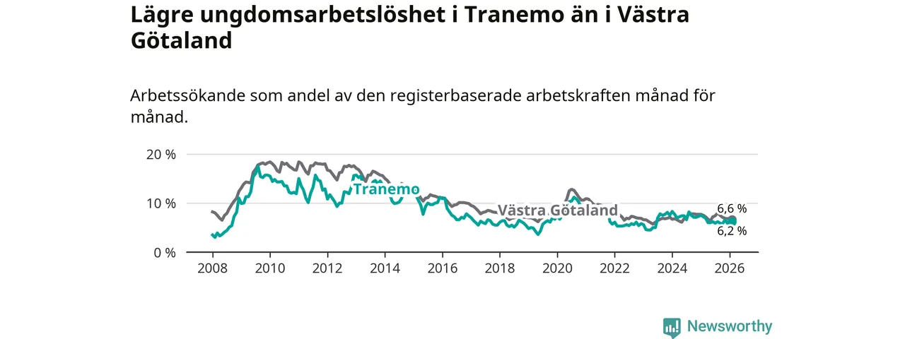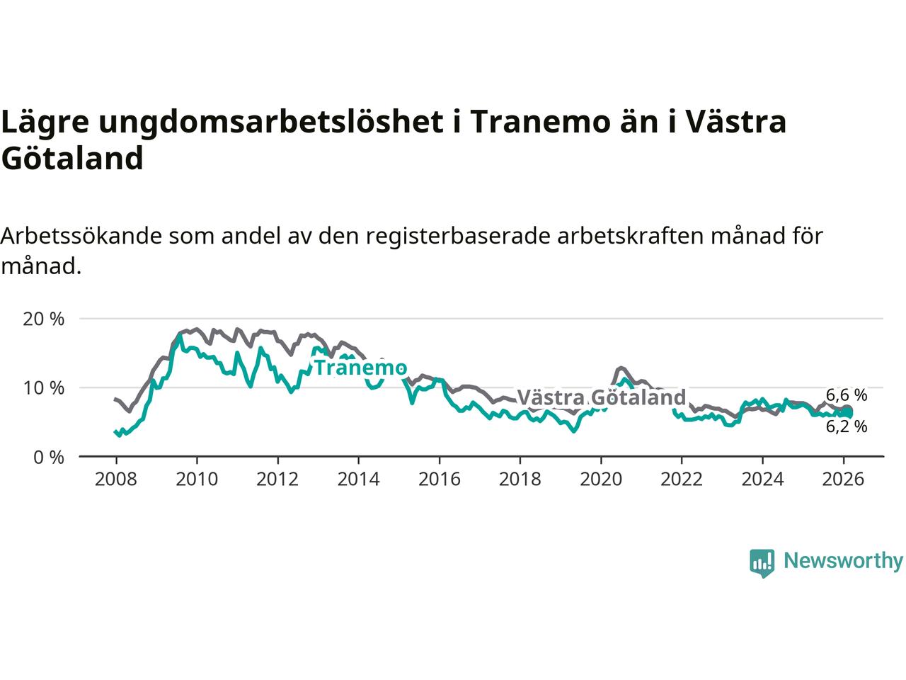 Precis som den totala arbetslösheten ligger ungdomsarbetslösheten i Tranemo lägre än i Västra Götaland som helhet. Skillnaden mellan kommunen och länet är 0,4 procentenheter.