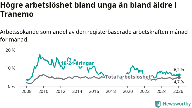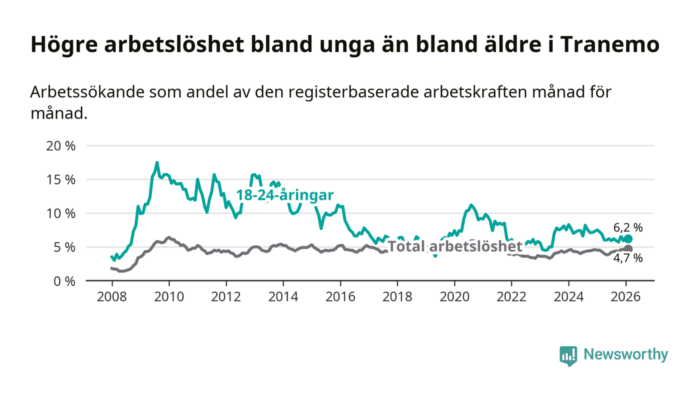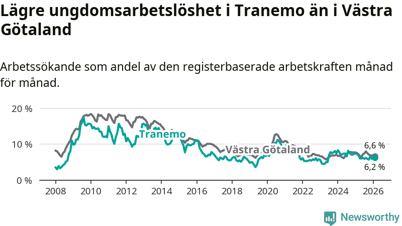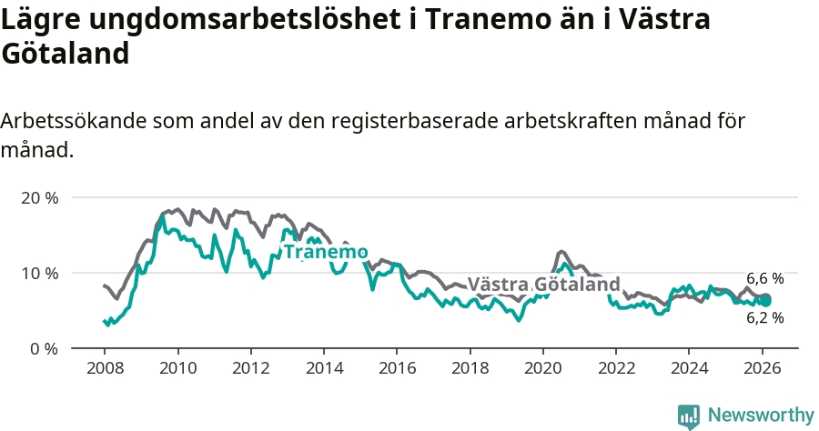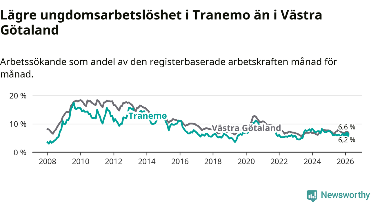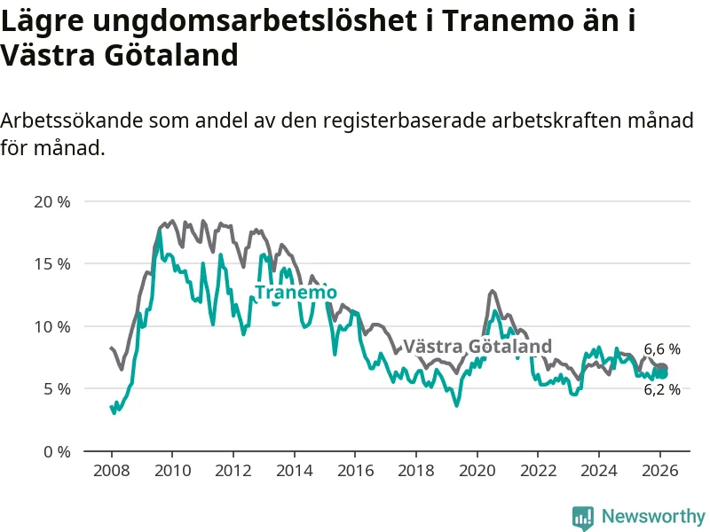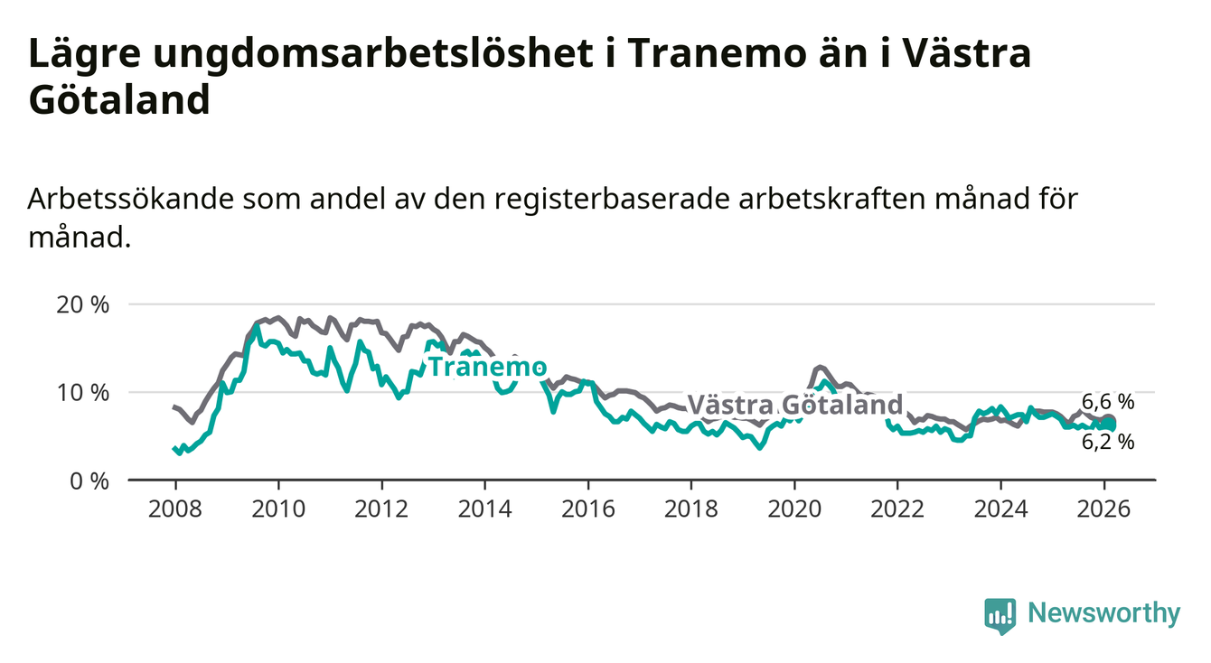 Precis som den totala arbetslösheten ligger ungdomsarbetslösheten i Tranemo lägre än i Västra Götaland som helhet. Skillnaden mellan kommunen och länet är 0,4 procentenheter.