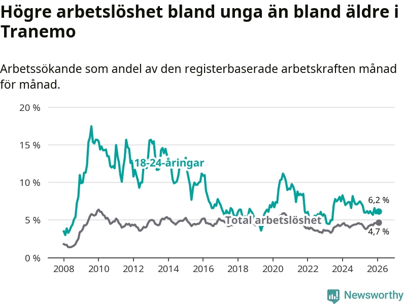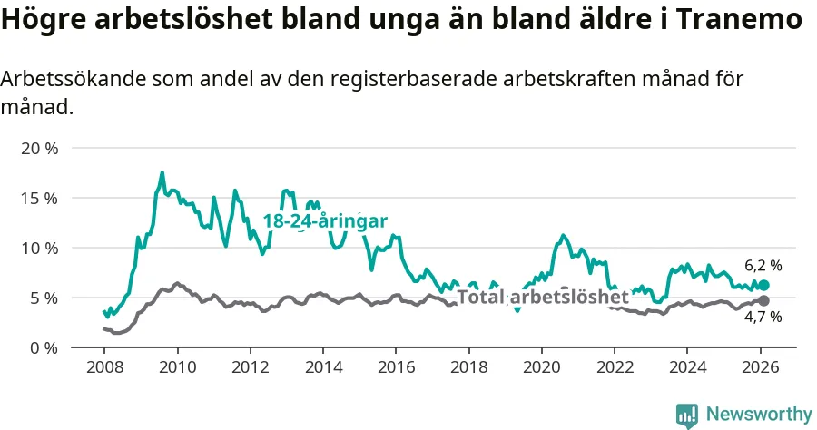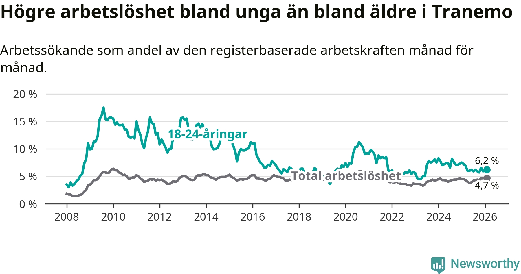 Till skillnad från den totala arbetslösheten sjunker arbetslösheten bland unga (−1 procentenheter). I februari var 6,2 procent av 18–24-åringarna inskrivna som arbetssökande (motsvarande 35 personer). Mäter vi antalet inskrivna ser vi en minskning med sju personer på ett års sikt.