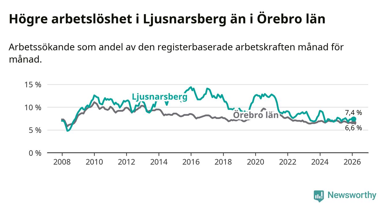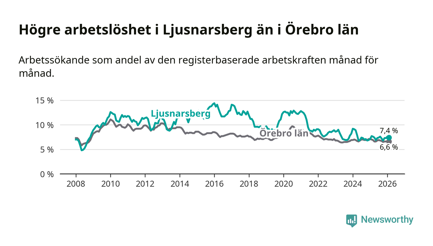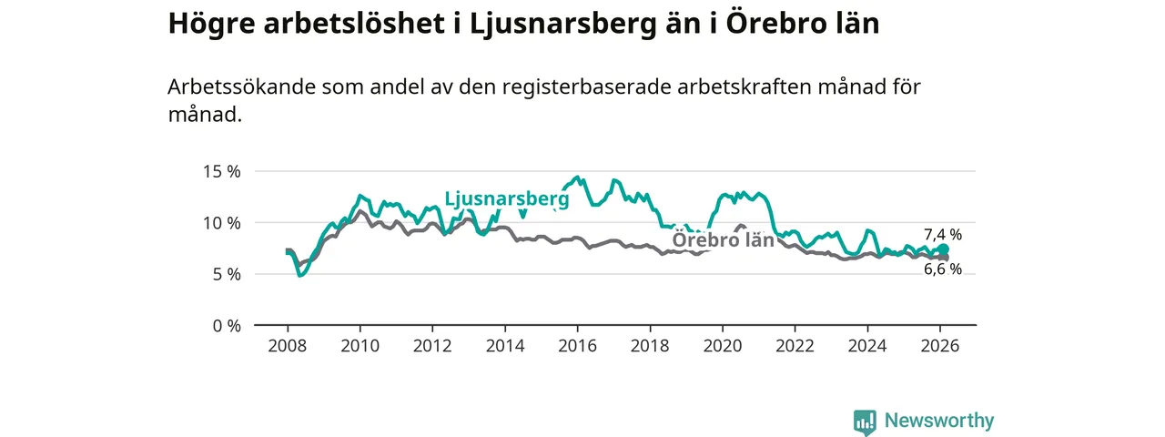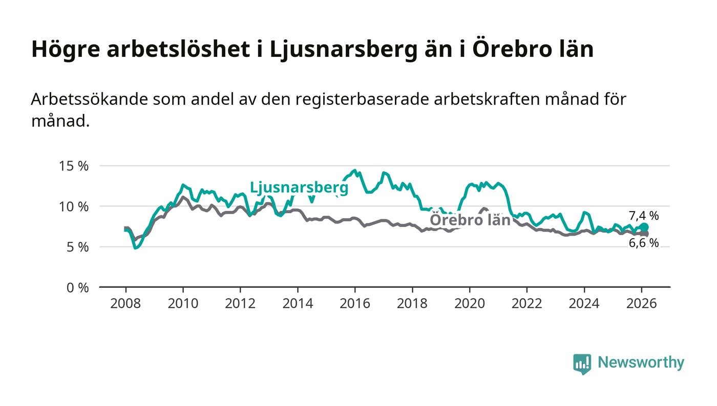 Under februari månad rapporterade Ljusnarsbergs kommun en total arbetslöshet på 7,4 procent. Det är en minskning jämfört med samma tidpunkt i fjol (−0,3 procentenheter). Även i Örebro län sjunker arbetslösheten .