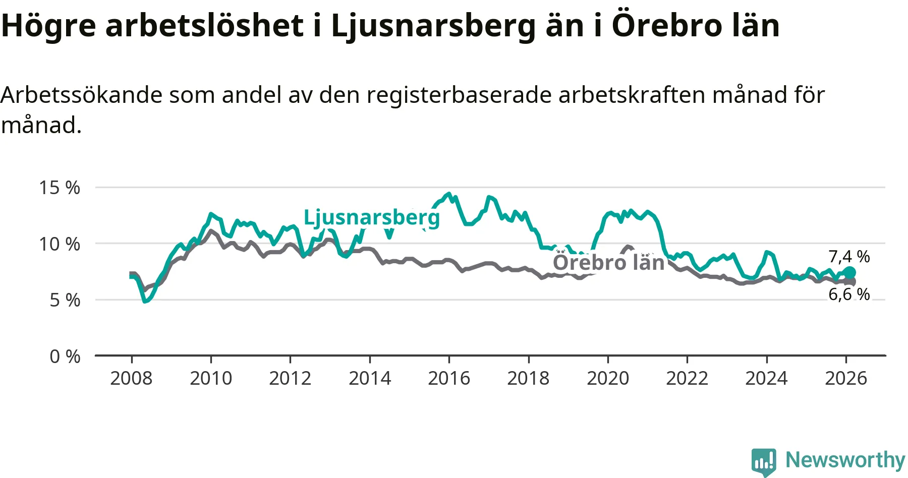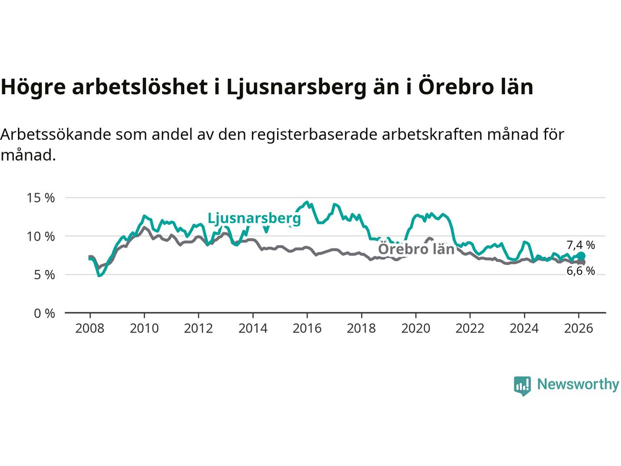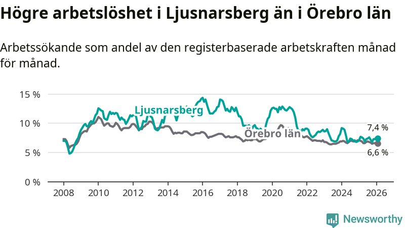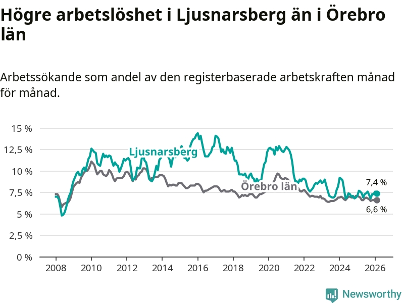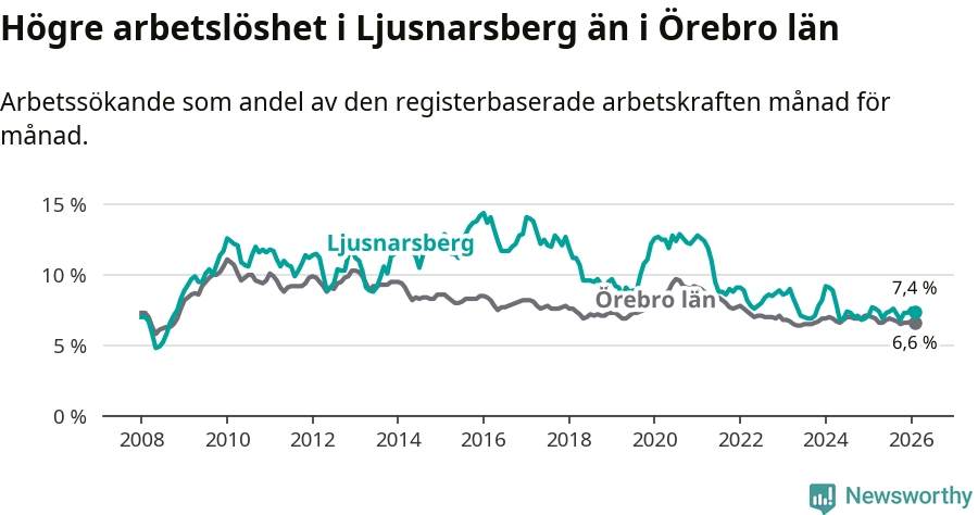 Under februari månad rapporterade Ljusnarsbergs kommun en total arbetslöshet på 7,4 procent. Det är en minskning jämfört med samma tidpunkt i fjol (−0,3 procentenheter). Även i Örebro län sjunker arbetslösheten .