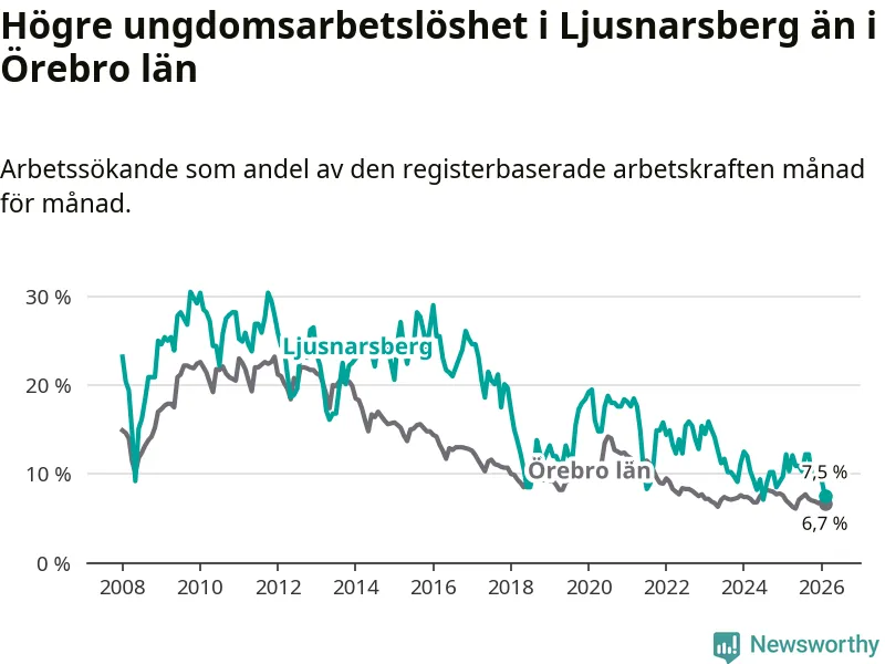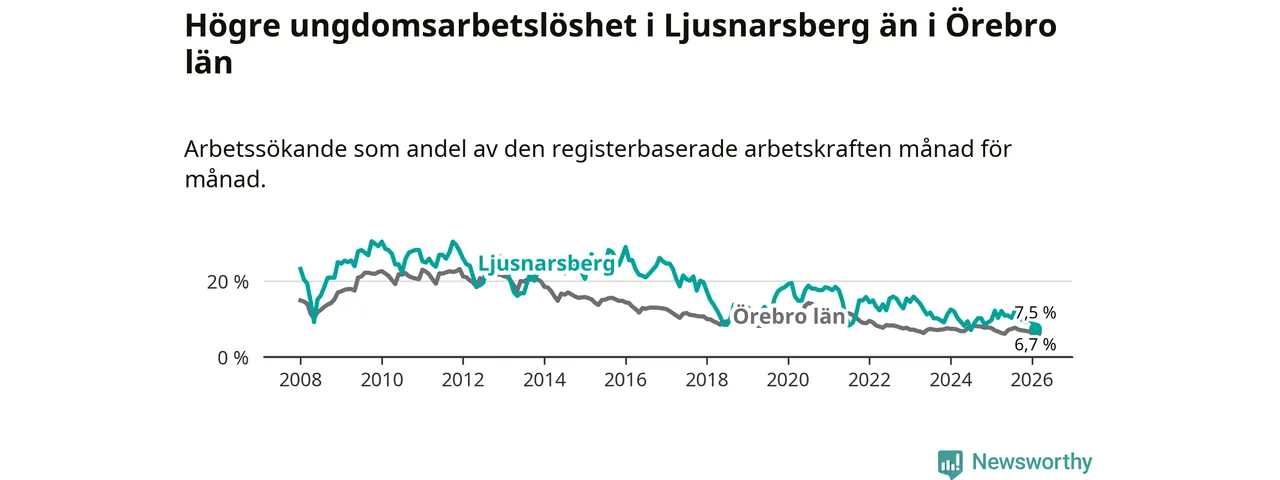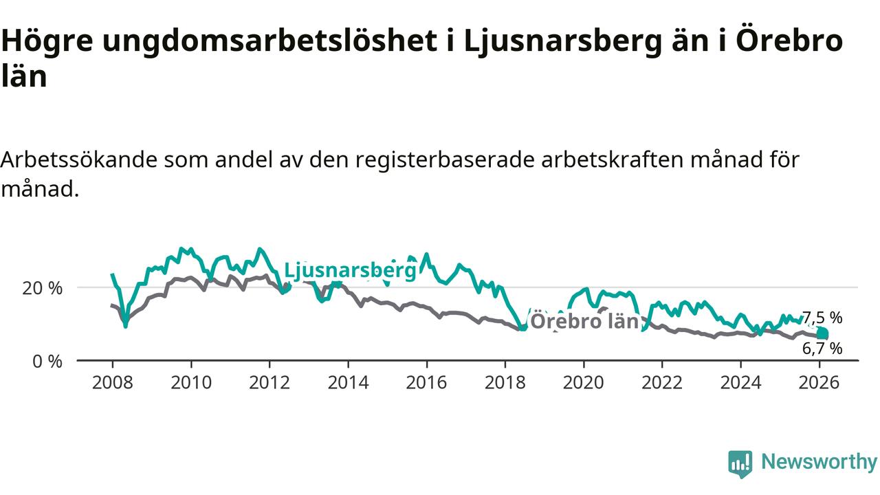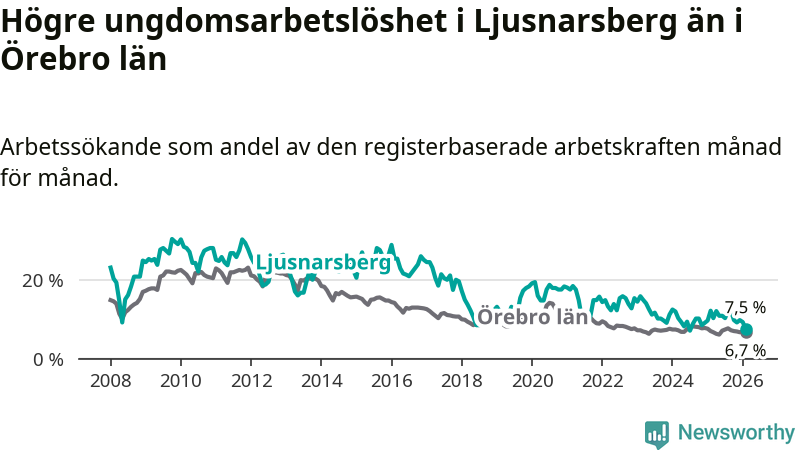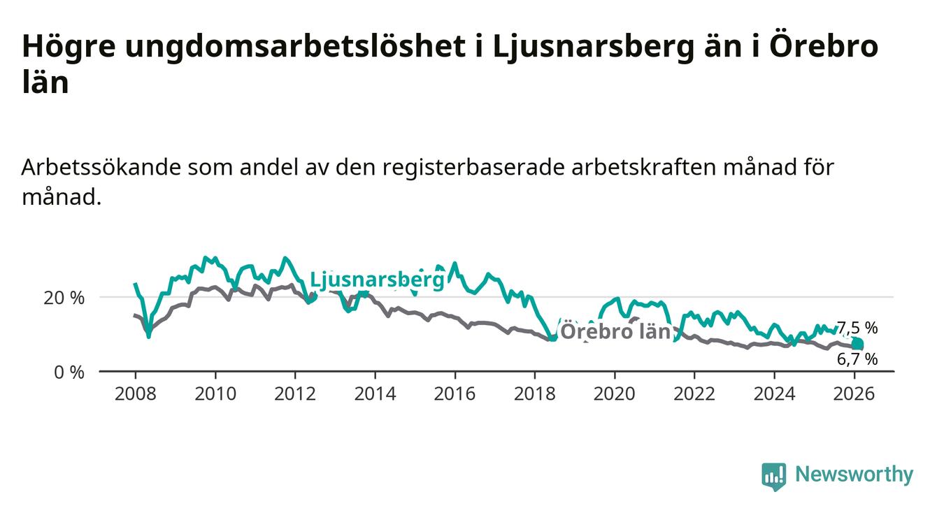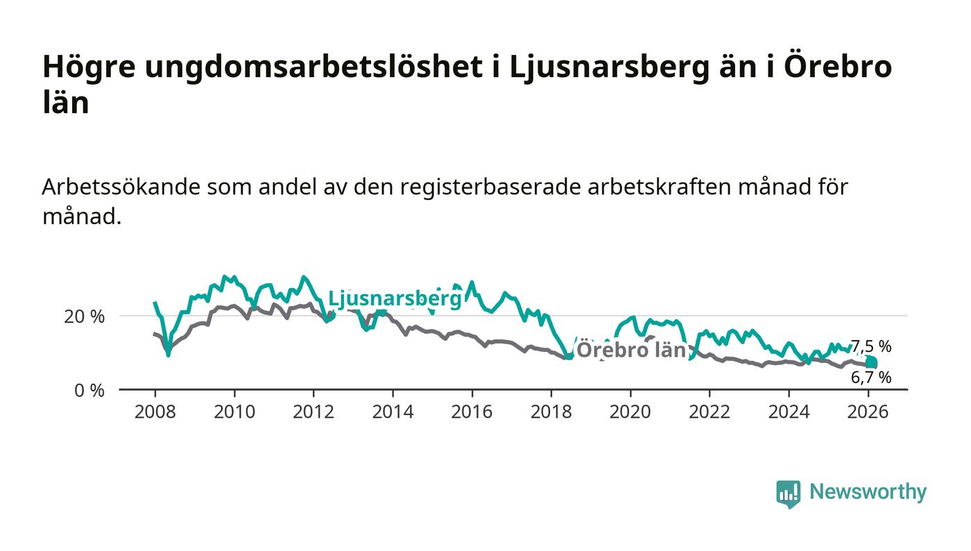 Precis som den totala arbetslösheten ligger ungdomsarbetslösheten i Ljusnarsberg högre än i Örebro som helhet. Skillnaden mellan kommunen och länet är 0,8 procentenheter.