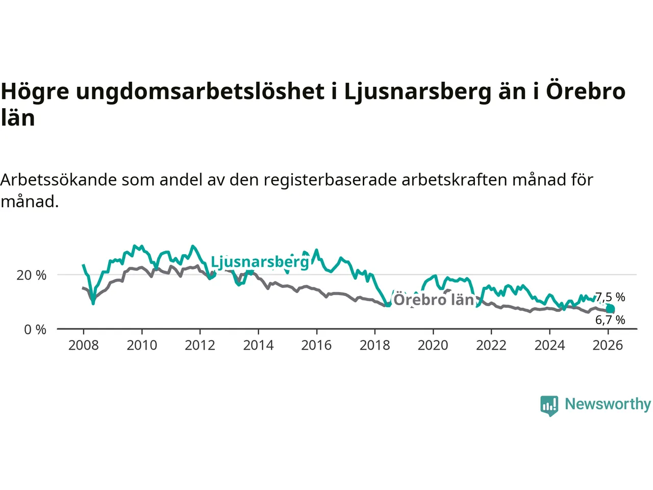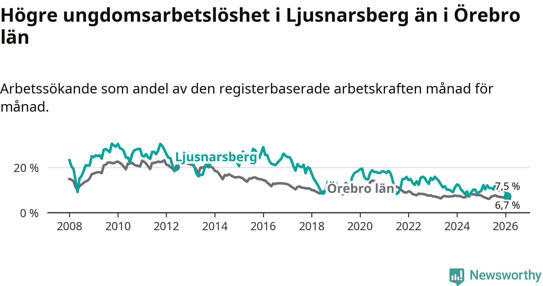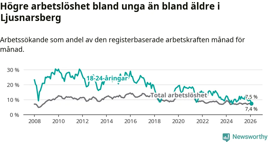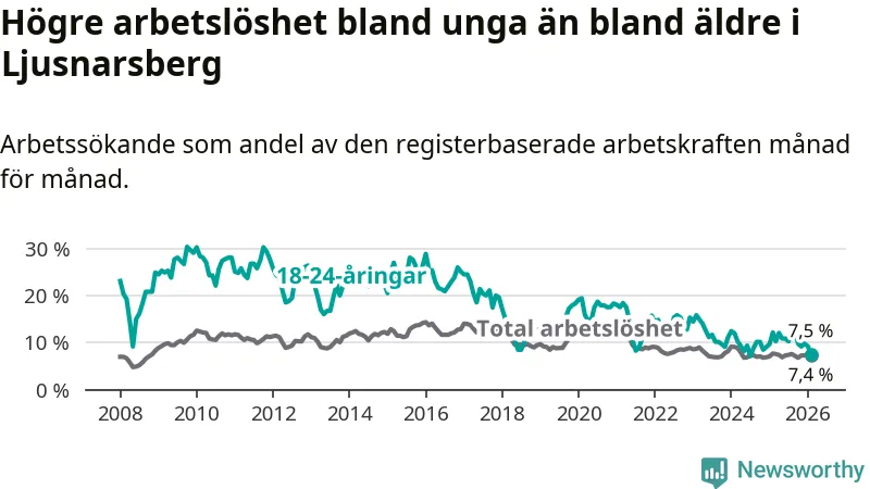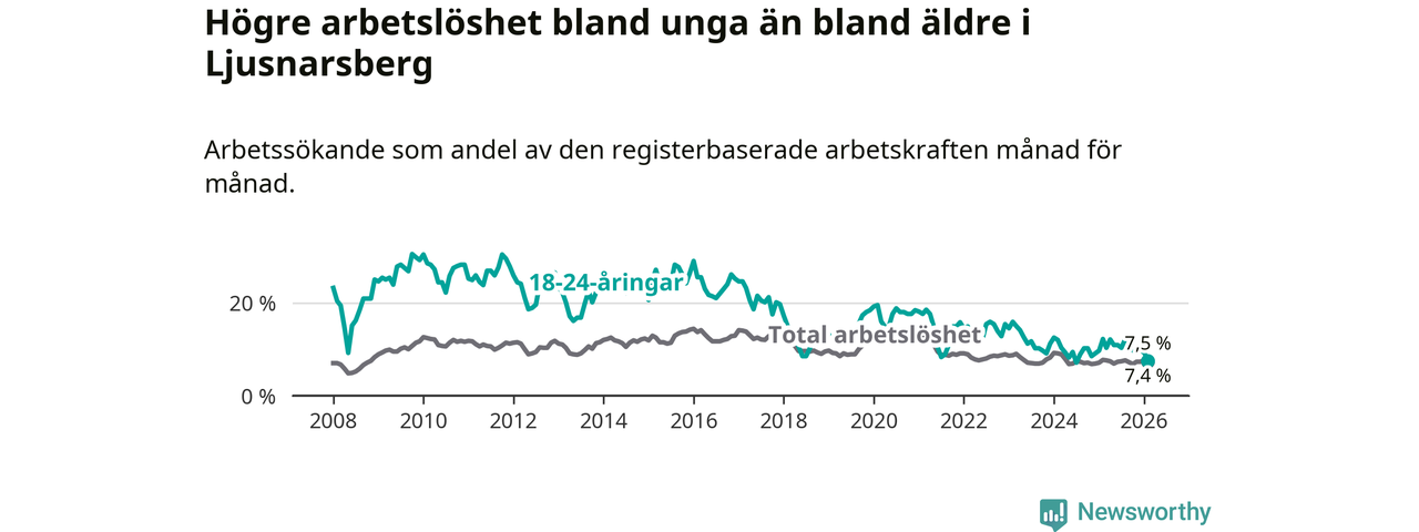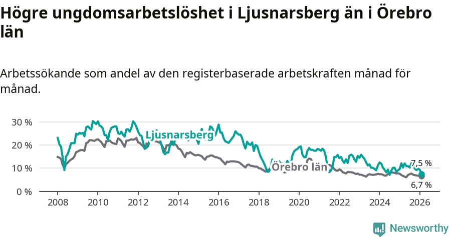 Precis som den totala arbetslösheten ligger ungdomsarbetslösheten i Ljusnarsberg högre än i Örebro som helhet. Skillnaden mellan kommunen och länet är 0,8 procentenheter.