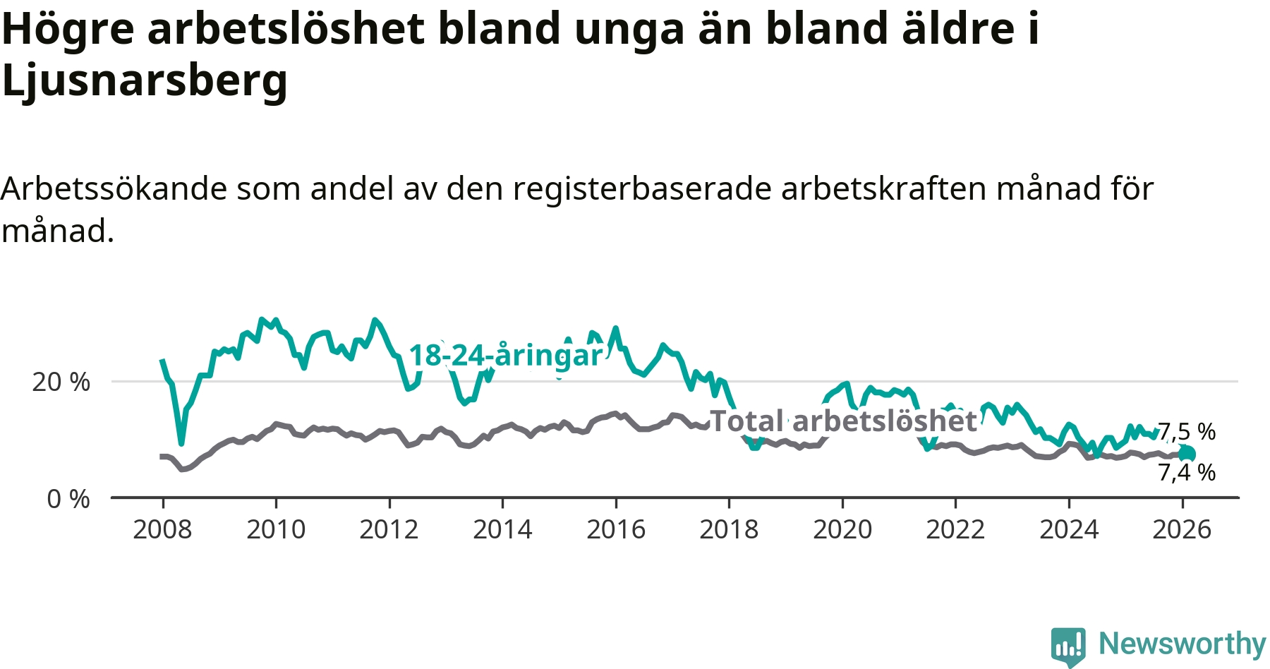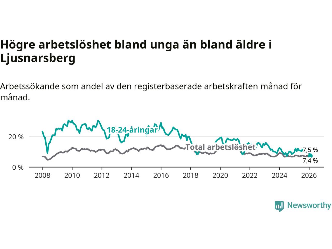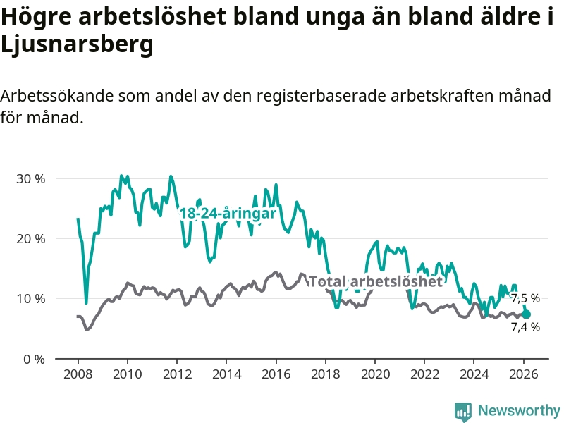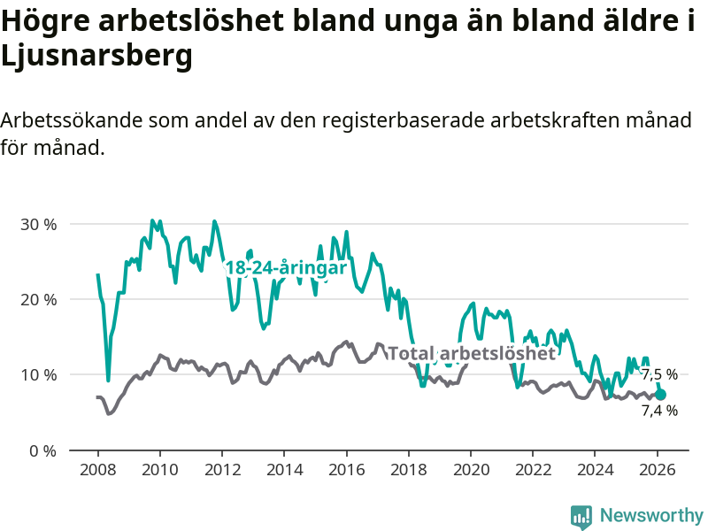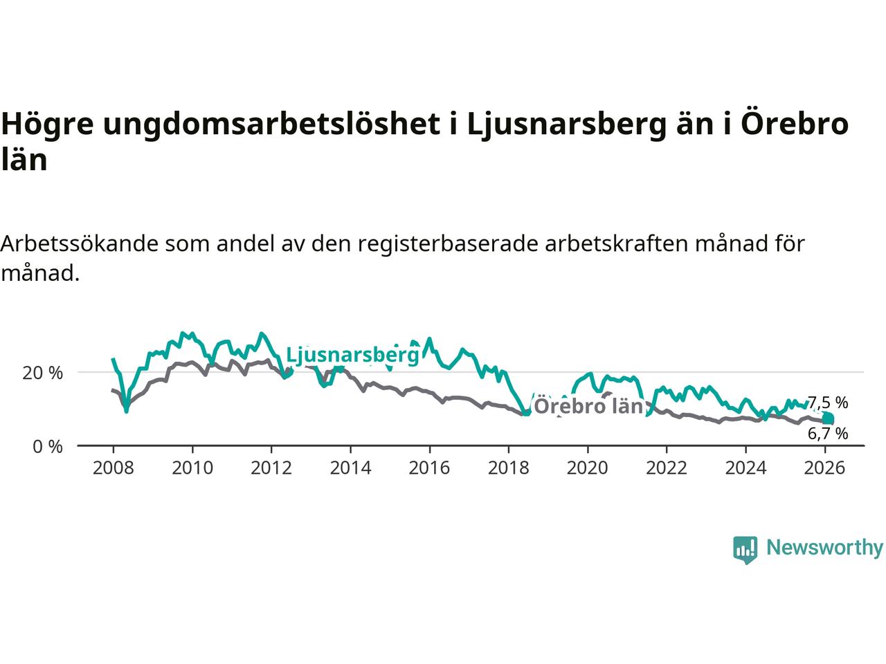Precis som den totala arbetslösheten ligger ungdomsarbetslösheten i Ljusnarsberg högre än i Örebro som helhet. Skillnaden mellan kommunen och länet är 0,8 procentenheter.
