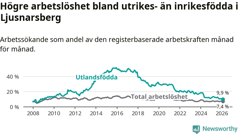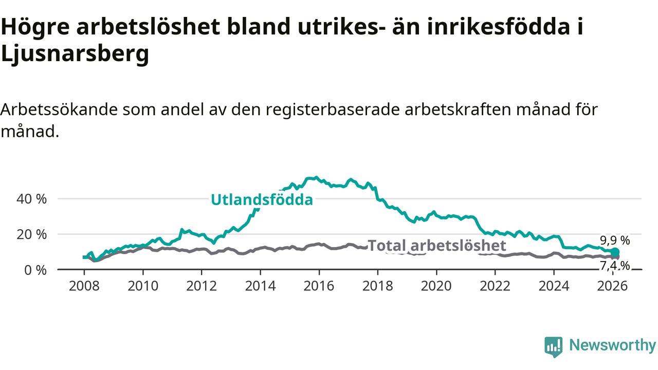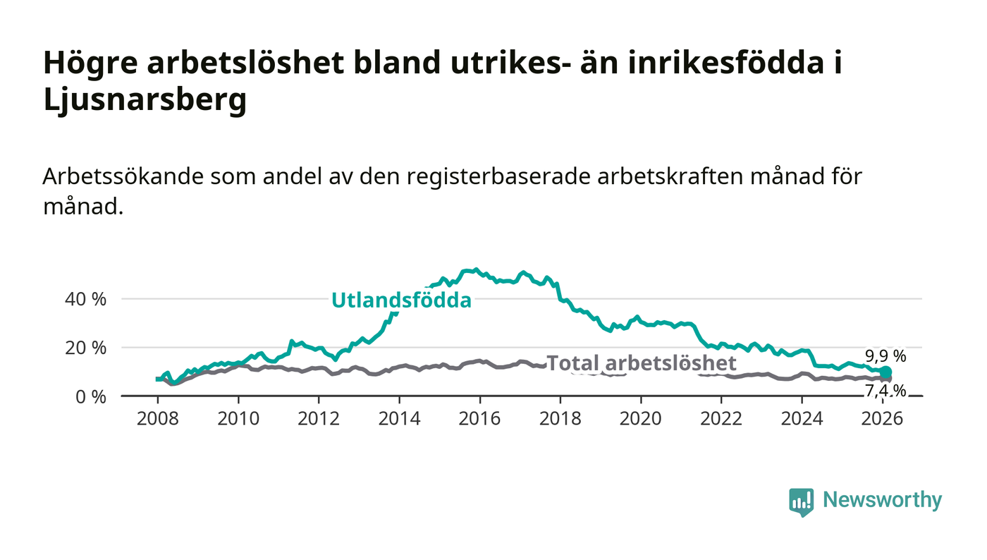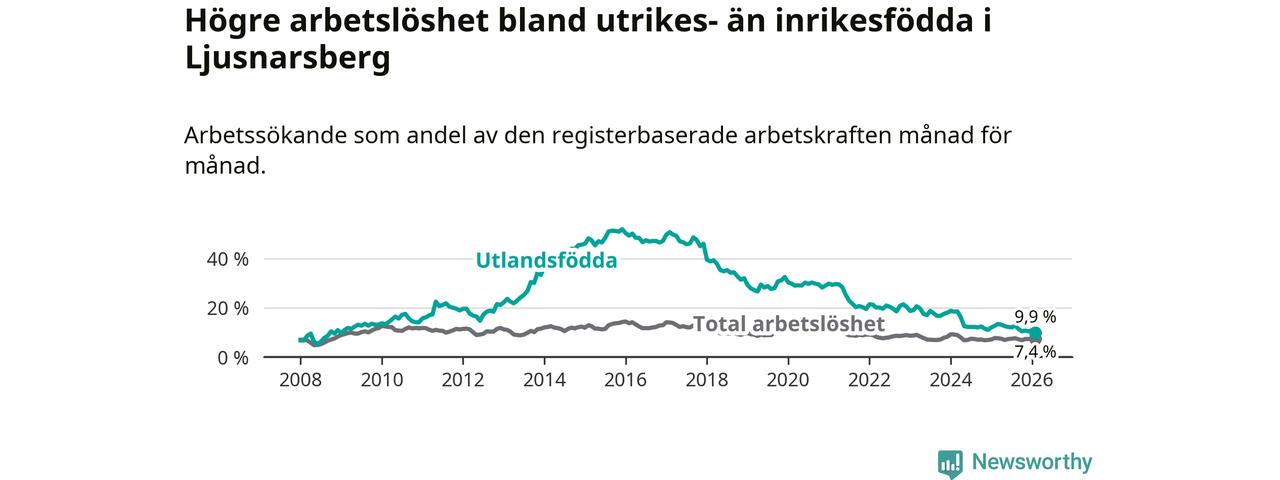 Arbetslösheten bland utlandsfödda var 9,9 procent i Ljusnarsberg under februari månad, motsvarande 31 av 313 personer. Det är 2,8 procentenheter färre än vid samma tidpunkt i fjol (−9 om man räknar personer). Därmed är de utlandsföddas arbetslöshet lägre än vid samma tidpunkt i fjol för sjätte månaden i följd. Sedan augusti 2025 har arbetslösheten bland utlandsfödda minskat från 12,7 till 9,9 procent. Den nuvarande arbetslöshetsnivån är den lägsta sedan januari 2009.