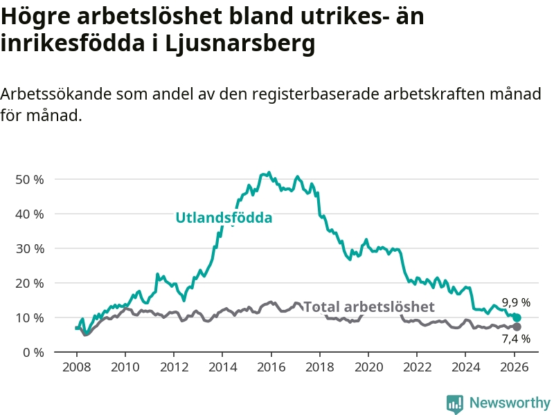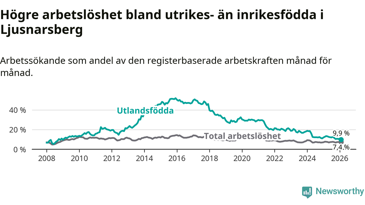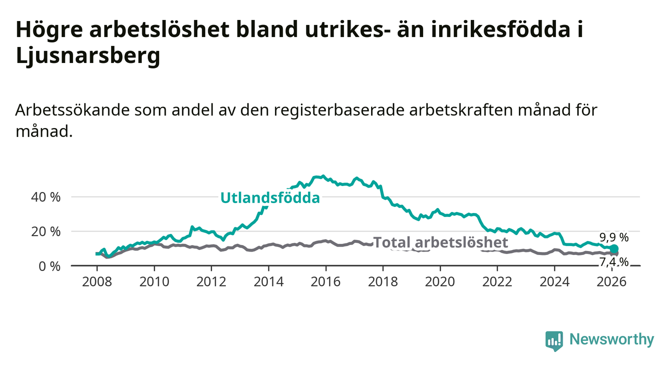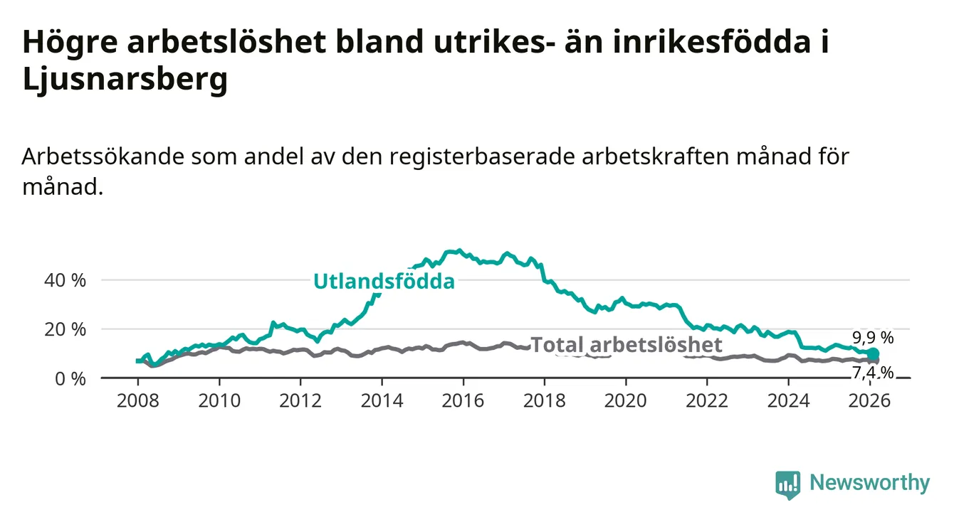 Arbetslösheten bland utlandsfödda var 9,9 procent i Ljusnarsberg under februari månad, motsvarande 31 av 313 personer. Det är 2,8 procentenheter färre än vid samma tidpunkt i fjol (−9 om man räknar personer). Därmed är de utlandsföddas arbetslöshet lägre än vid samma tidpunkt i fjol för sjätte månaden i följd. Sedan augusti 2025 har arbetslösheten bland utlandsfödda minskat från 12,7 till 9,9 procent. Den nuvarande arbetslöshetsnivån är den lägsta sedan januari 2009.