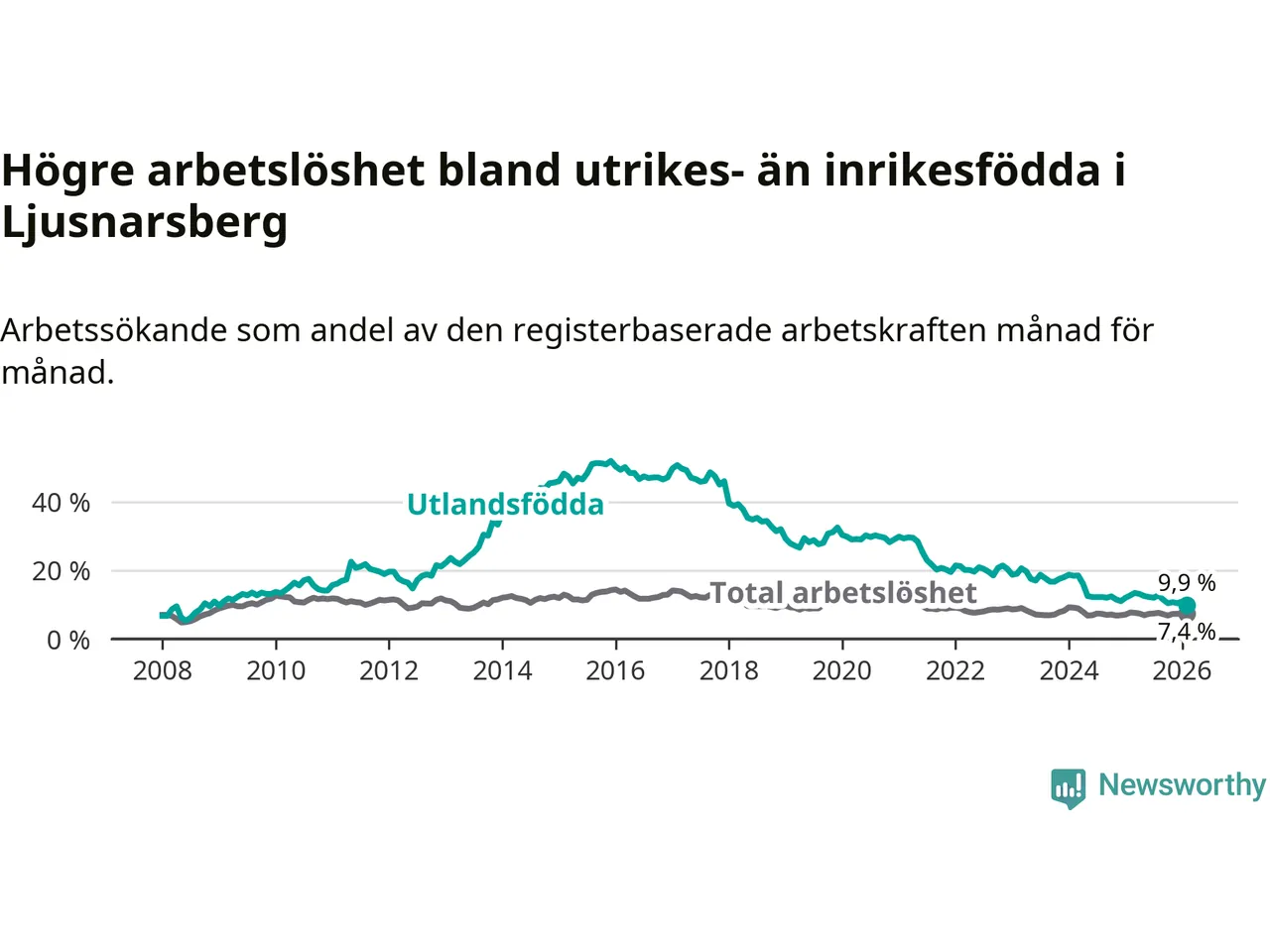 Skillnaden i arbetslöshet mellan utrikesfödda och hela befolkningen är 2,5 procentenheter i Ljusnarsberg. Det är en betydligt mindre skillnad än för ett år sedan (−2,5 procentenheter).
