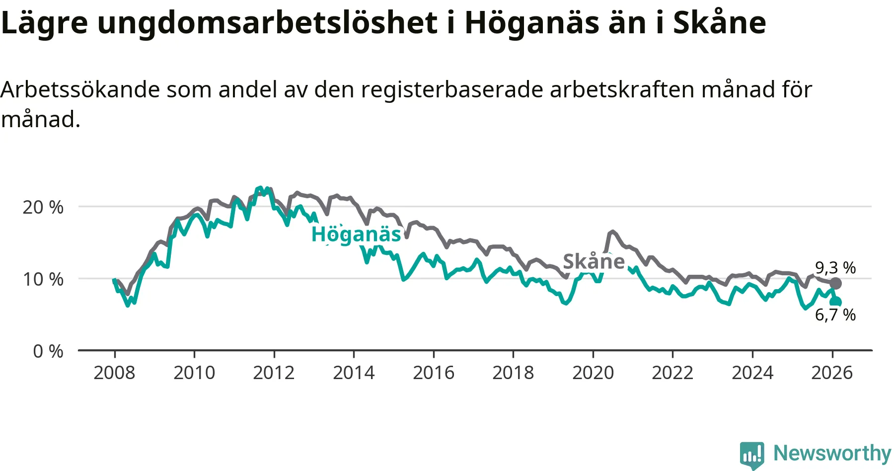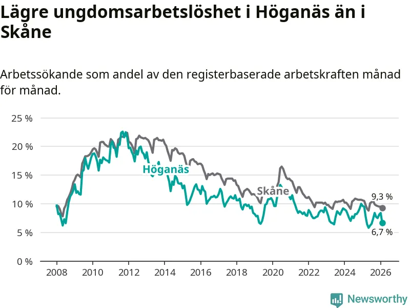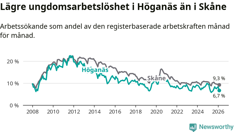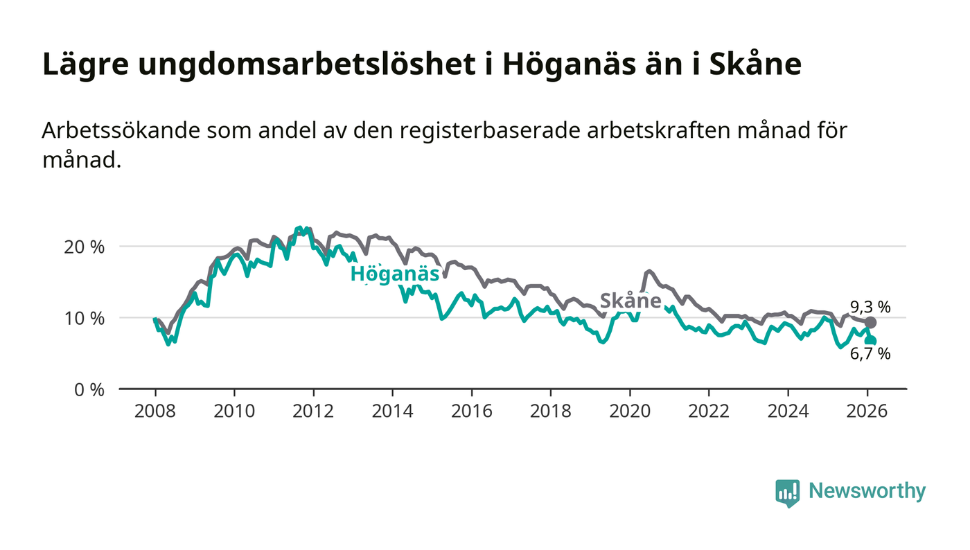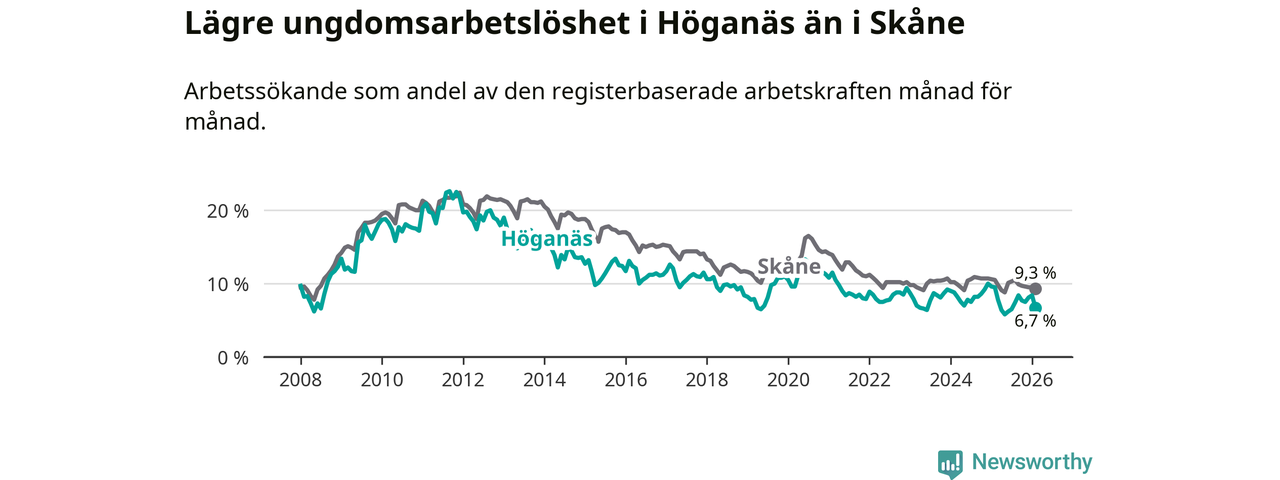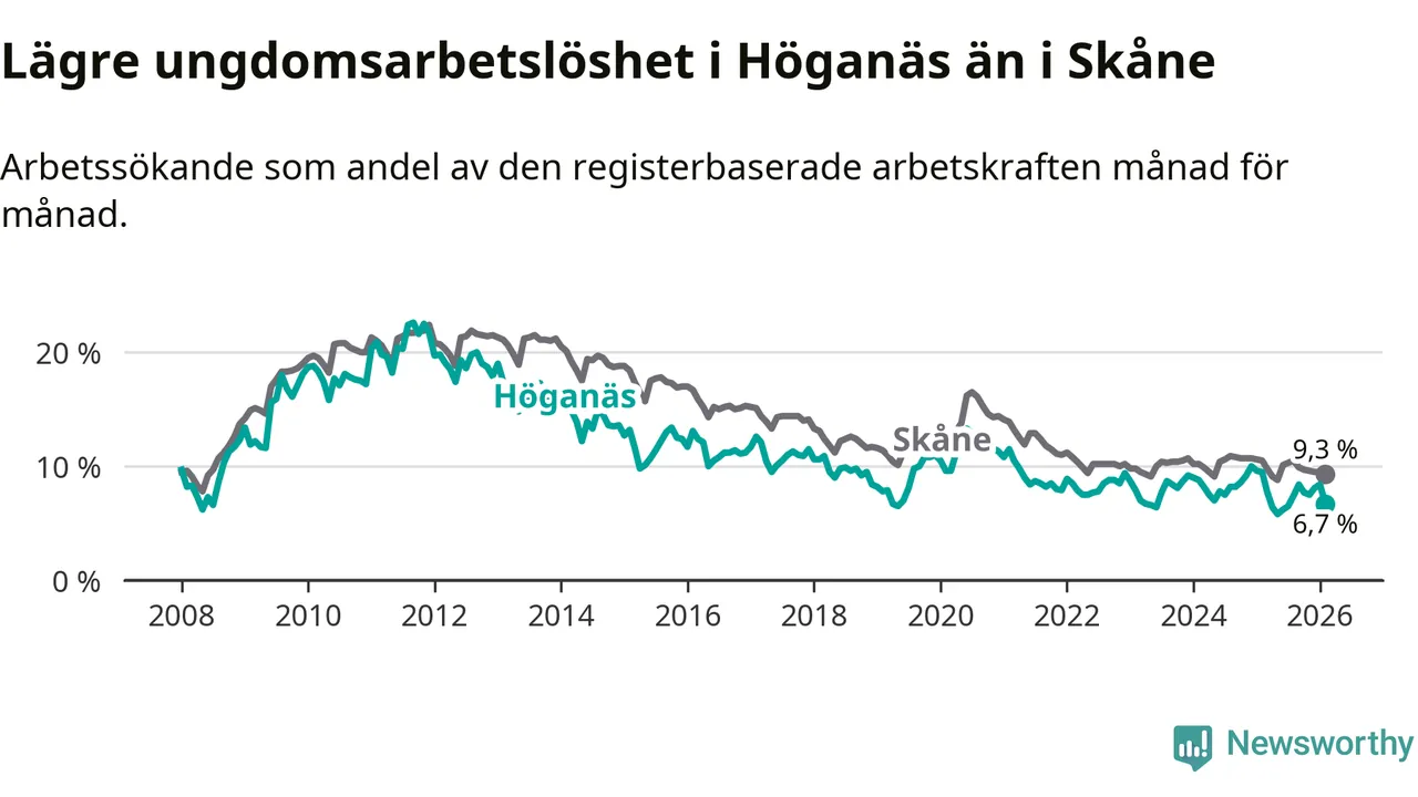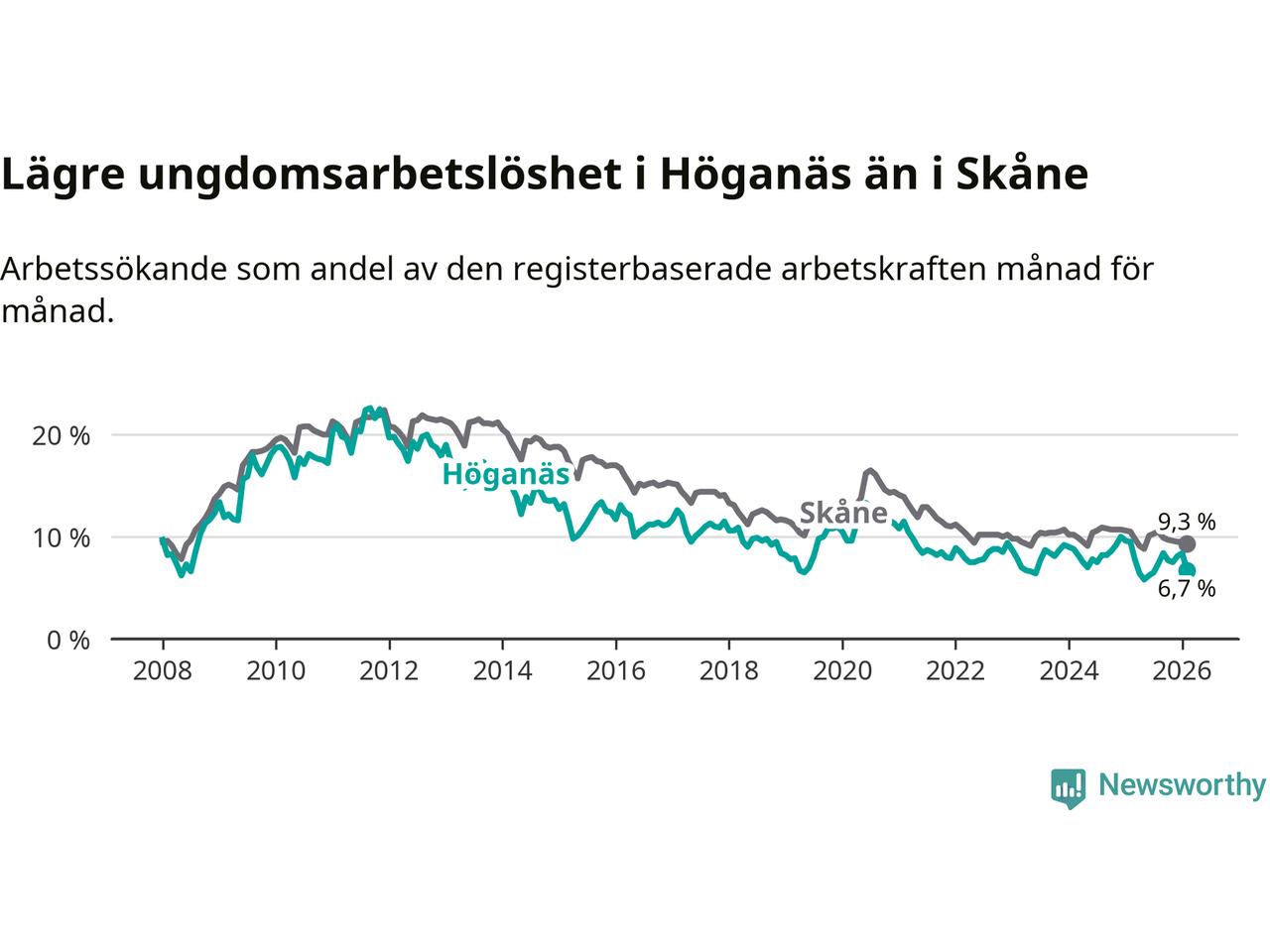 Precis som den totala arbetslösheten ligger ungdomsarbetslösheten i Höganäs lägre än i Skåne som helhet. Skillnaden mellan kommunen och länet är 2,6 procentenheter.