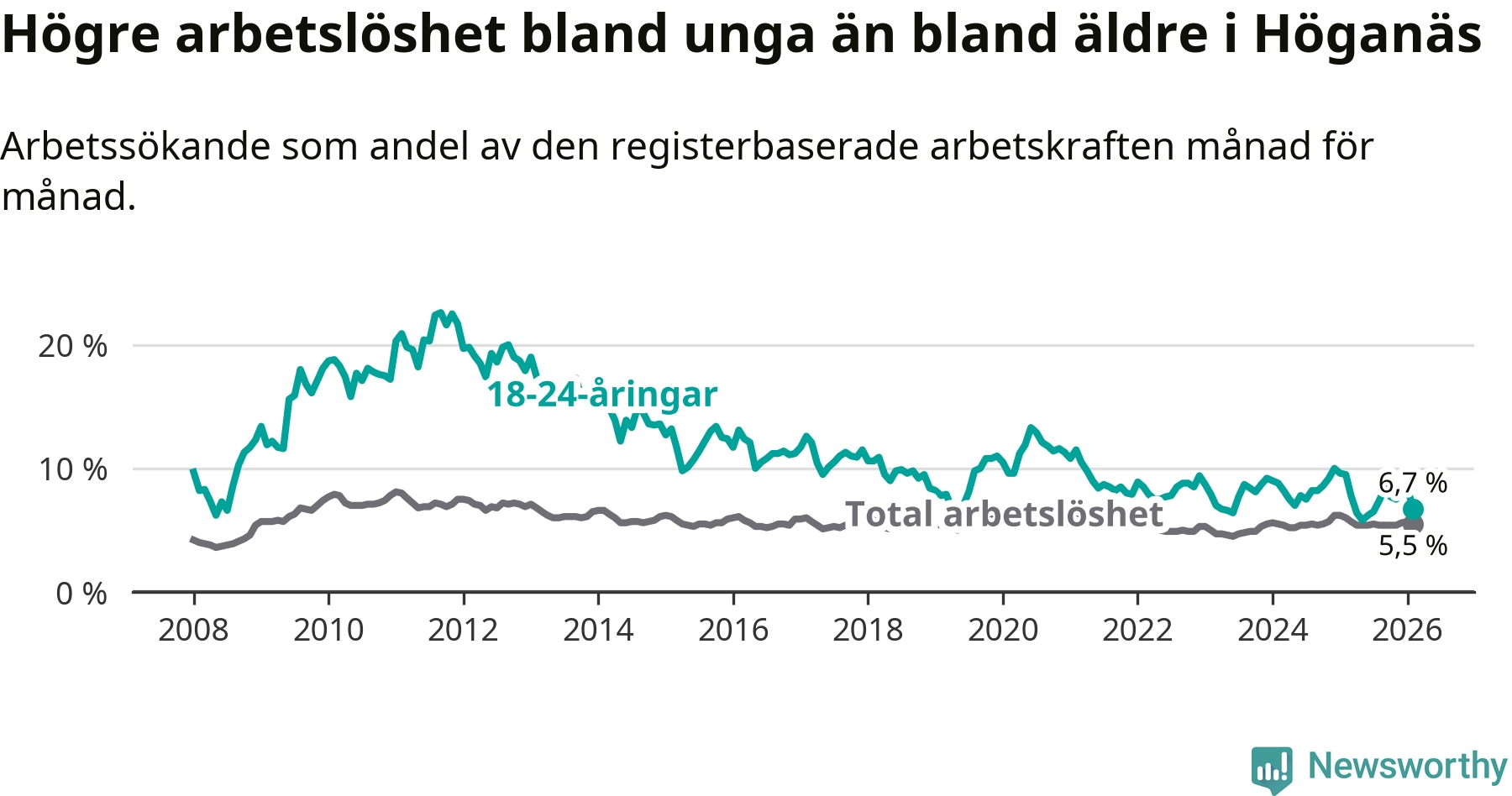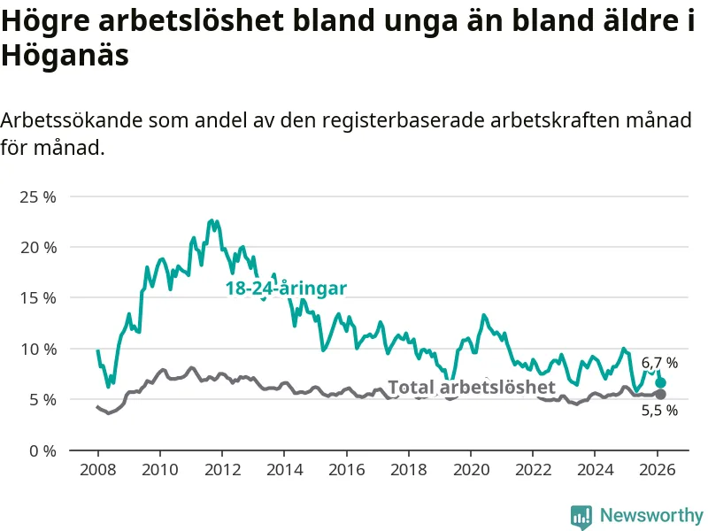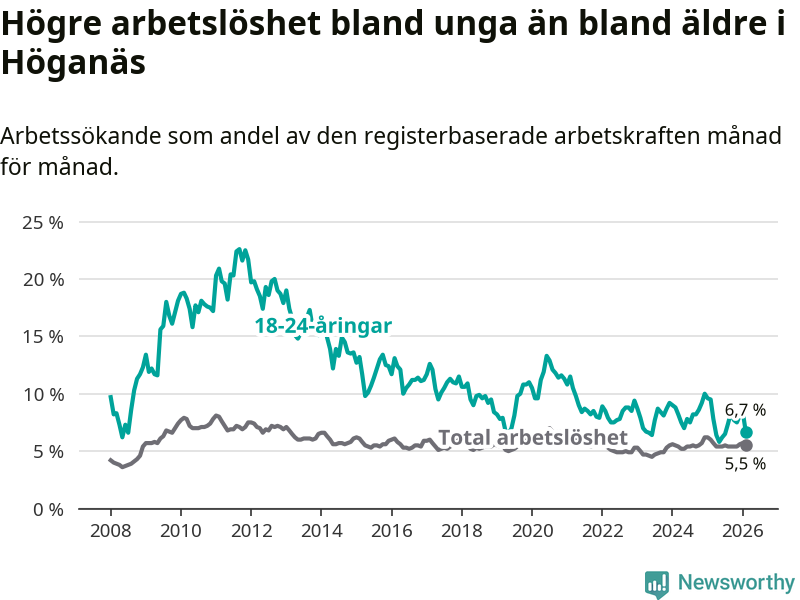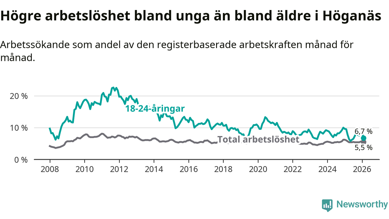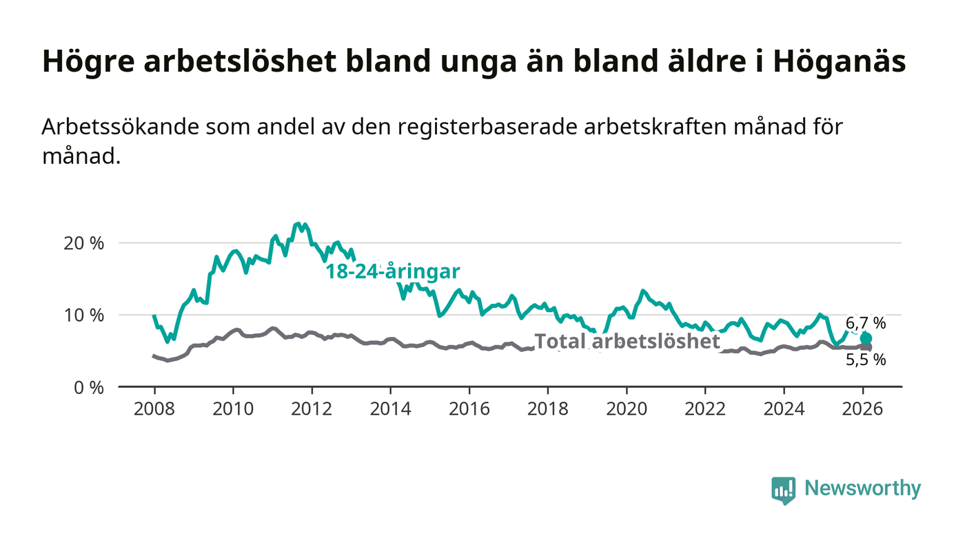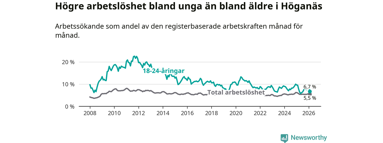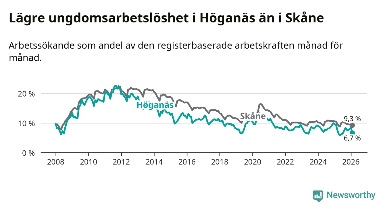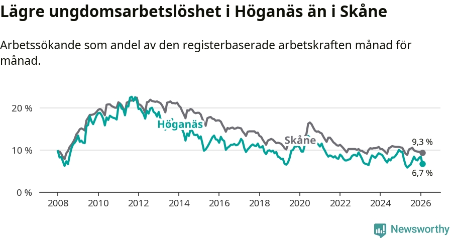 Precis som den totala arbetslösheten ligger ungdomsarbetslösheten i Höganäs lägre än i Skåne som helhet. Skillnaden mellan kommunen och länet är 2,6 procentenheter.