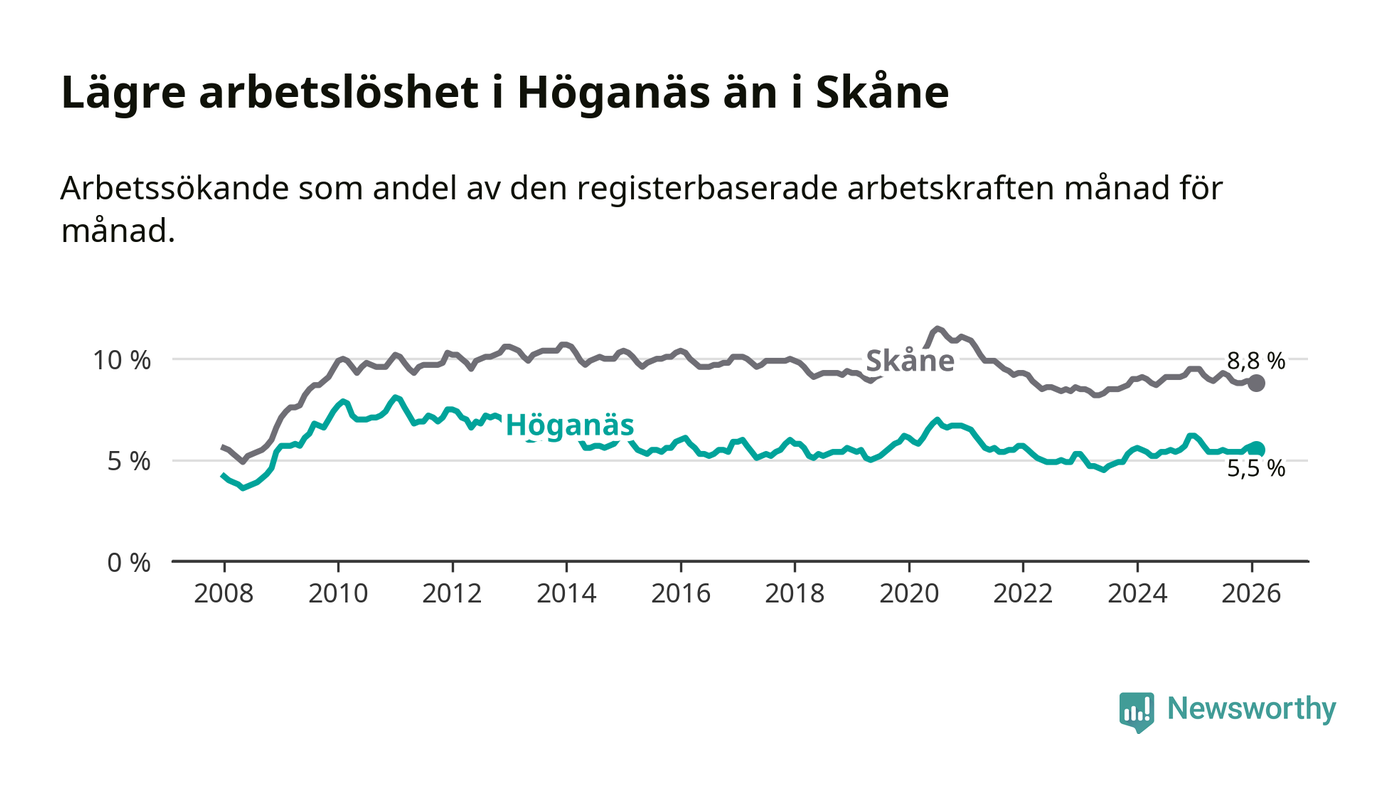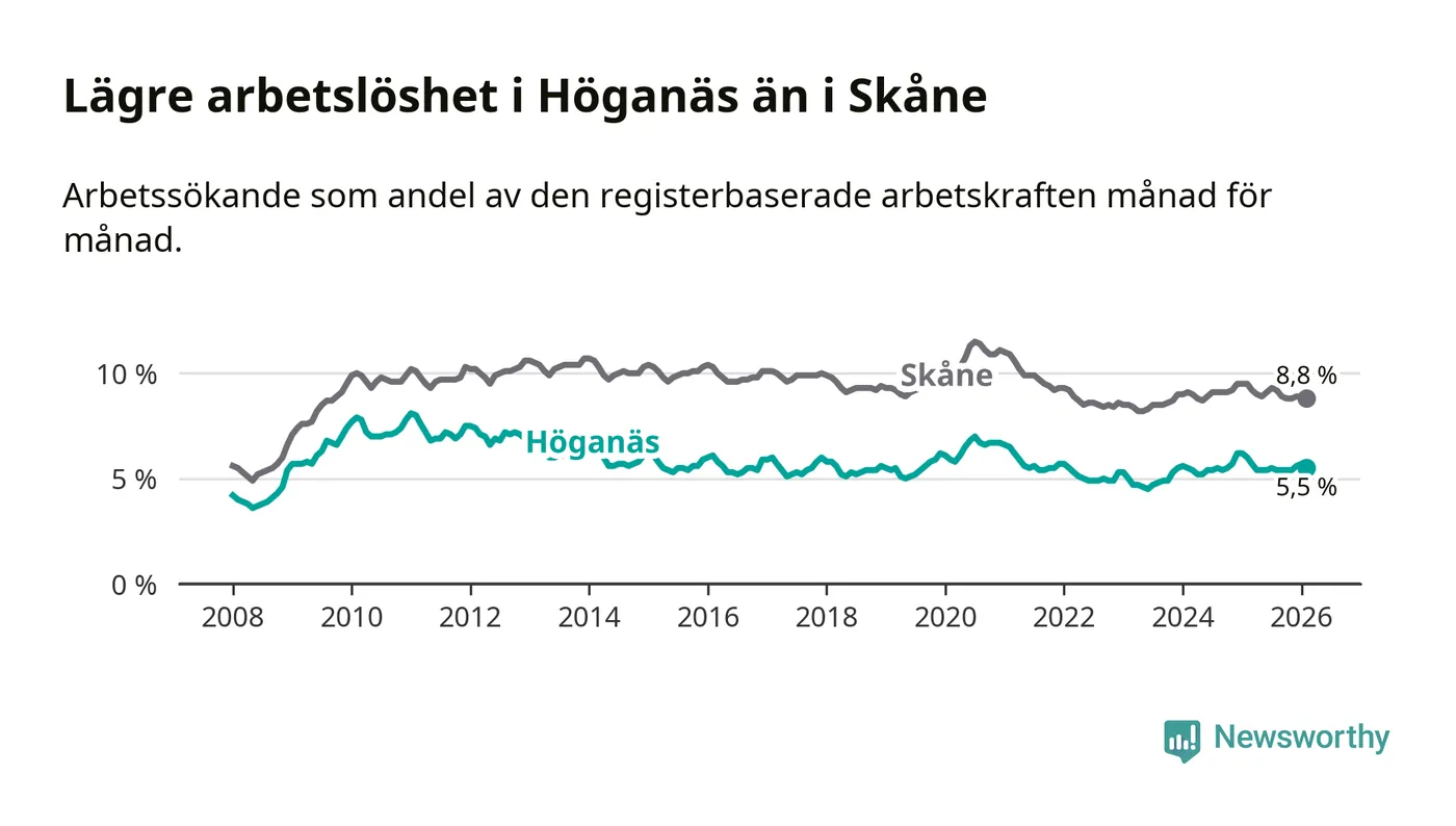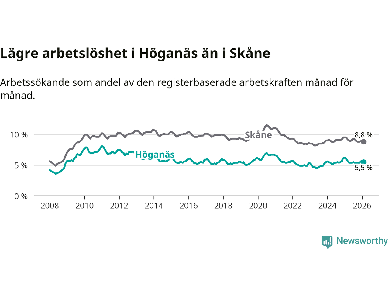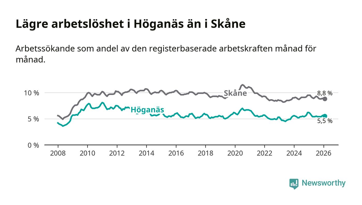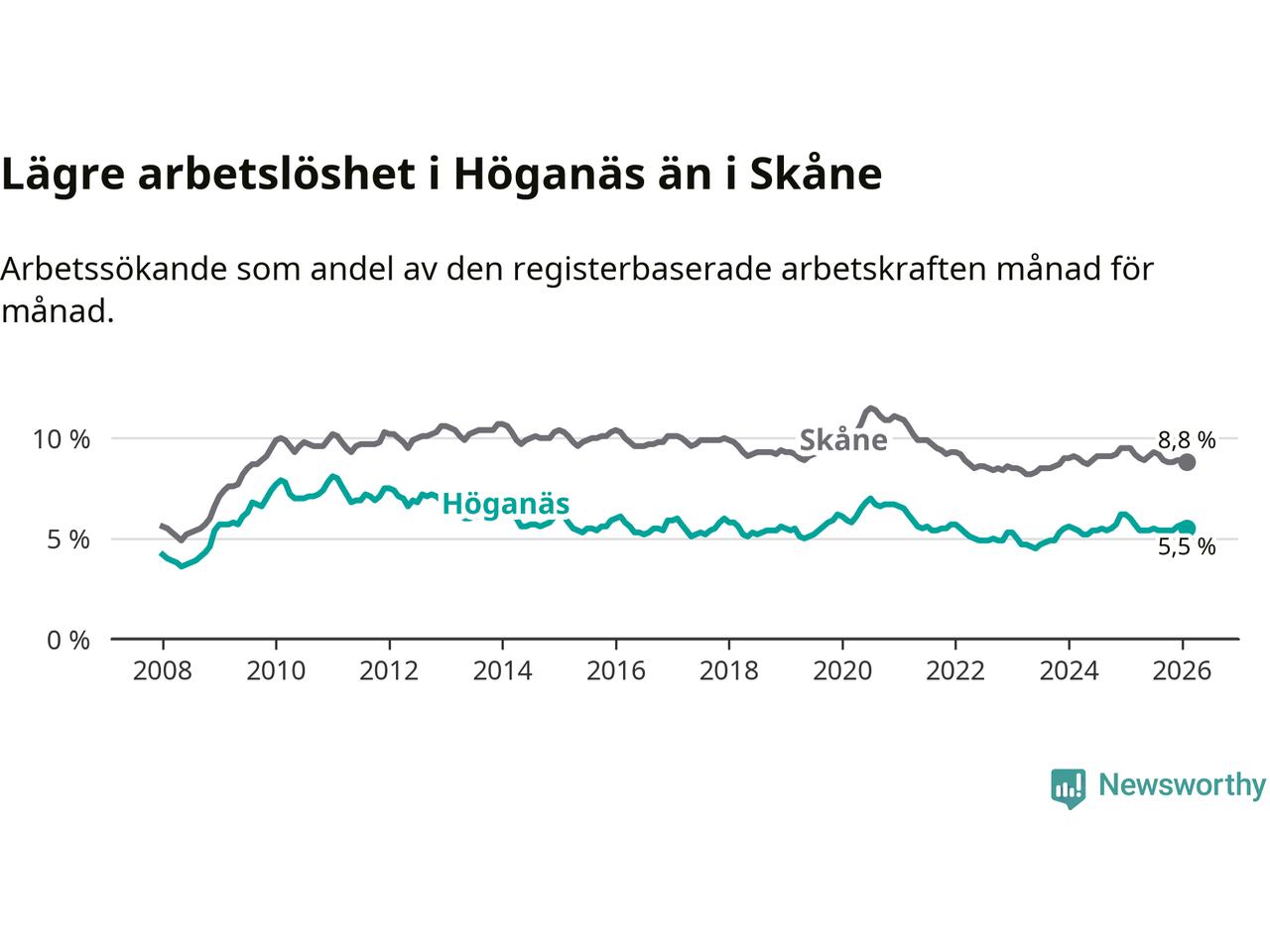 Höganäs hade redan tidigare lägre arbetslöshet än snittet i hela Skåne län och nu växer klyftan (5,5 procent i kommunen, jämfört med 8,8 procent i hela länet). Lomma har den lägsta arbetslösheten i länet (3,8 procent), medan Perstorp har den högsta (13,2 procent). För att Höganäs skulle komma ner i samma arbetslöshetsnivå som Lomma skulle 219 personer behöva sysselsättas.