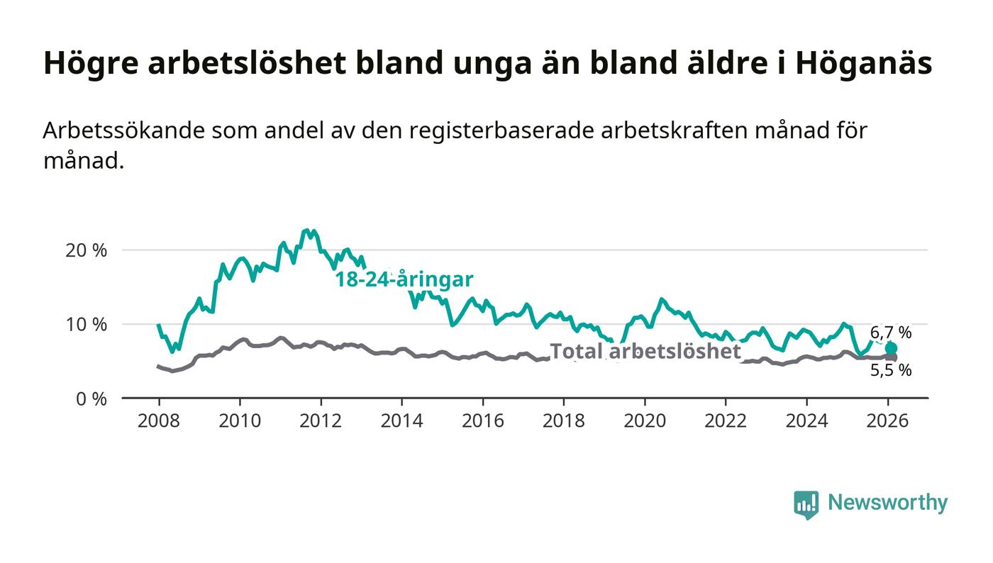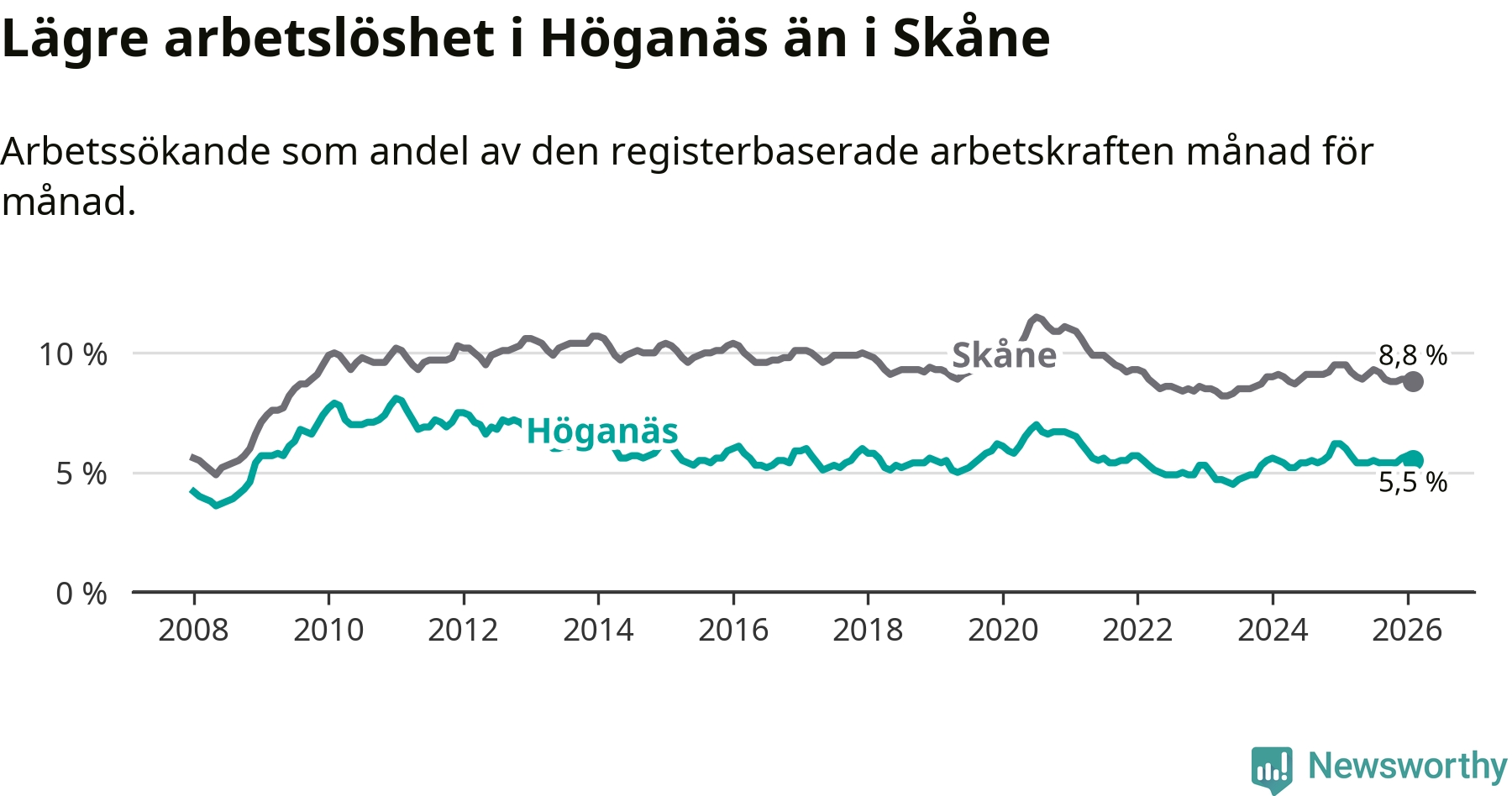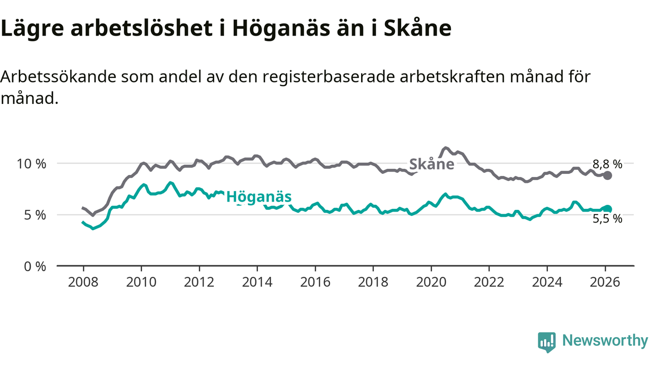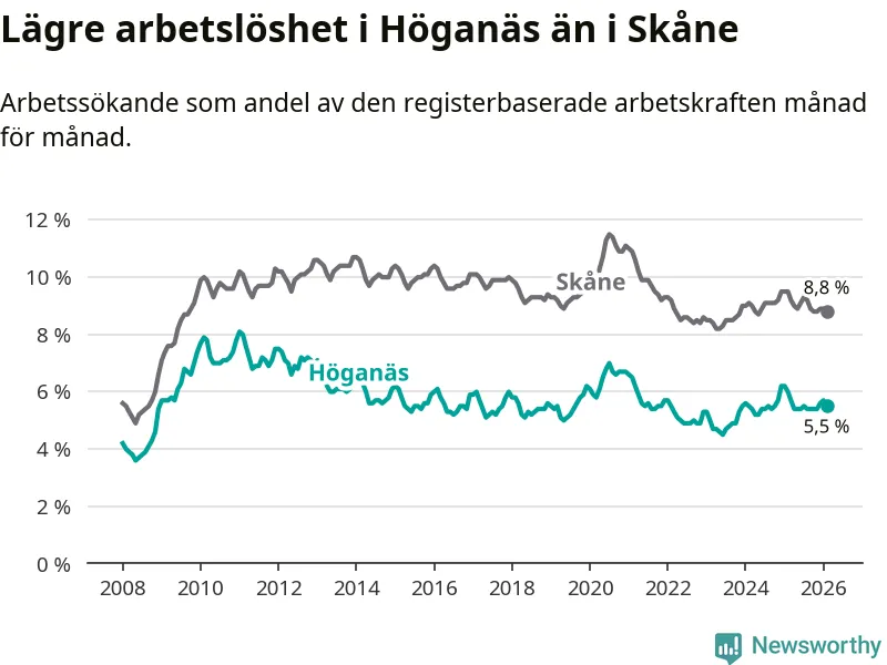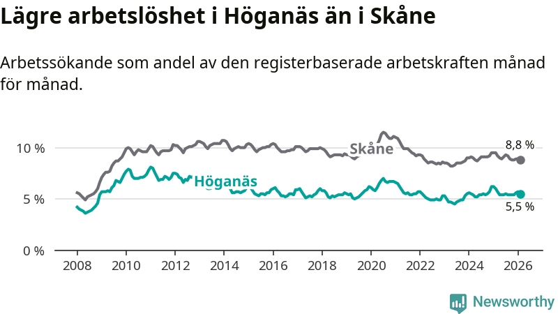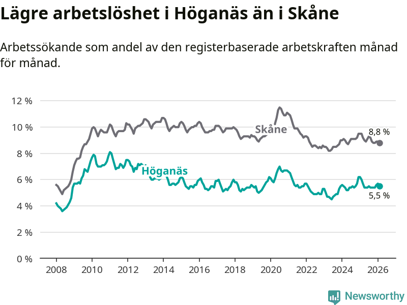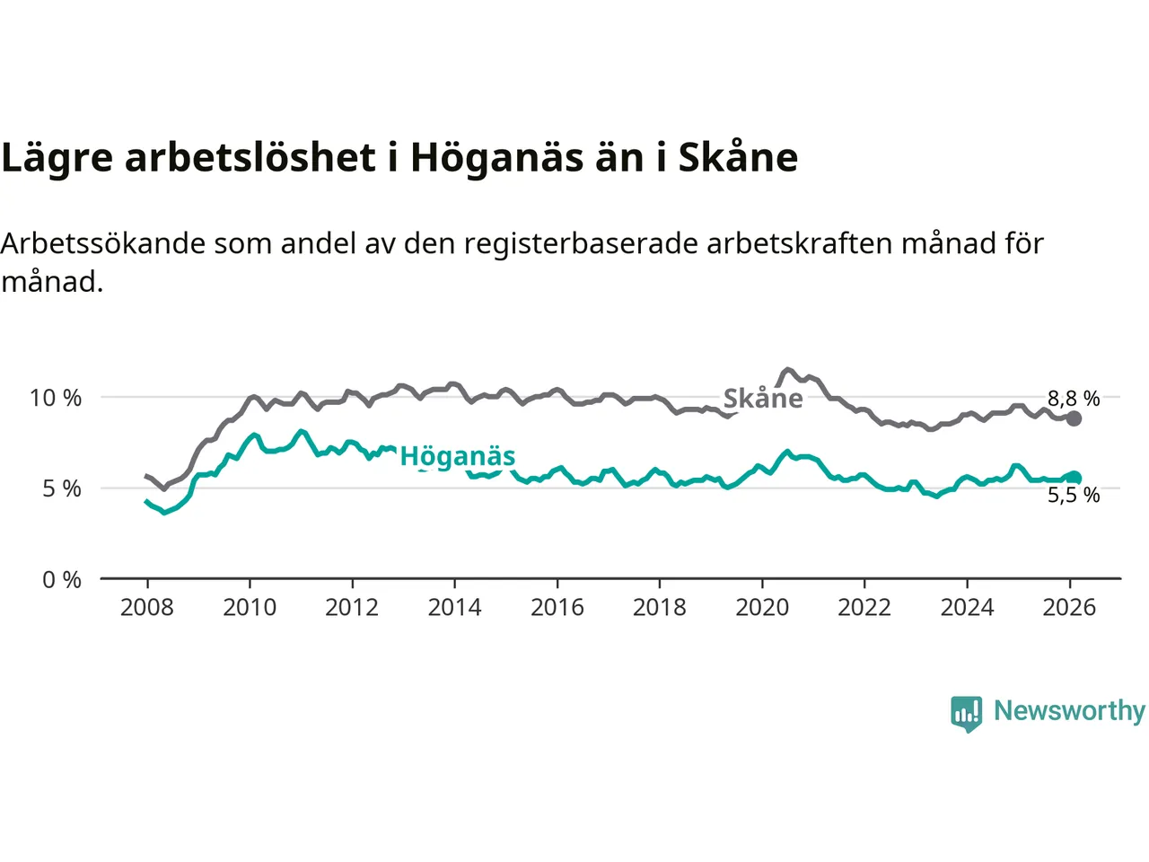 Höganäs hade redan tidigare lägre arbetslöshet än snittet i hela Skåne län och nu växer klyftan (5,5 procent i kommunen, jämfört med 8,8 procent i hela länet). Lomma har den lägsta arbetslösheten i länet (3,8 procent), medan Perstorp har den högsta (13,2 procent). För att Höganäs skulle komma ner i samma arbetslöshetsnivå som Lomma skulle 219 personer behöva sysselsättas.