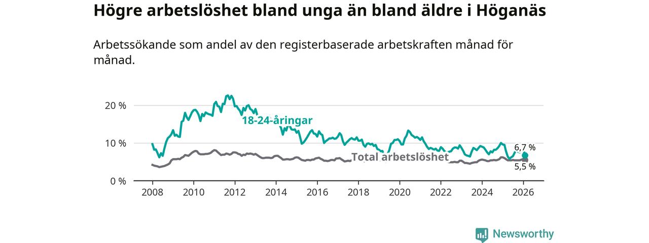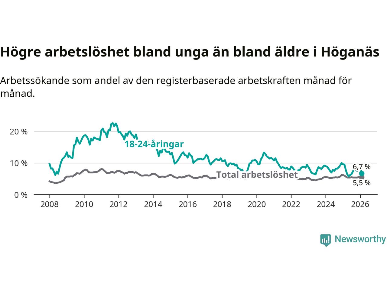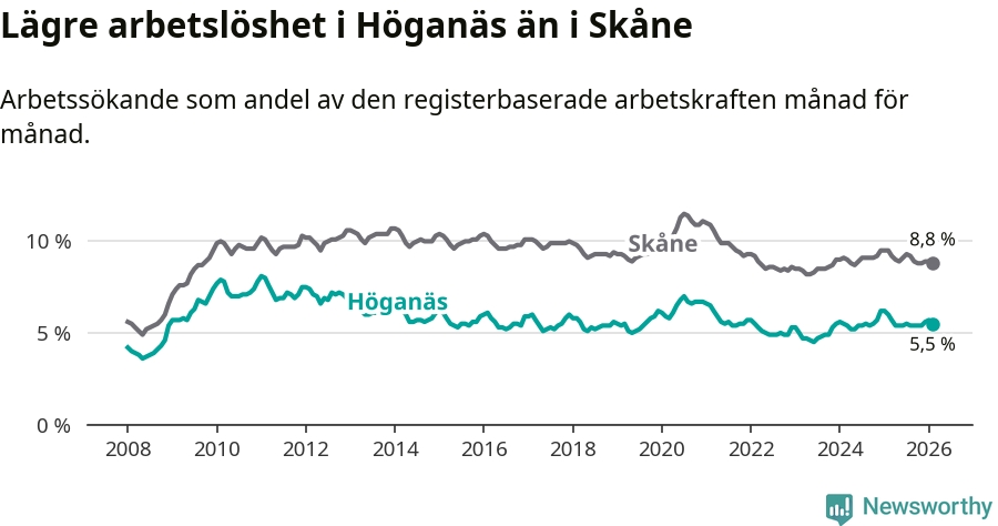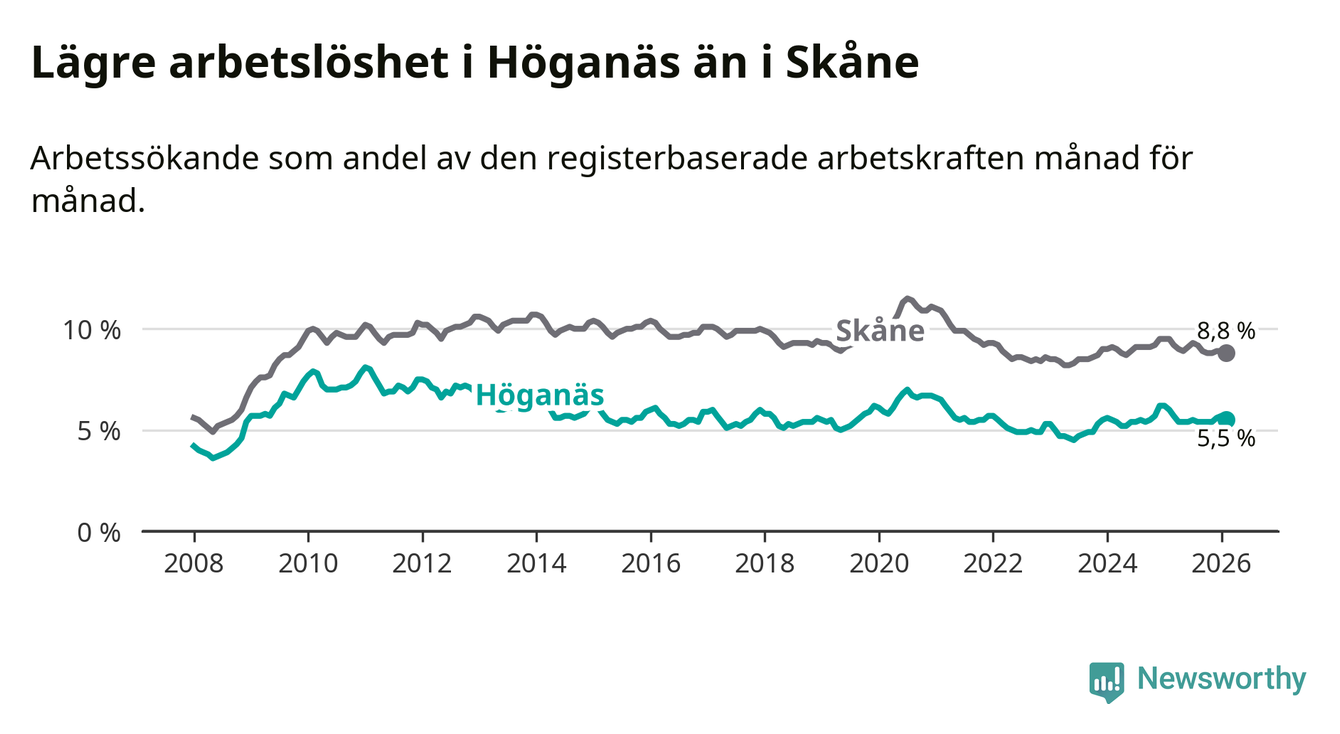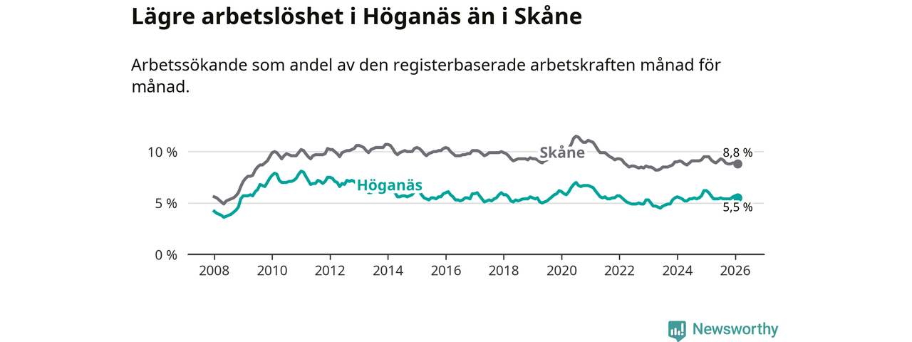 Under februari månad rapporterade Höganäs kommun en total arbetslöshet på 5,5 procent. Det är en minskning jämfört med samma tidpunkt i fjol (−0,5 procentenheter). Även i Skåne län sjunker arbetslösheten .