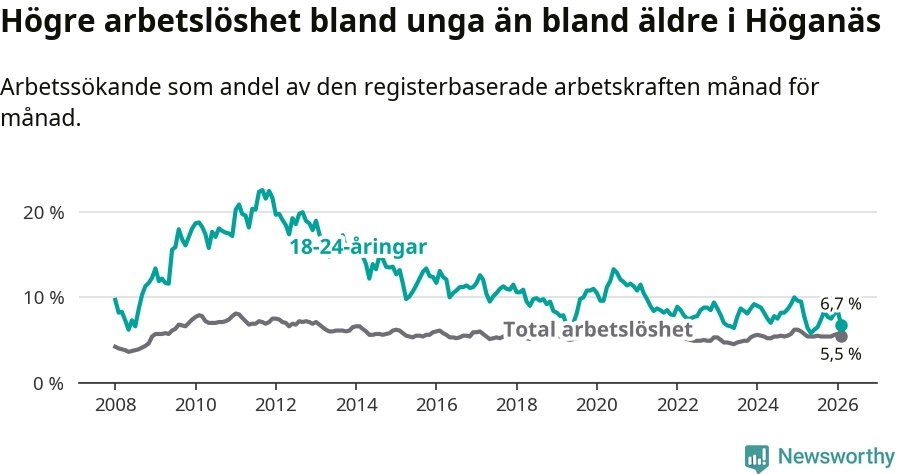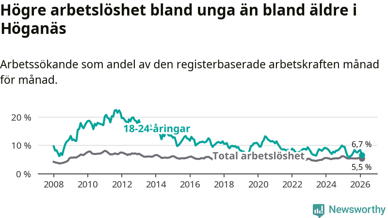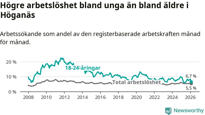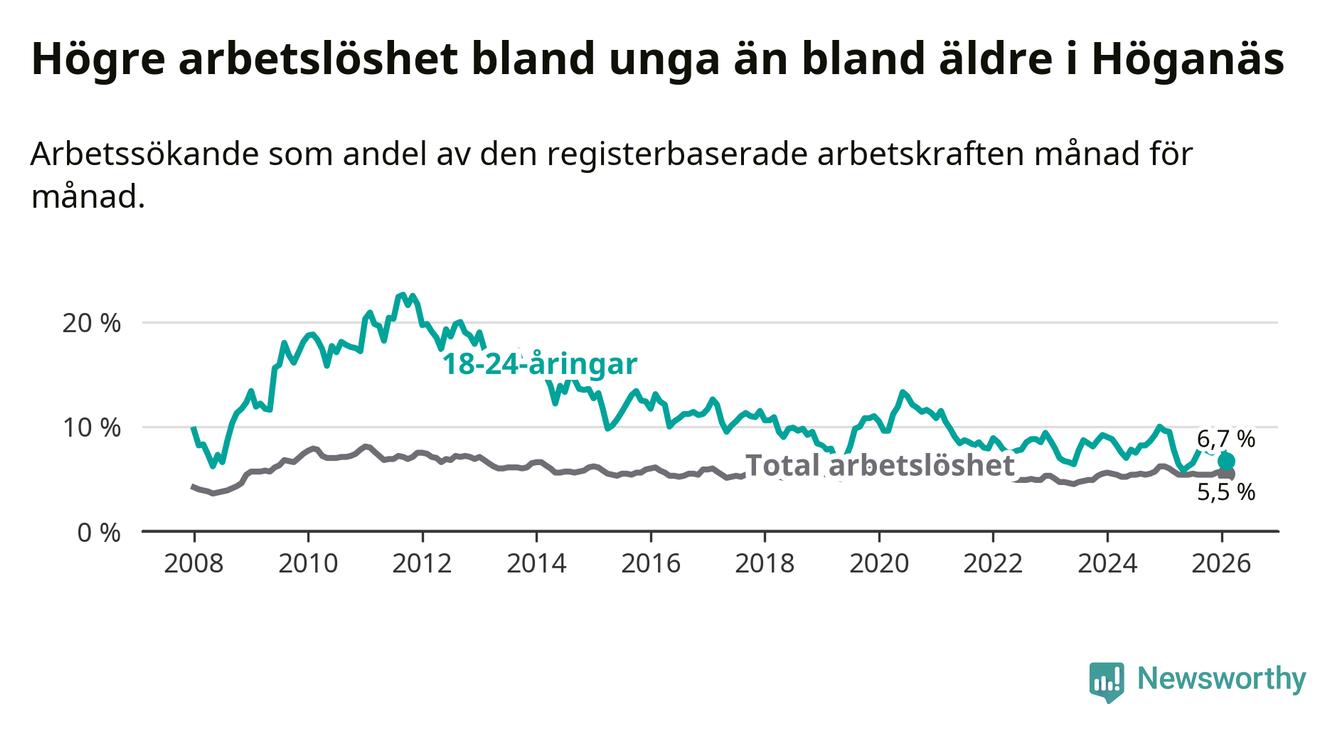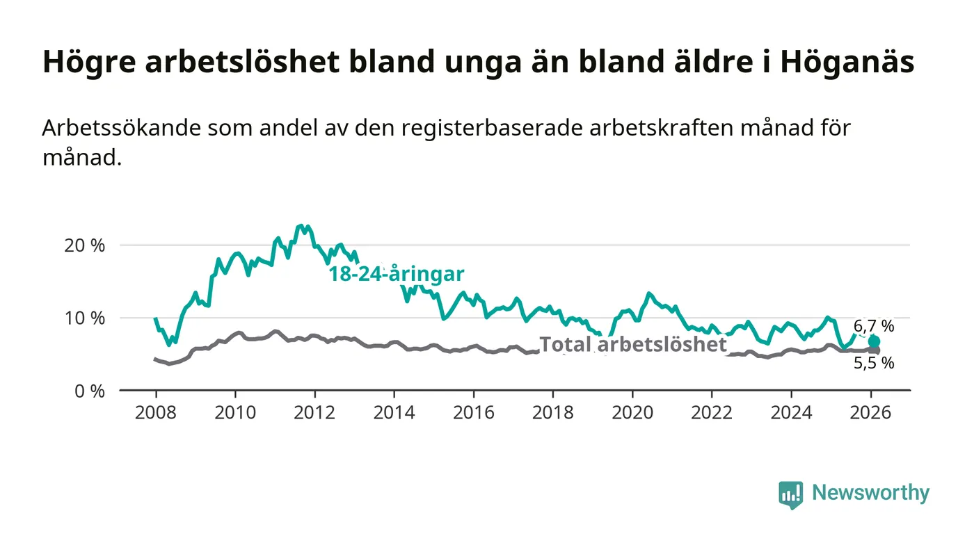 Under februari månad rapporterade Höganäs kommun en total arbetslöshet på 5,5 procent. Det är en minskning jämfört med samma tidpunkt i fjol (−0,5 procentenheter). Även i Skåne län sjunker arbetslösheten .
