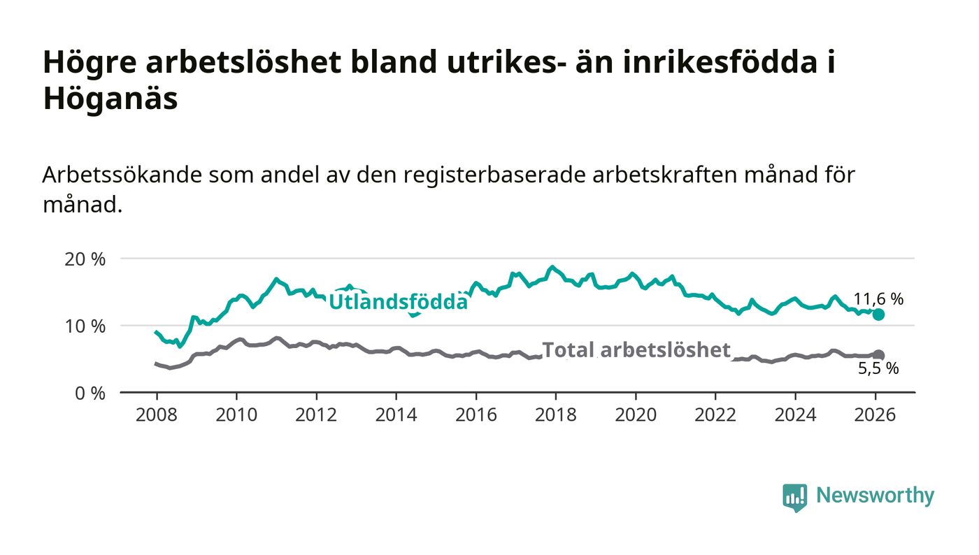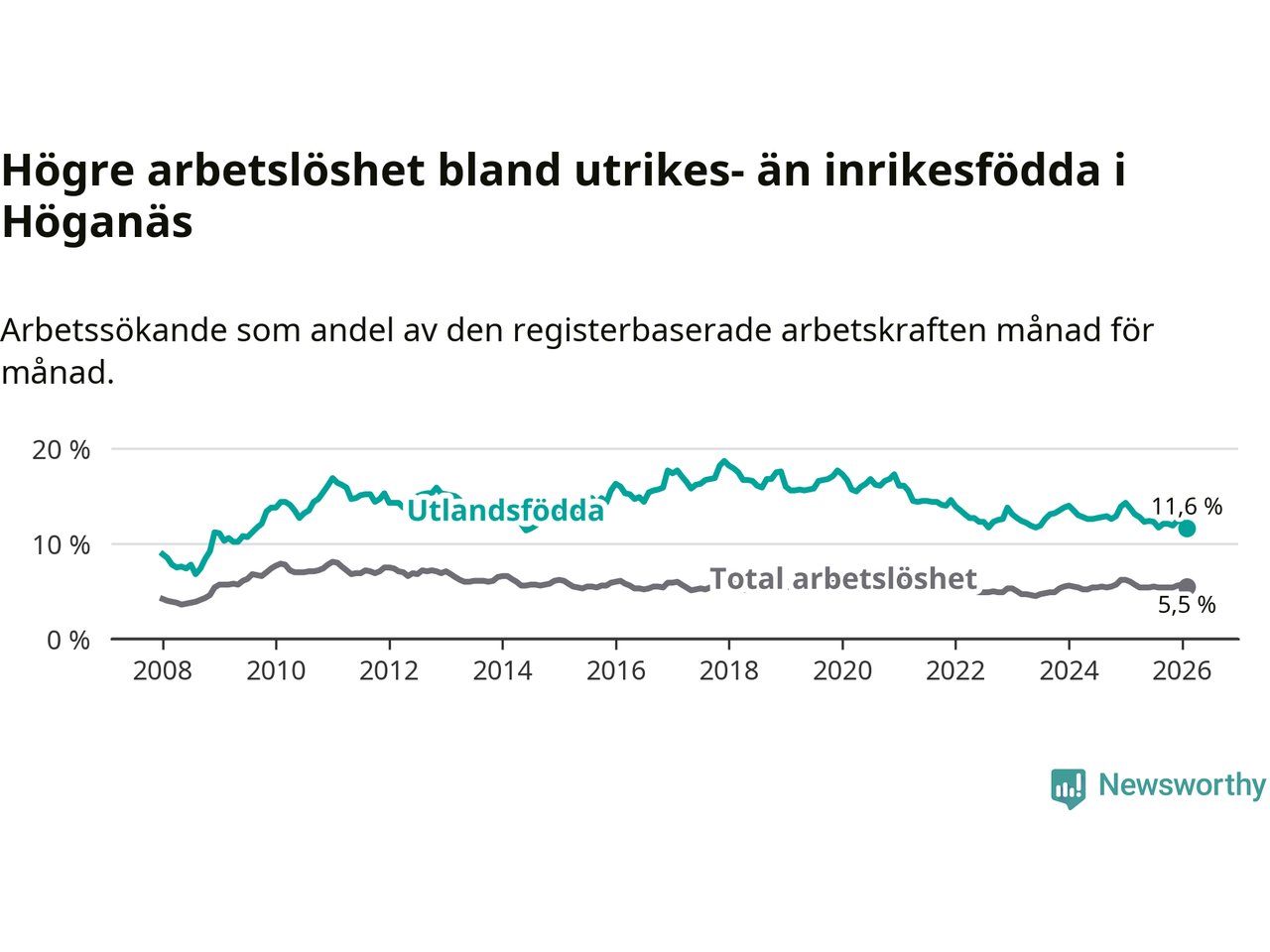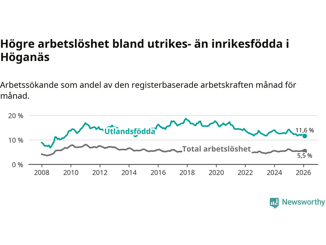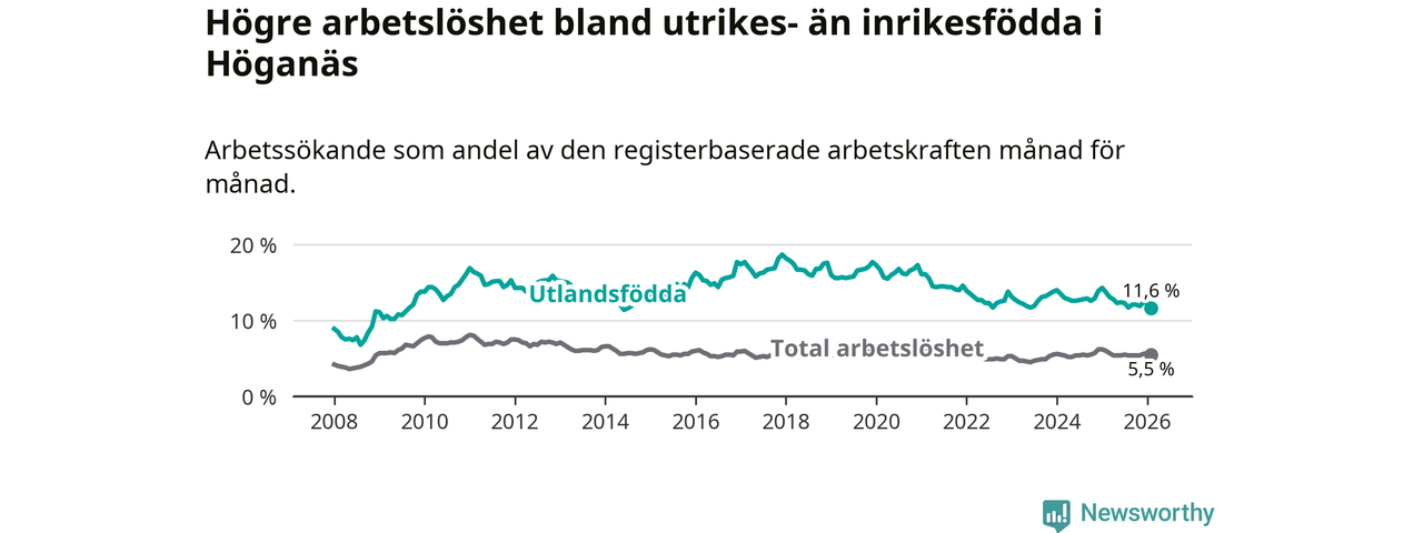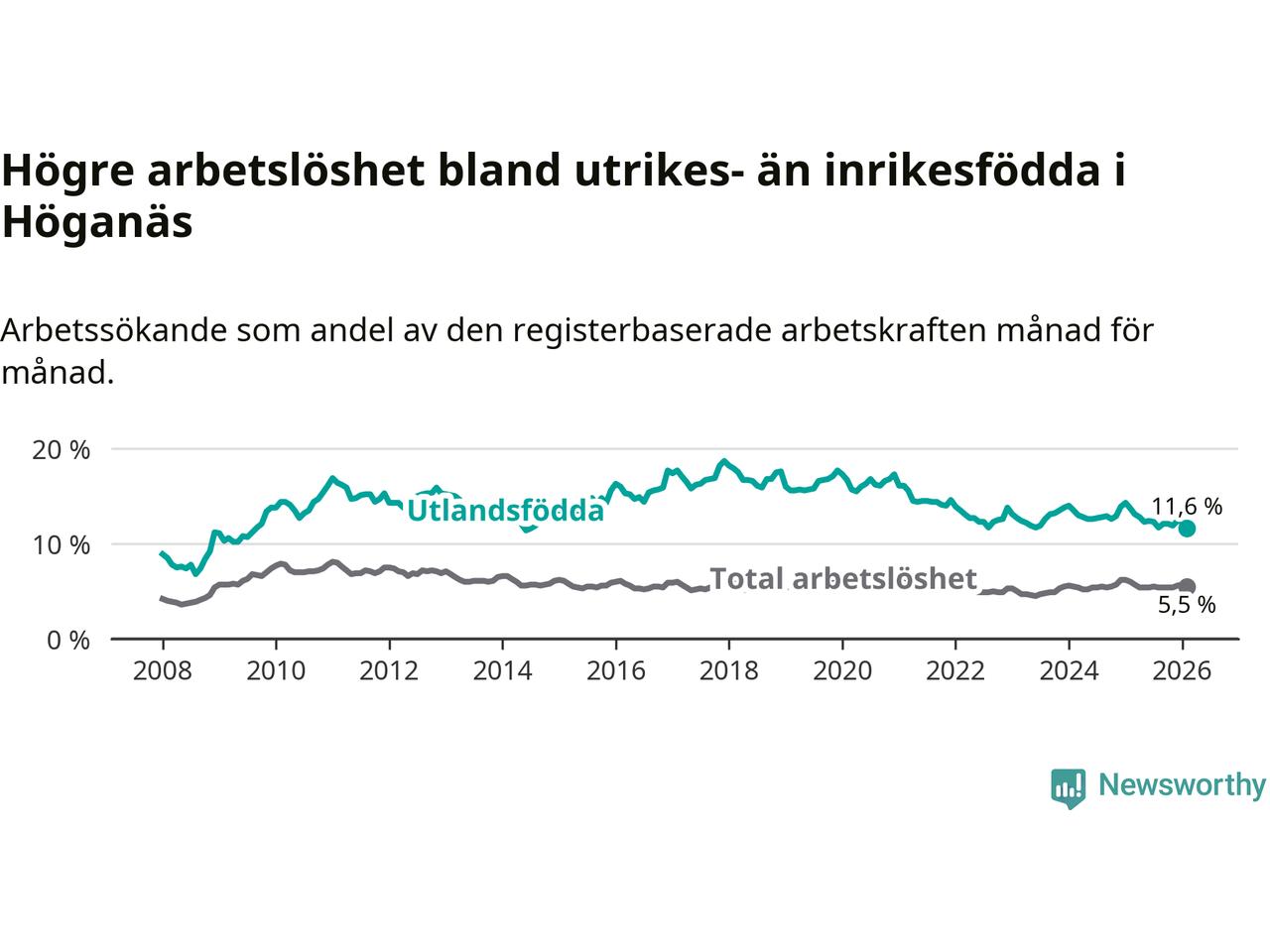 Arbetslösheten bland utlandsfödda var 11,6 procent i Höganäs under februari månad, motsvarande 256 av 2 207 personer. Det är 2,1 procentenheter färre än vid samma tidpunkt i fjol (−39 om man räknar personer). Därmed är de utlandsföddas arbetslöshet lägre än vid samma tidpunkt i fjol för tionde månaden i följd. Sedan april 2025 har arbetslösheten bland utlandsfödda minskat från 12,8 till 11,6 procent. Den nuvarande arbetslöshetsnivån är den lägsta sedan juli 2014.