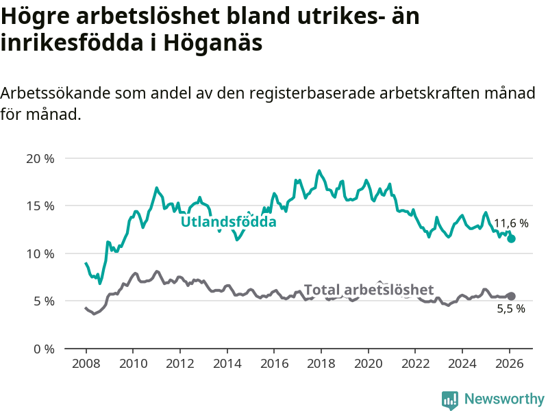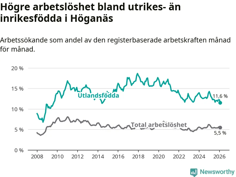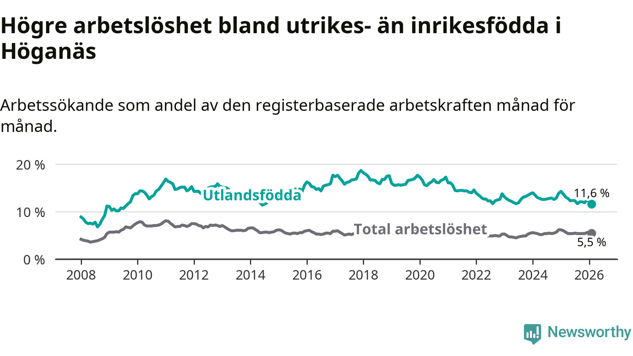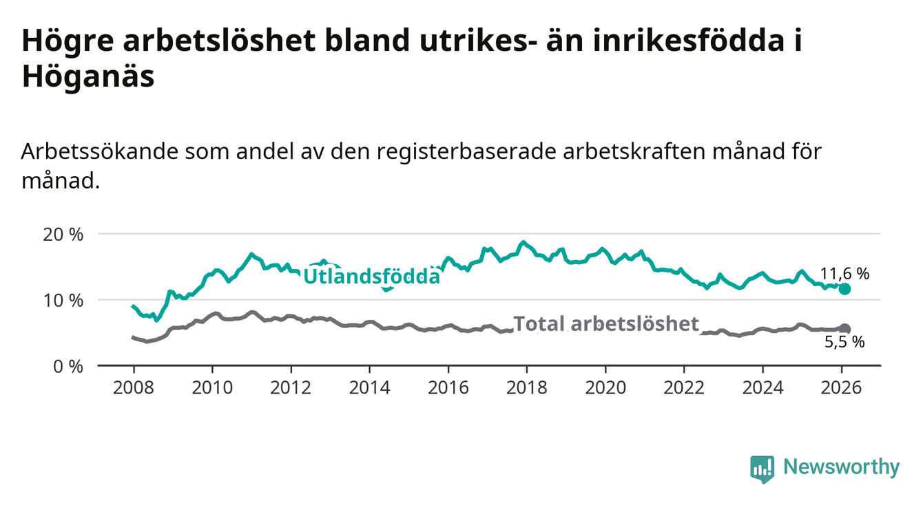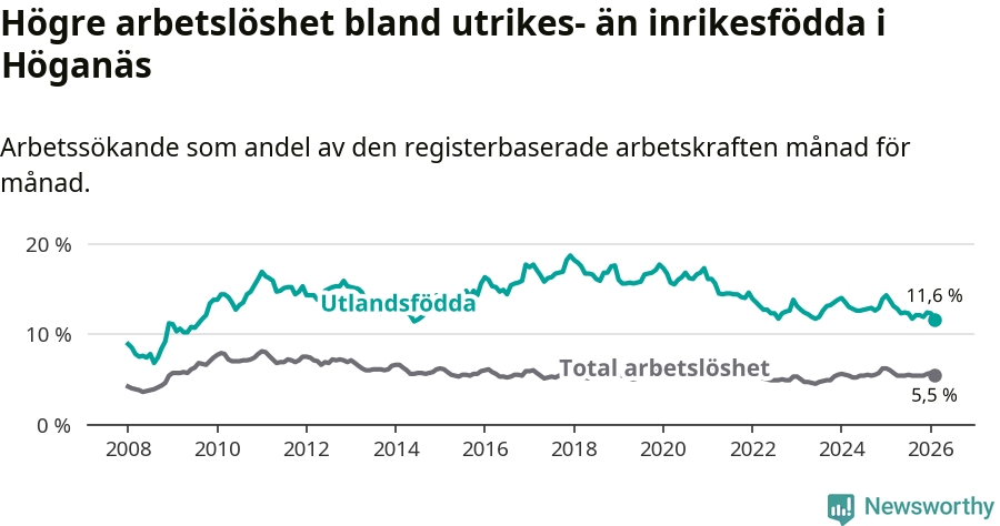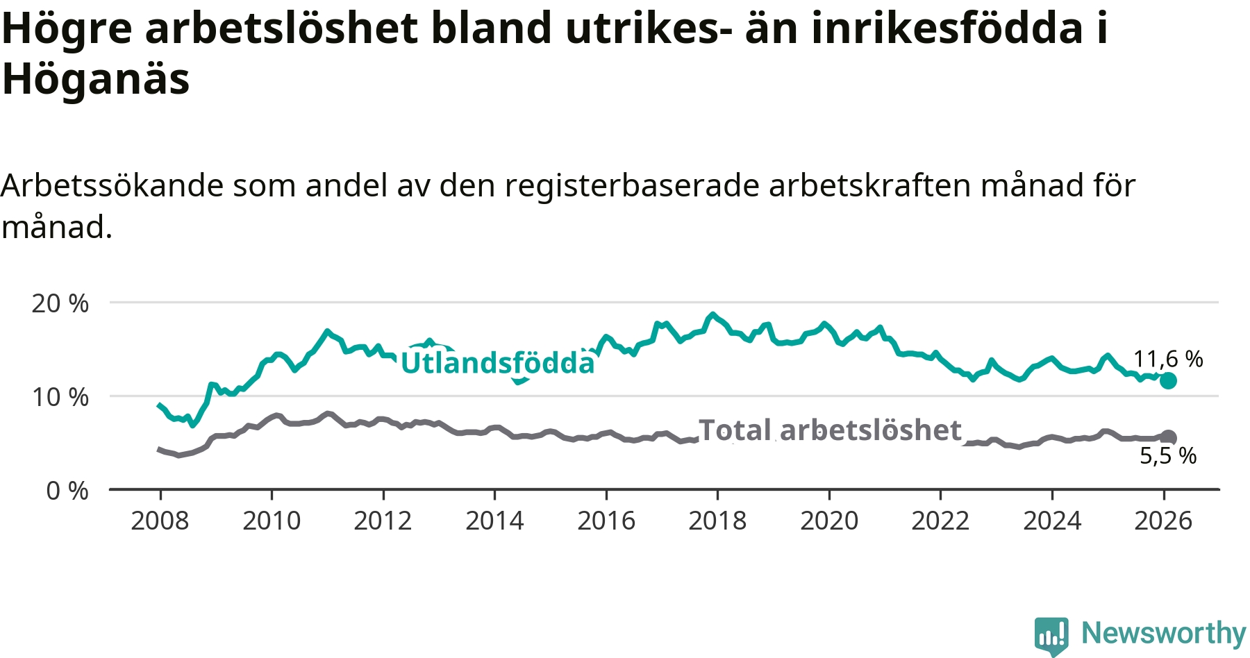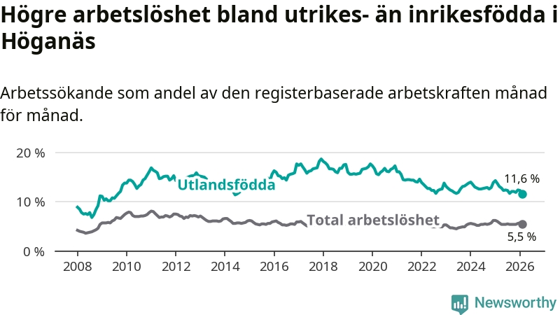 Arbetslösheten bland utlandsfödda var 11,6 procent i Höganäs under februari månad, motsvarande 256 av 2 207 personer. Det är 2,1 procentenheter färre än vid samma tidpunkt i fjol (−39 om man räknar personer). Därmed är de utlandsföddas arbetslöshet lägre än vid samma tidpunkt i fjol för tionde månaden i följd. Sedan april 2025 har arbetslösheten bland utlandsfödda minskat från 12,8 till 11,6 procent. Den nuvarande arbetslöshetsnivån är den lägsta sedan juli 2014.