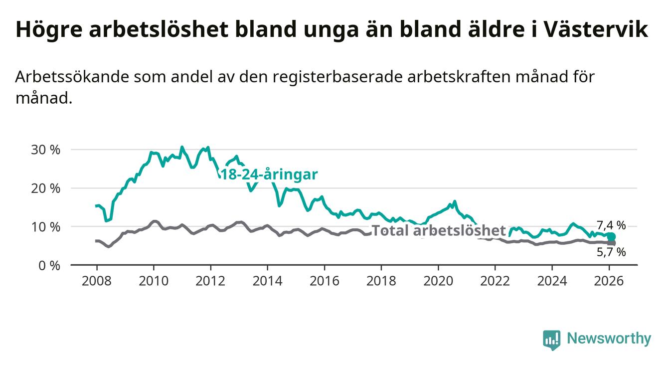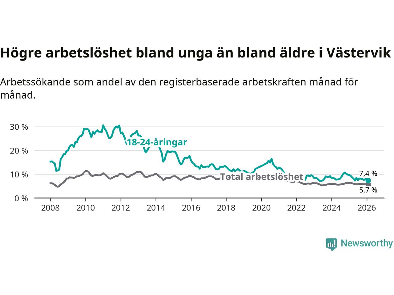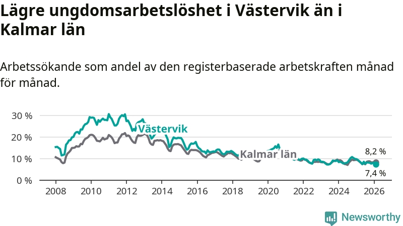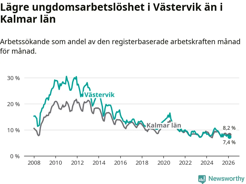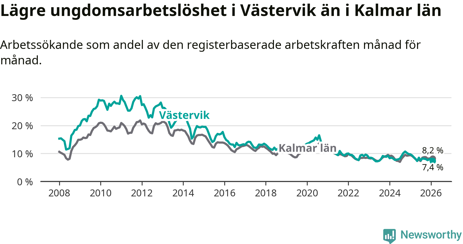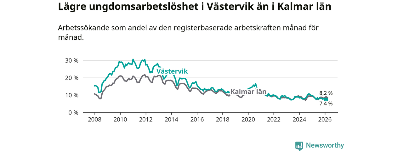 I och med den senaste månadens nedgång har de ungas arbetslöshet i Västervik sjunkit åtta månader i följd (ner från 8,5 procent i juni 2025 till 7,4 procent nu).