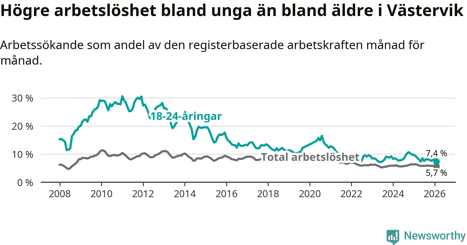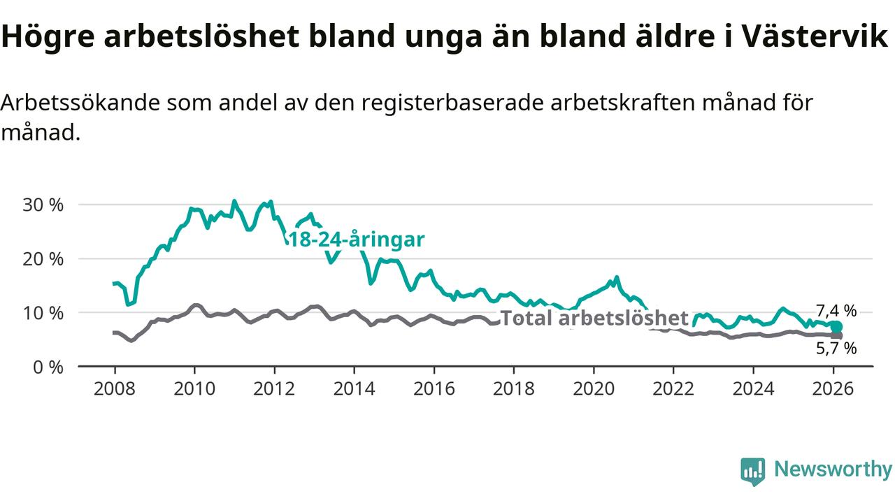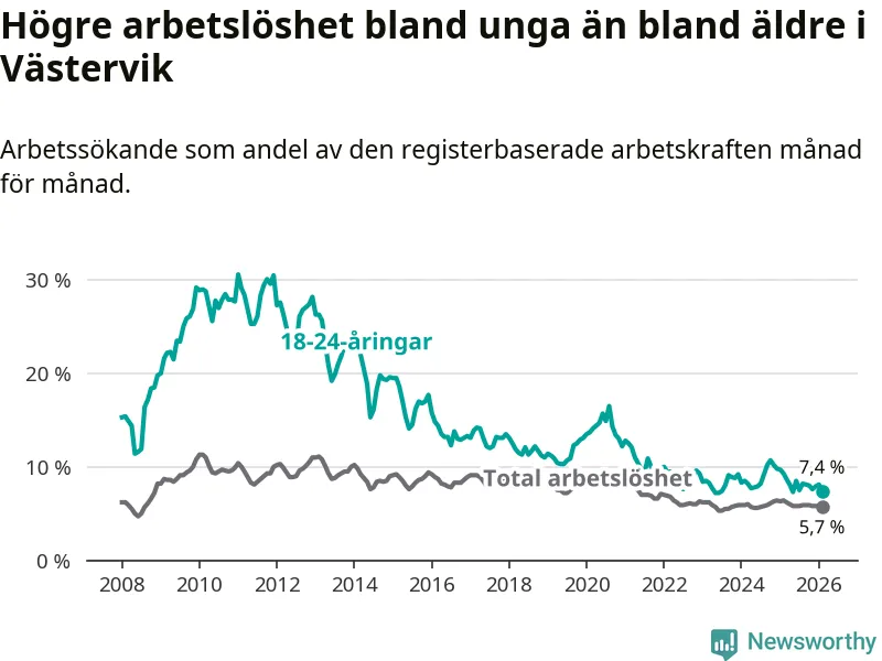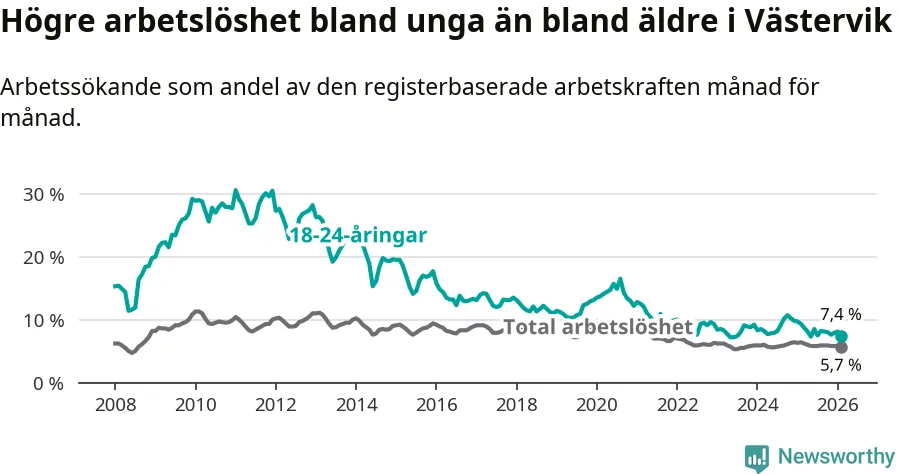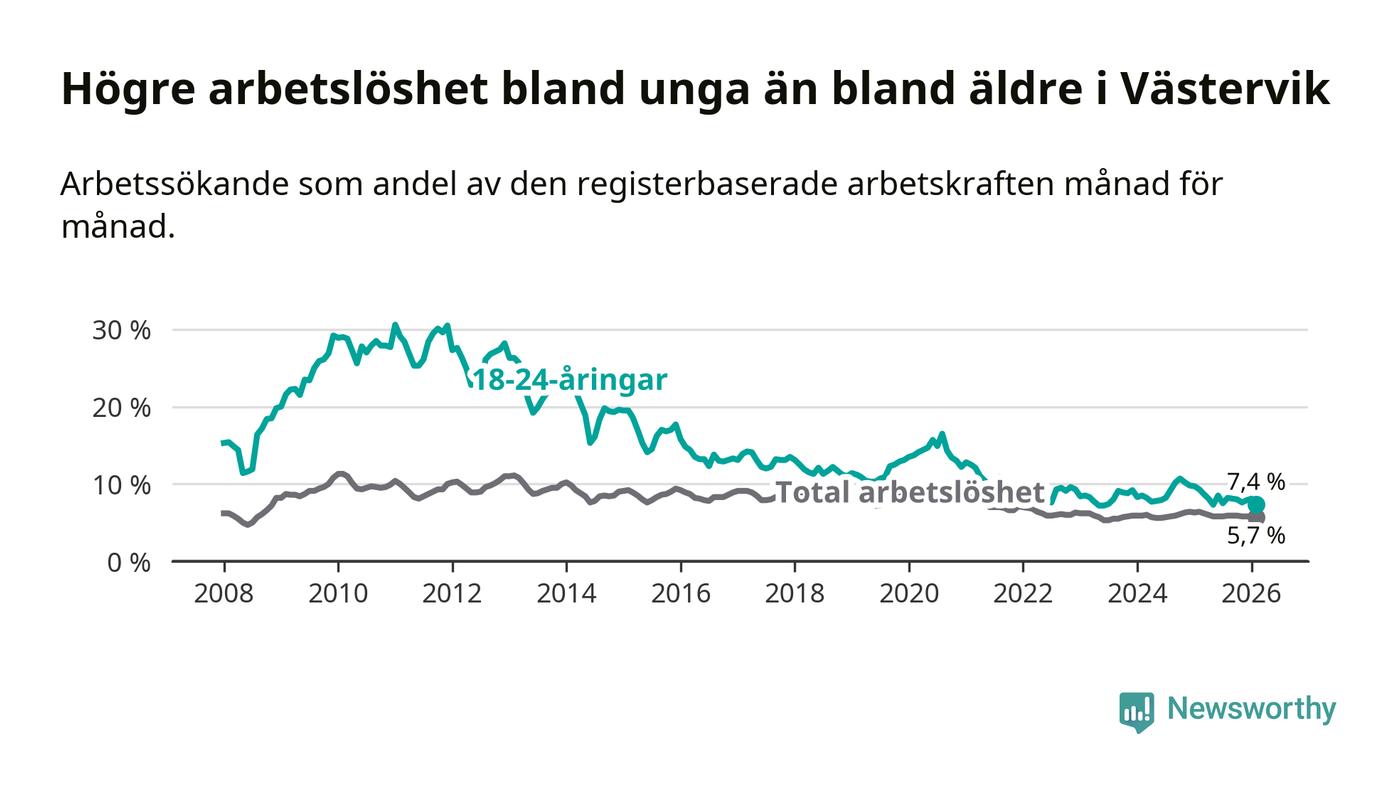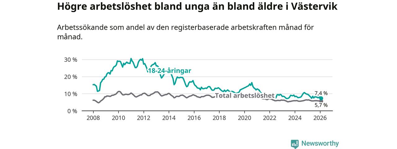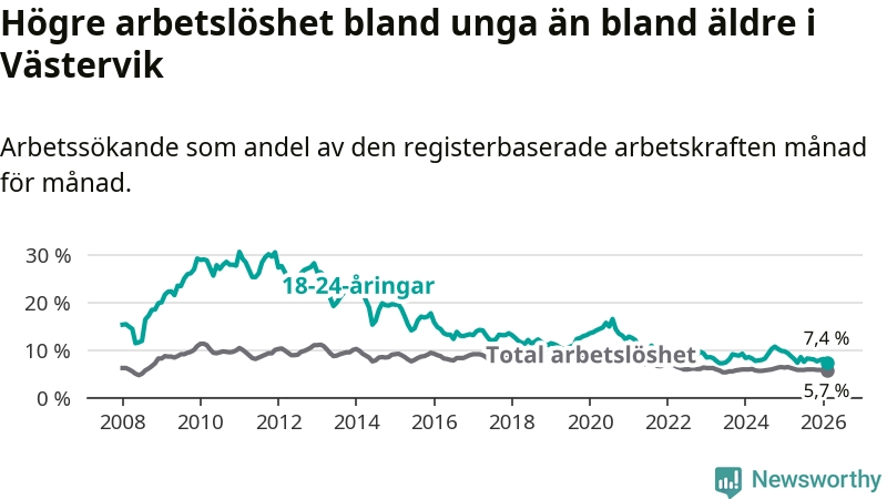 I och med den senaste månadens nedgång har de ungas arbetslöshet i Västervik sjunkit åtta månader i följd (ner från 8,5 procent i juni 2025 till 7,4 procent nu).