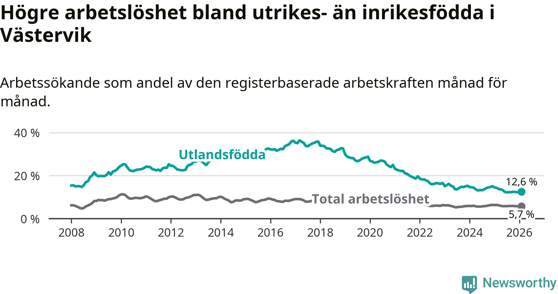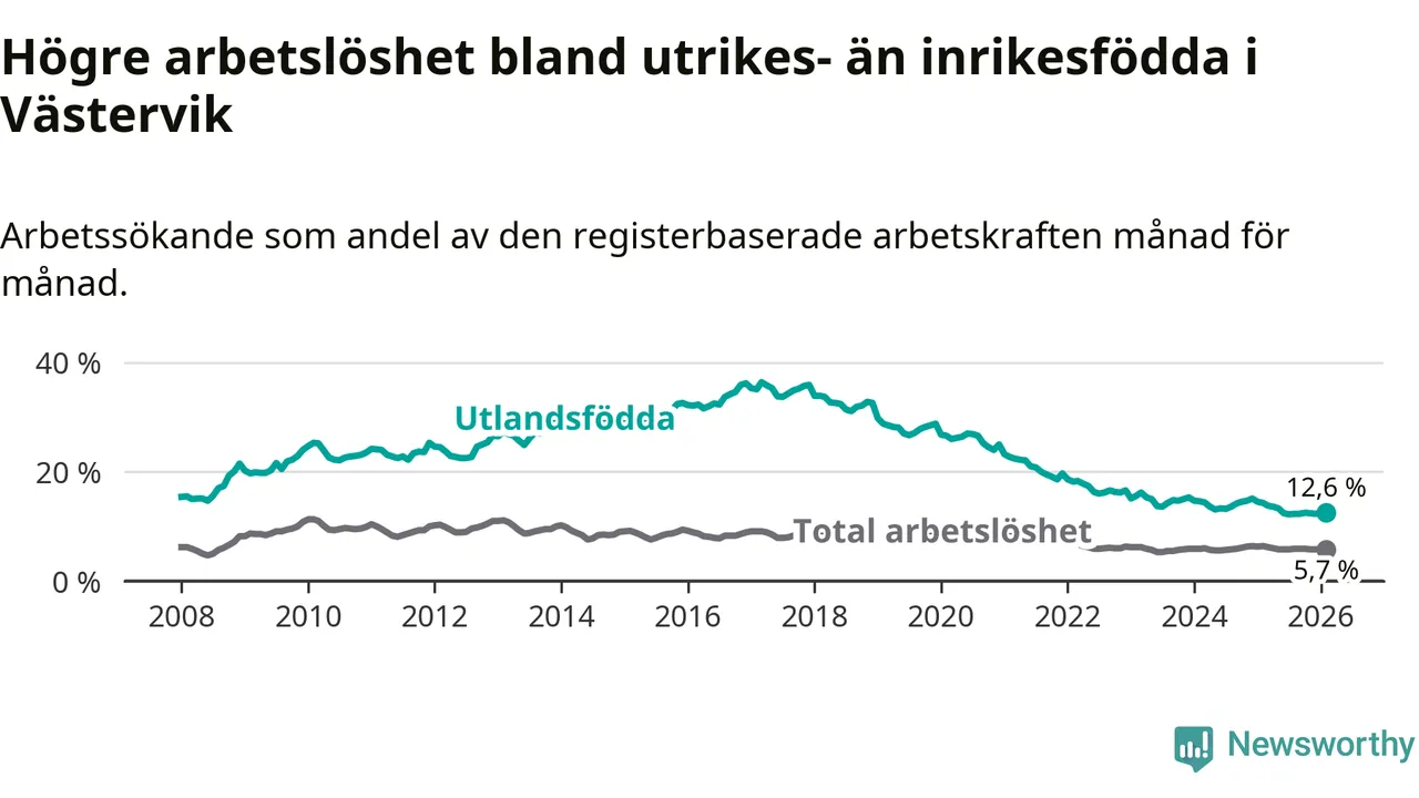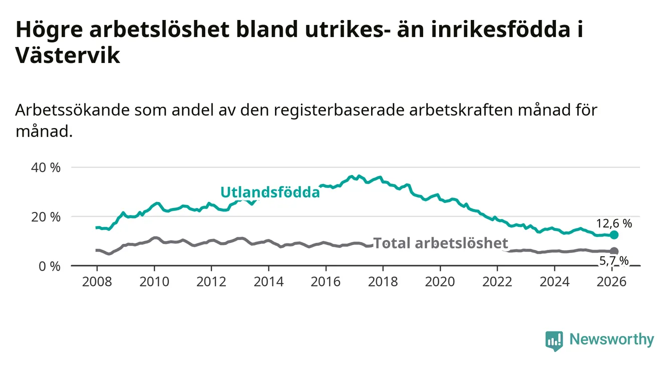 Arbetslösheten bland utlandsfödda var 12,6 procent i Västervik under februari månad, motsvarande 319 av 2 532 personer. Det är 1,7 procentenheter färre än vid samma tidpunkt i fjol (−31 om man räknar personer). Därmed är de utlandsföddas arbetslöshet lägre än vid samma tidpunkt i fjol för nionde månaden i följd.