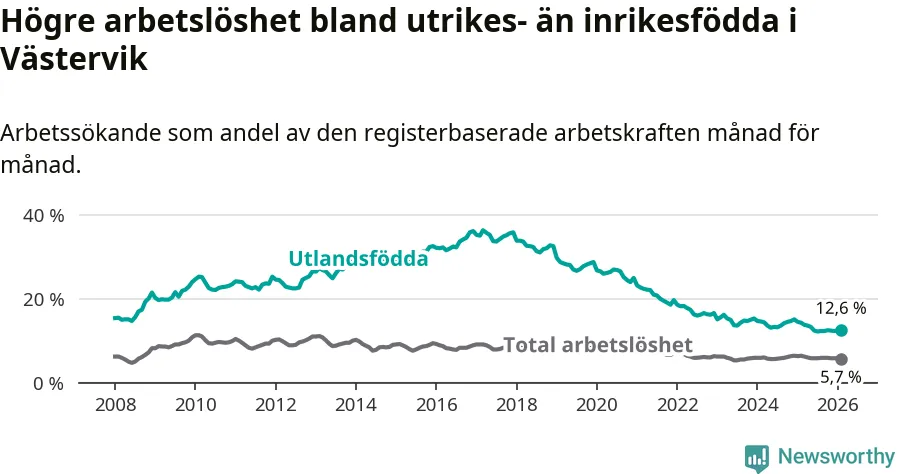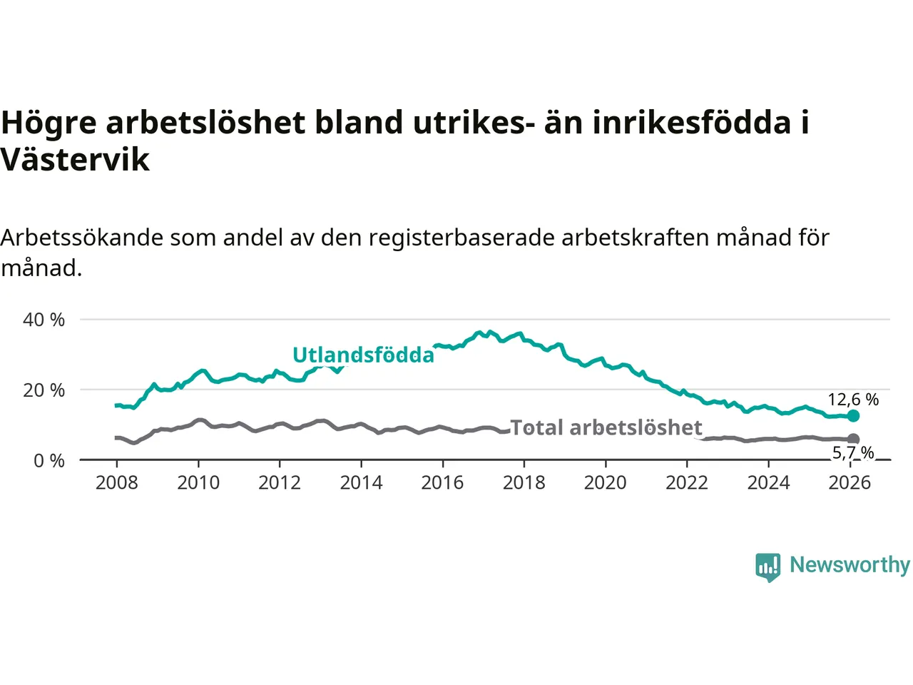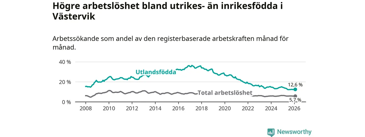 Skillnaden i arbetslöshet mellan utrikesfödda och hela befolkningen är 6,9 procentenheter i Västervik. Det är en mindre skillnad än för ett år sedan (−1,0 procentenheter).