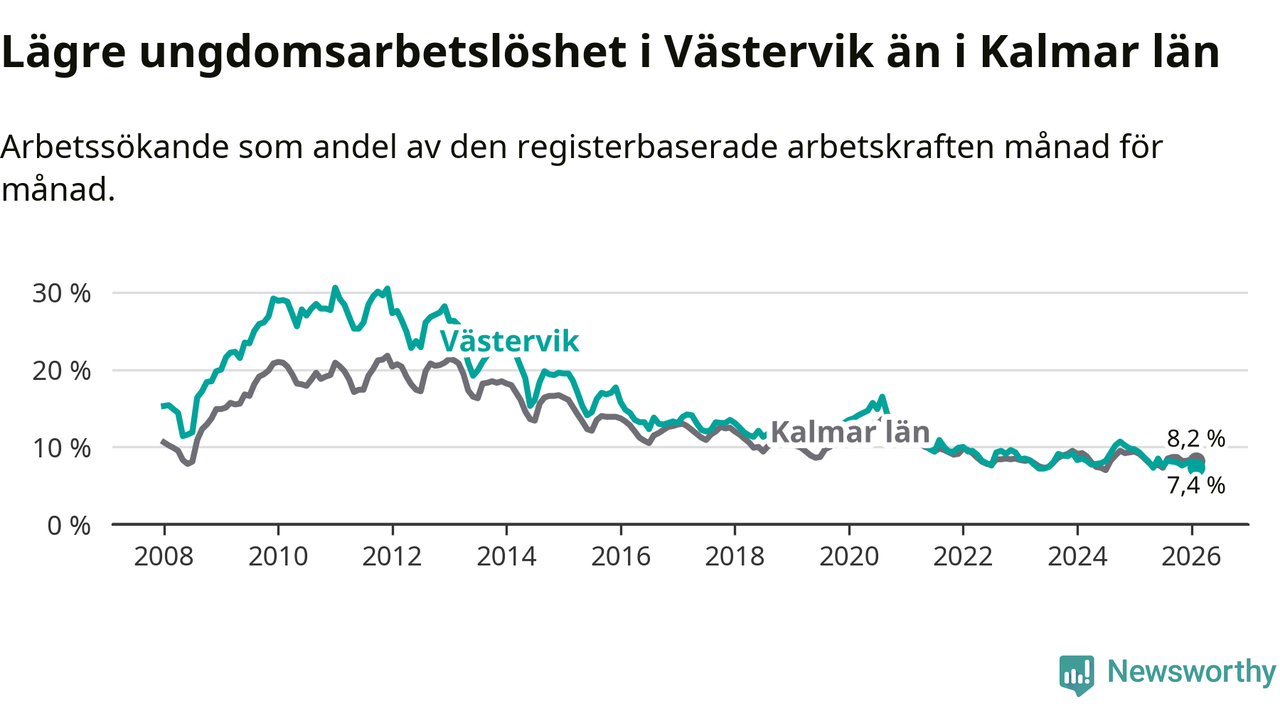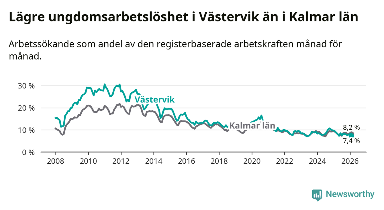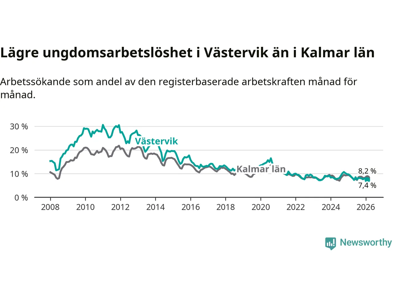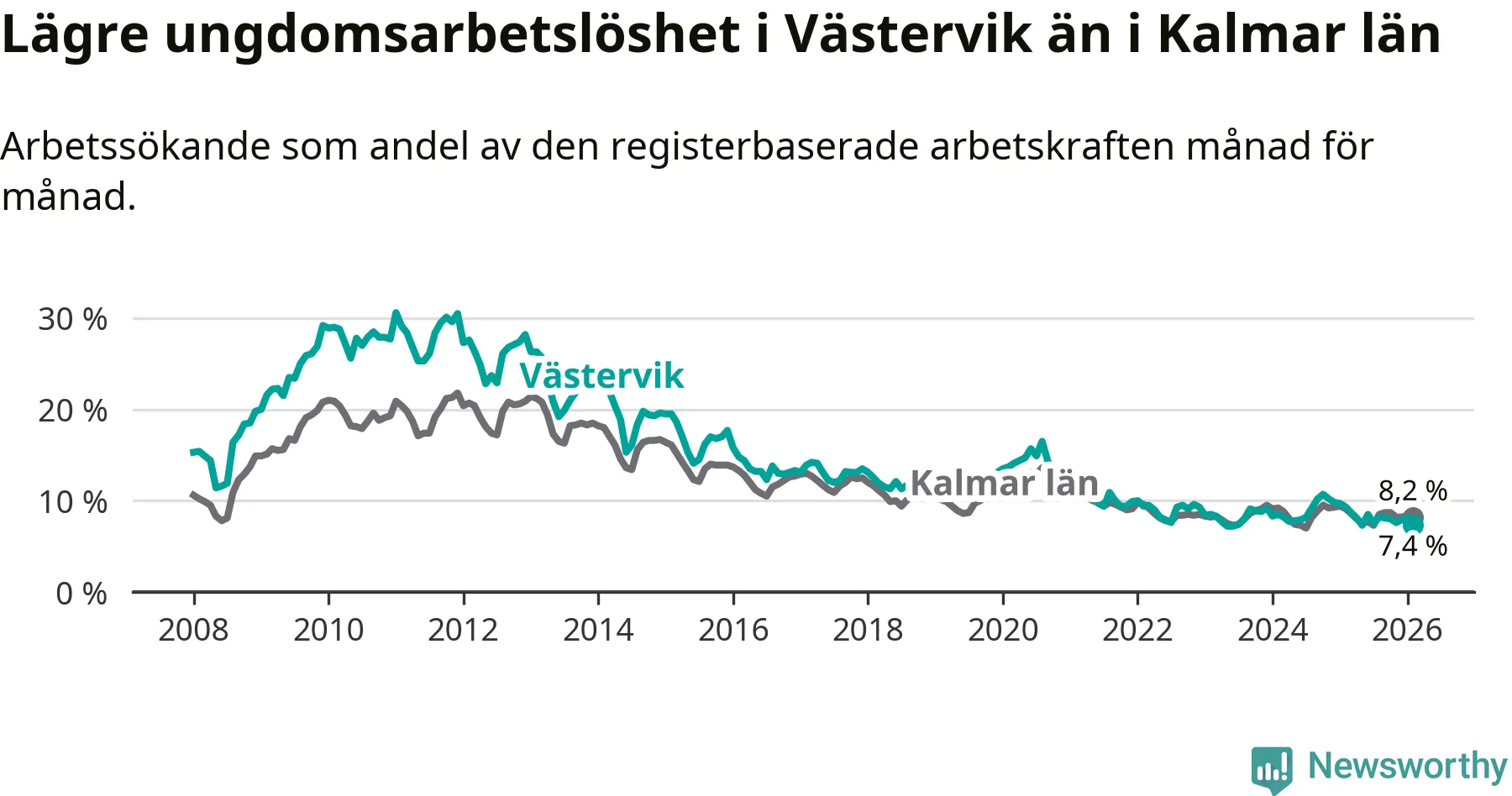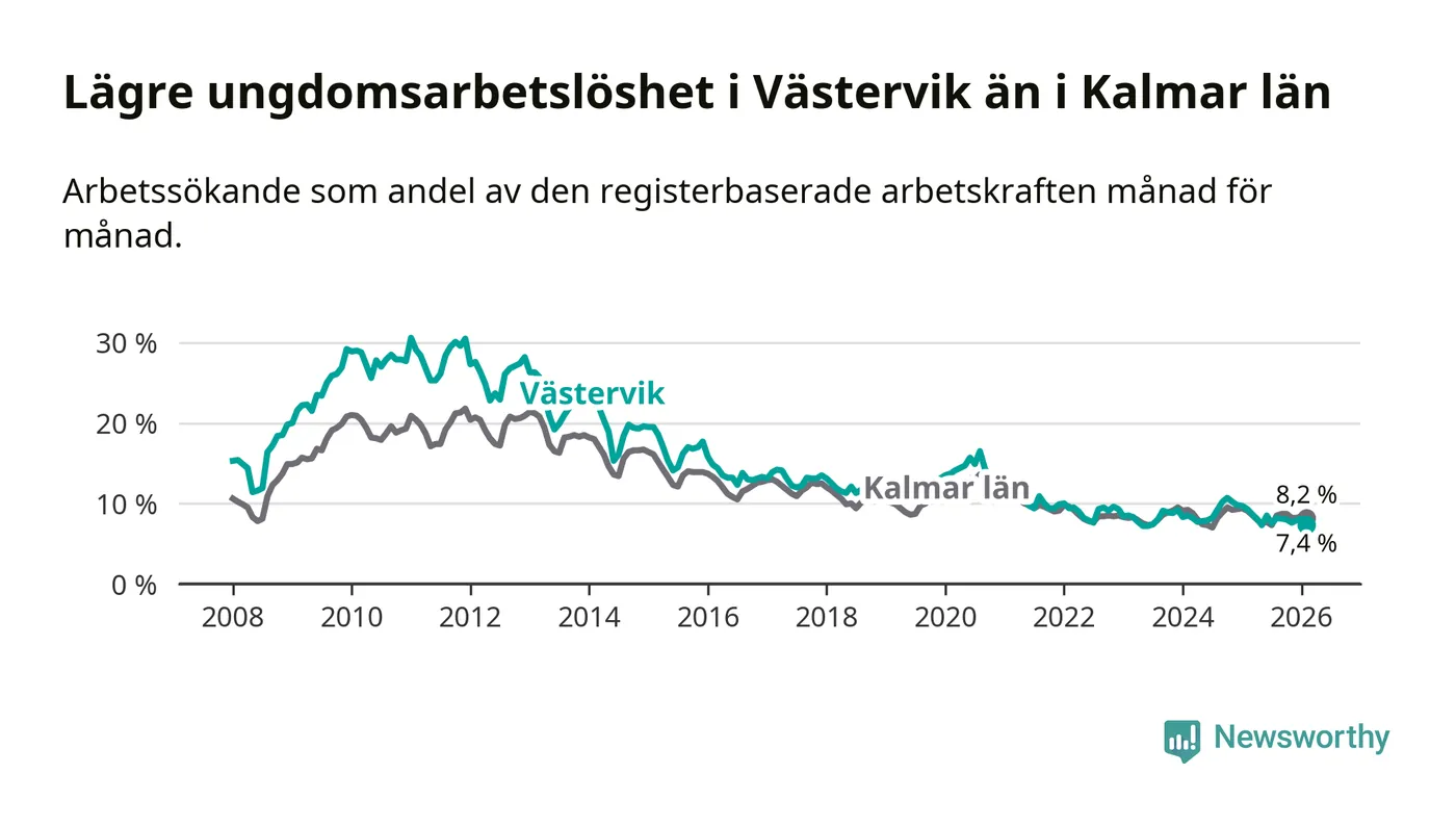 Graf: Arbetslöshet bland unga i Västerviks kommun och Kalmar län