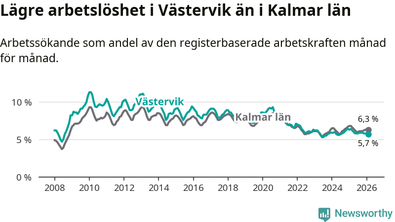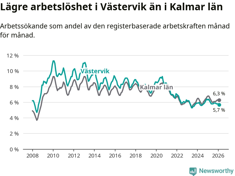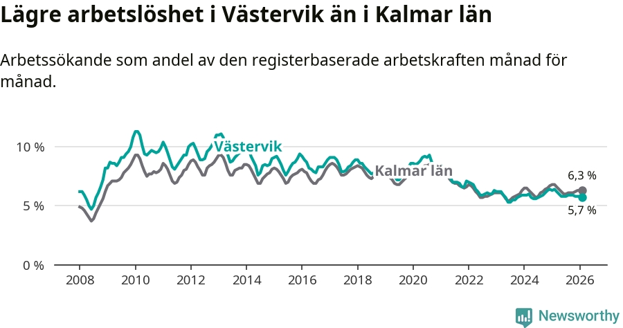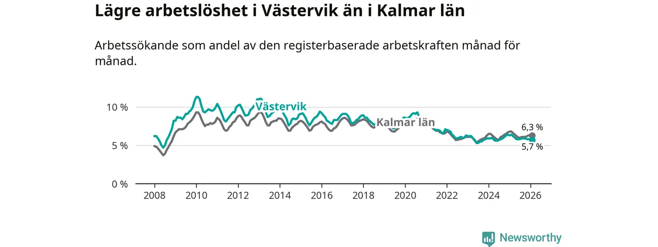 Under februari månad rapporterade Västerviks kommun en total arbetslöshet på 5,7 procent. Det är en minskning jämfört med samma tidpunkt i fjol (−0,7 procentenheter). Även i Kalmar län sjunker arbetslösheten .