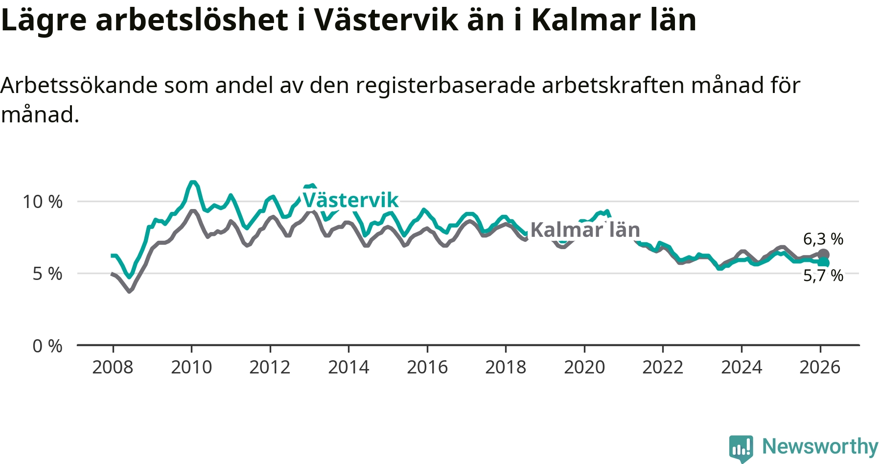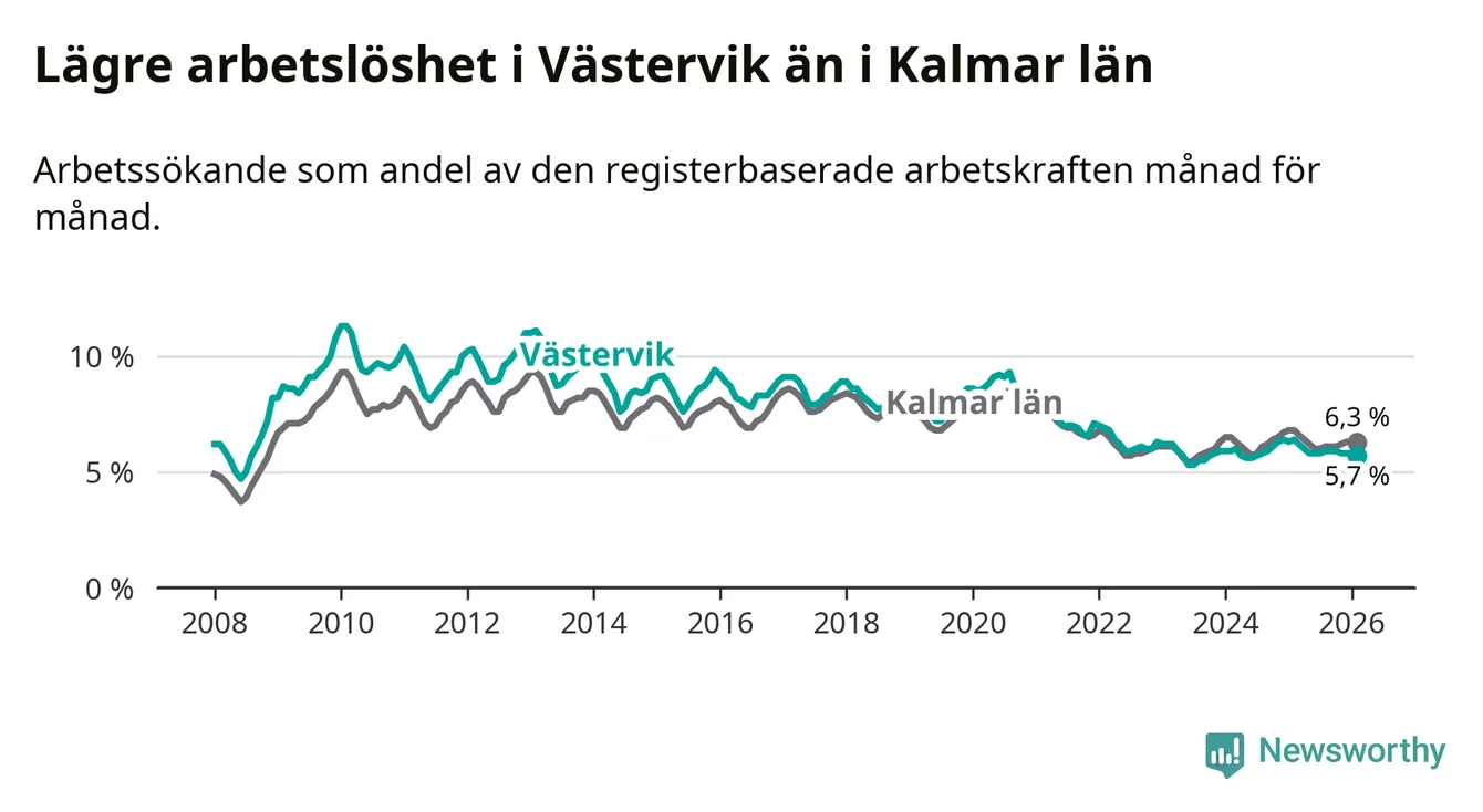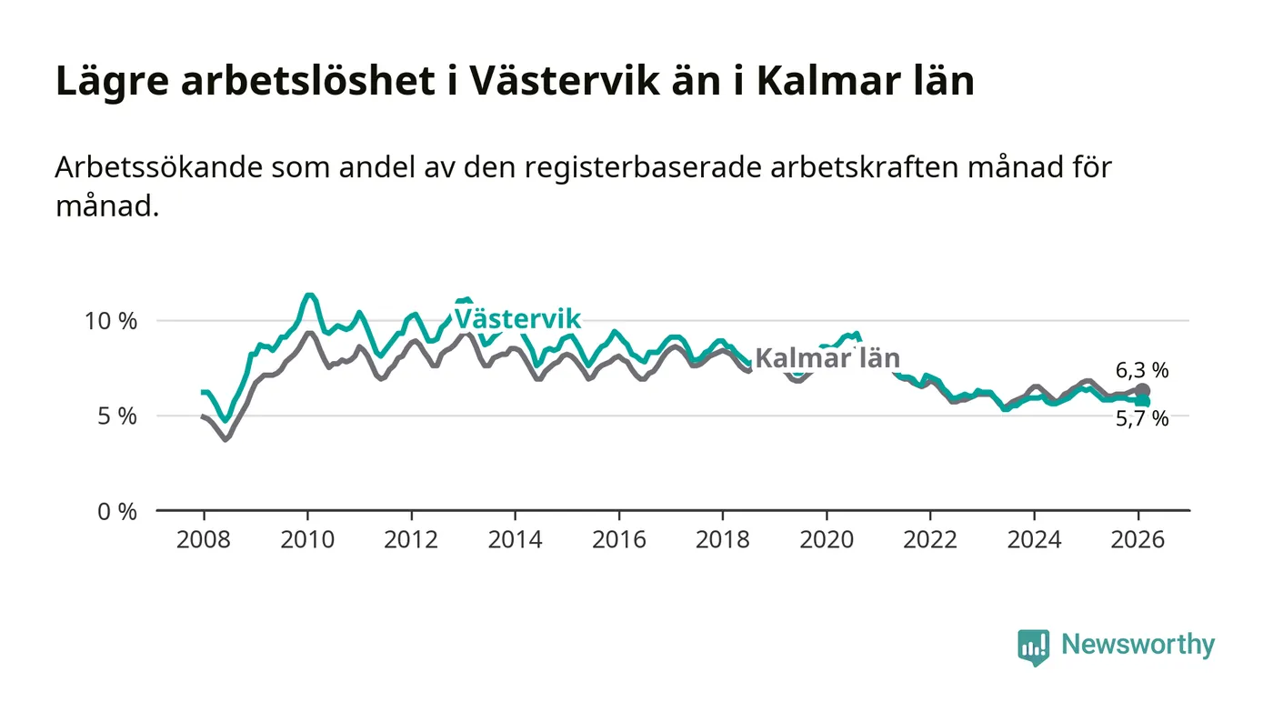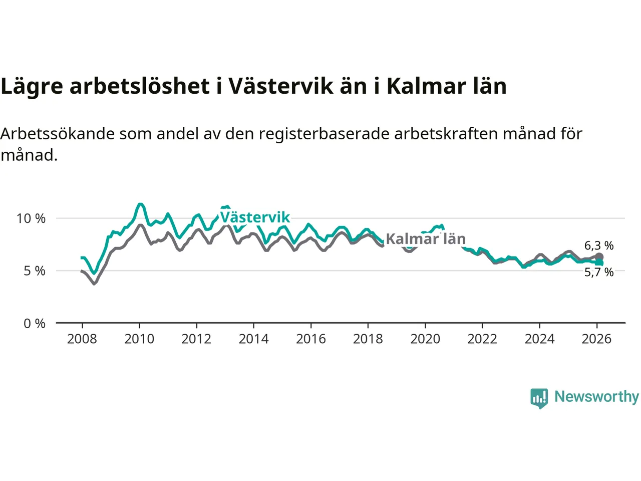 Västervik hade redan tidigare lägre arbetslöshet än snittet i hela Kalmar län och nu växer klyftan (5,7 procent i kommunen, jämfört med 6,3 procent i hela länet). Mörbylånga har den lägsta arbetslösheten i länet (3,8 procent), medan Emmaboda har den högsta (8,3 procent). För att Västervik skulle komma ner i samma arbetslöshetsnivå som Mörbylånga skulle 312 personer behöva sysselsättas.
