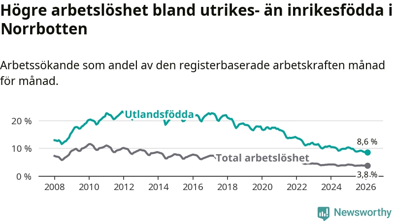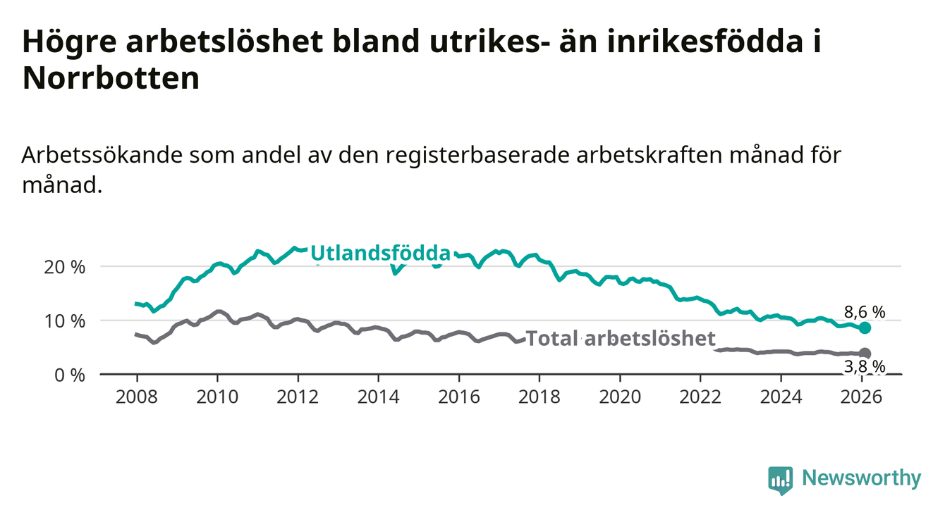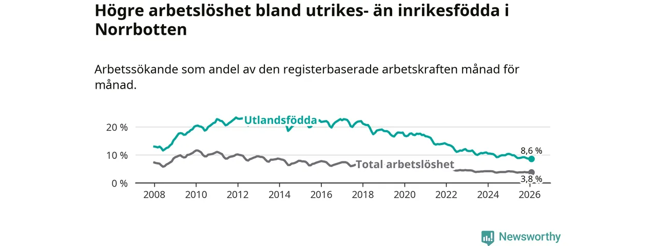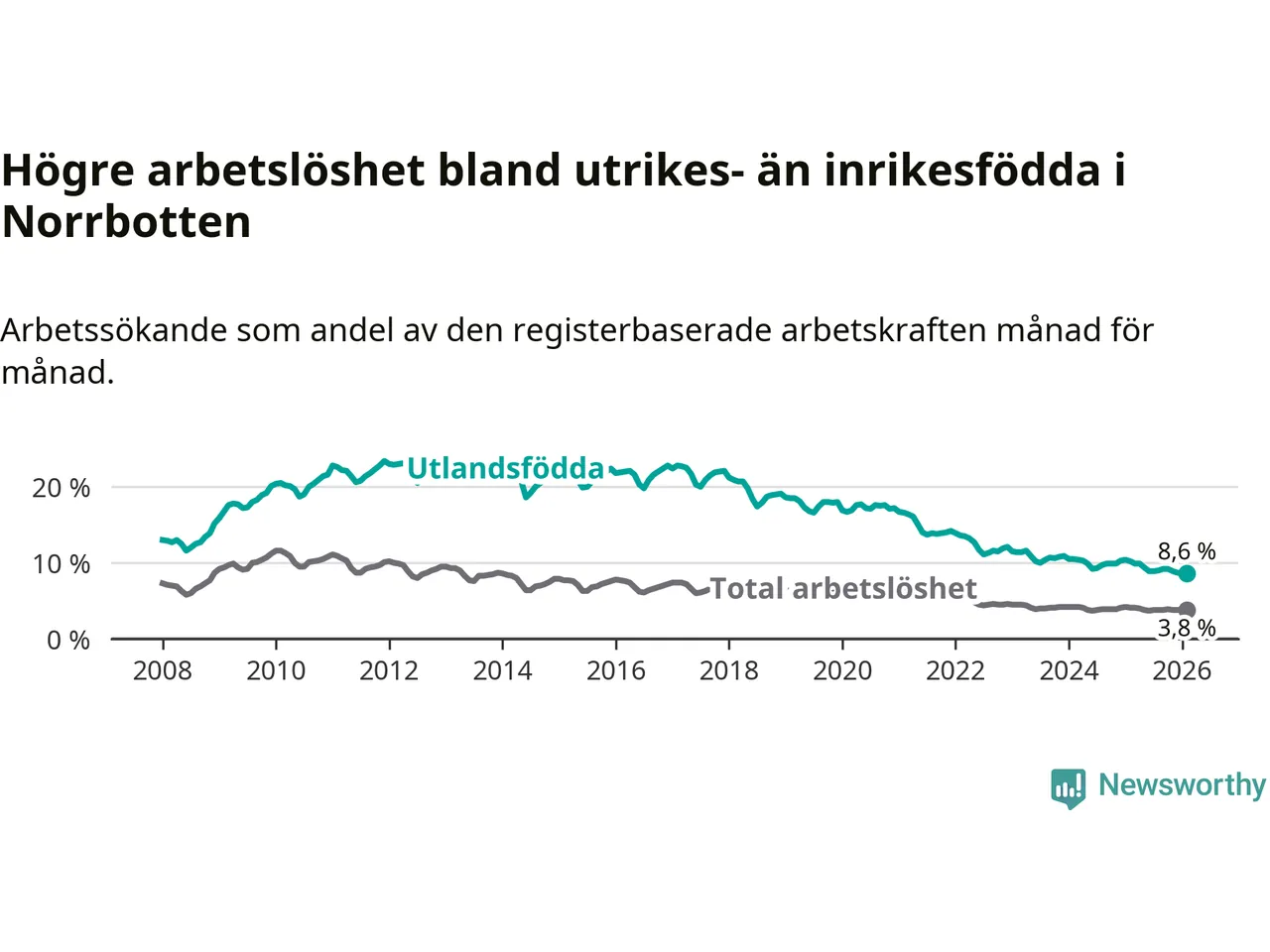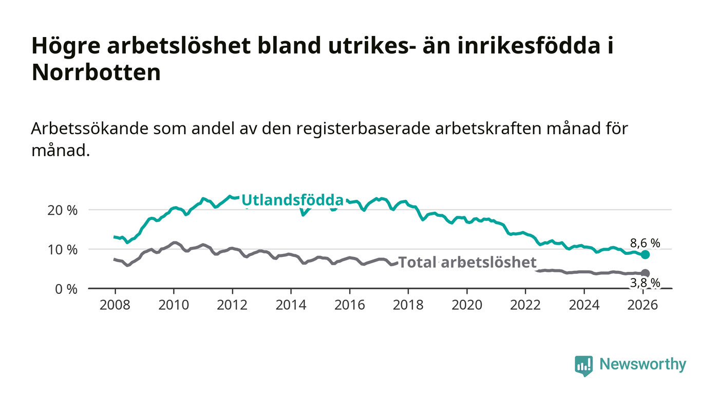 Arbetslösheten bland utlandsfödda var 8,6 procent i Norrbotten under februari månad, motsvarande 1 618 av 18 814 personer. Det är 1,6 procentenheter färre än vid samma tidpunkt i fjol (−186 om man räknar personer). Därmed har de utlandsföddas arbetslöshet varit lägre än vid samma tidpunkt i fjol i över fem år i sträck. Sedan augusti 2020 har arbetslösheten bland utlandsfödda minskat från 17,6 till 8,6 procent.