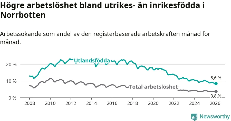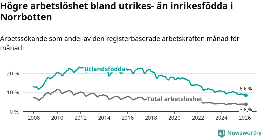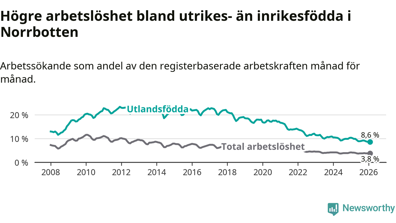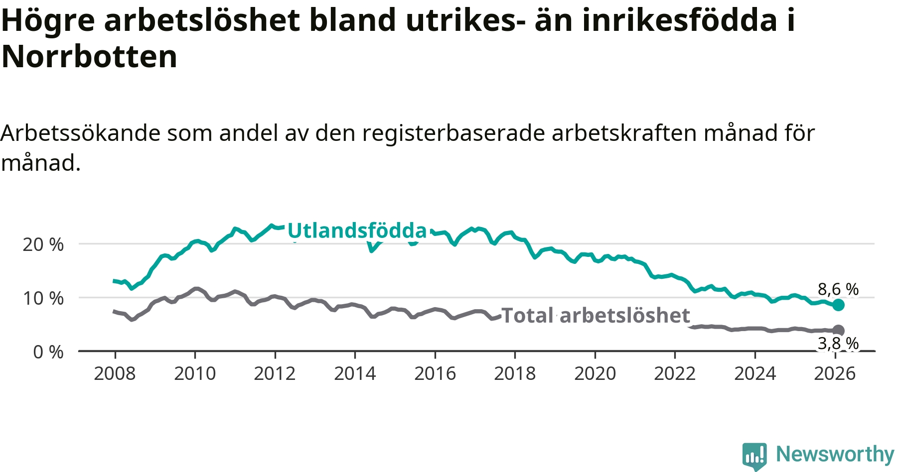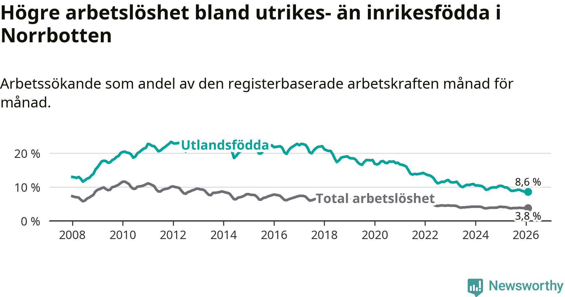 Arbetslösheten bland utlandsfödda var 8,6 procent i Norrbotten under februari månad, motsvarande 1 618 av 18 814 personer. Det är 1,6 procentenheter färre än vid samma tidpunkt i fjol (−186 om man räknar personer). Därmed har de utlandsföddas arbetslöshet varit lägre än vid samma tidpunkt i fjol i över fem år i sträck. Sedan augusti 2020 har arbetslösheten bland utlandsfödda minskat från 17,6 till 8,6 procent.