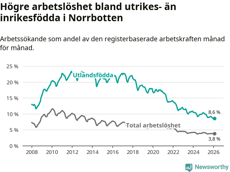 Skillnaden i arbetslöshet mellan utrikesfödda och hela befolkningen är 4,8 procentenheter i Norrbotten. Det är en mindre skillnad än för ett år sedan (−1,3 procentenheter).