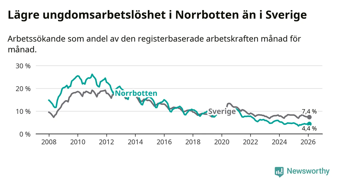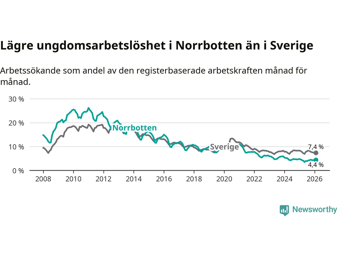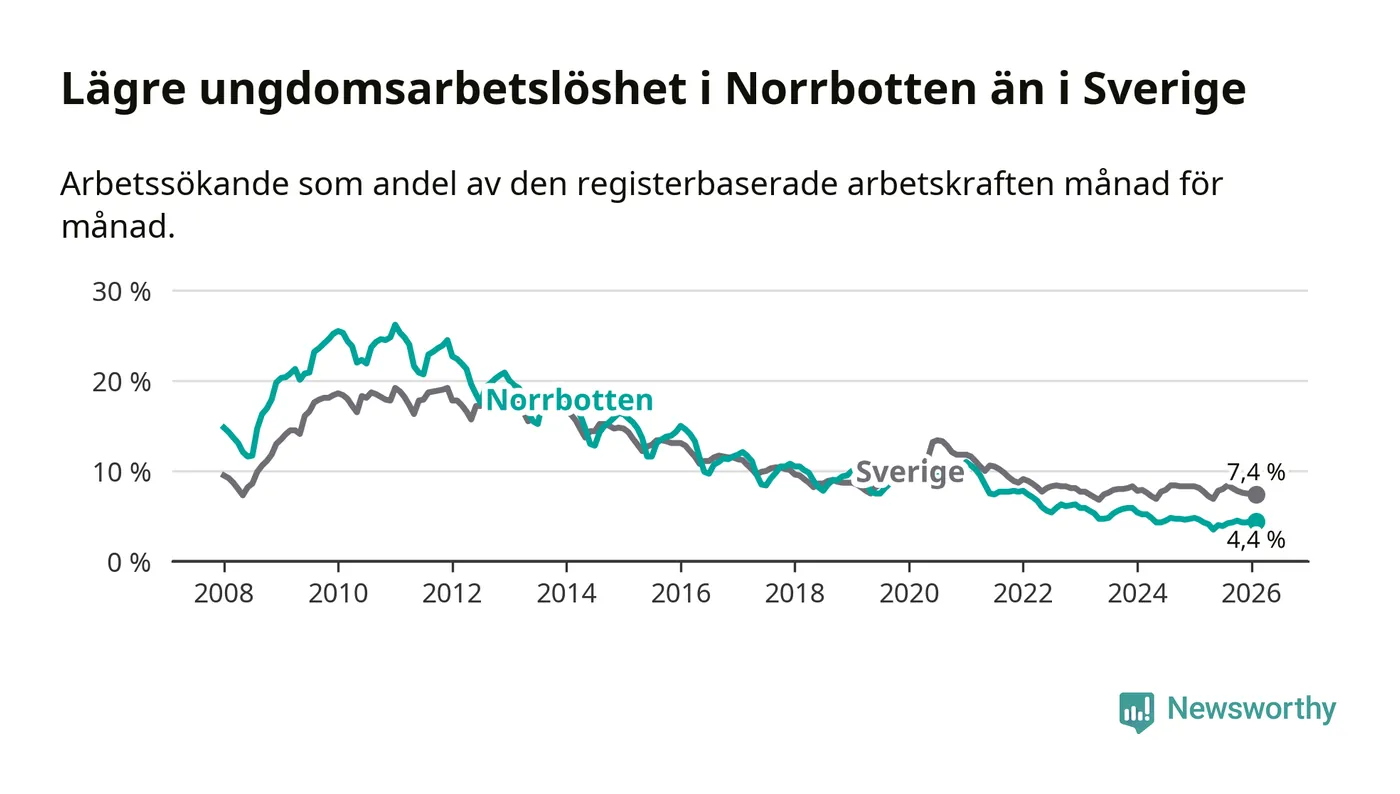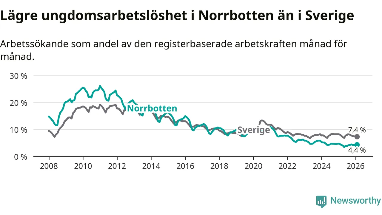 I och med den senaste månadens nedgång har de ungas arbetslöshet i Norrbotten sjunkit över fyra år i sträck (ner från 10,2 procent i mars 2021 till 4,4 procent nu).
