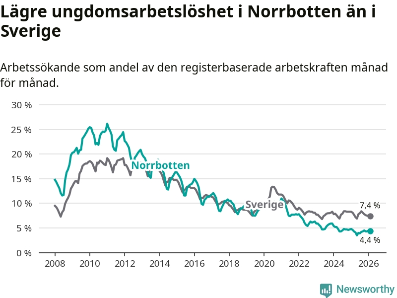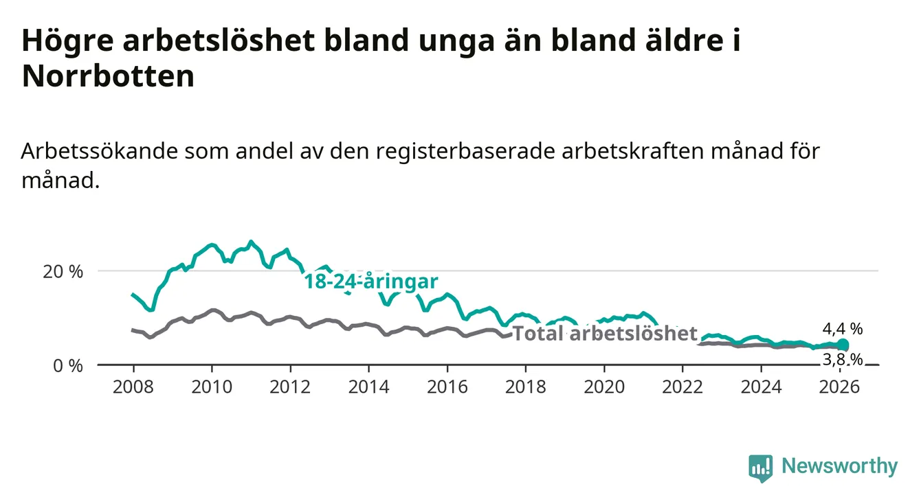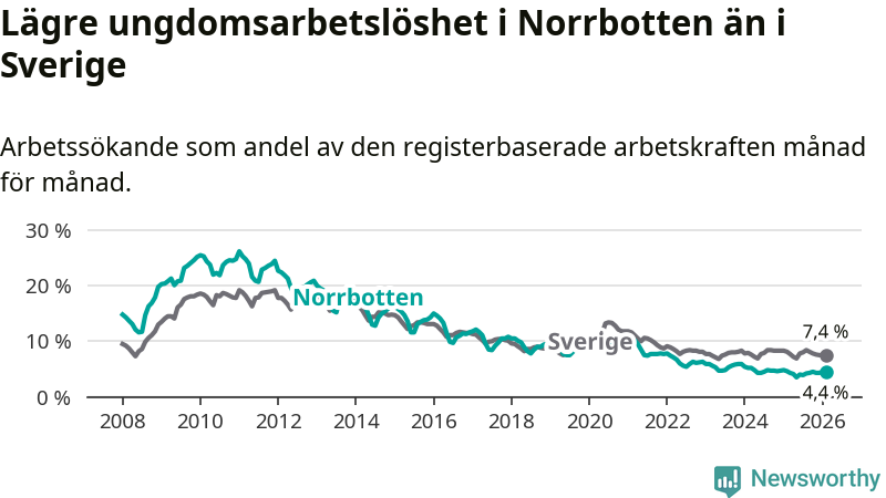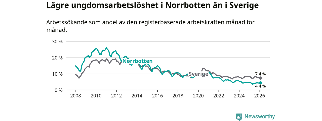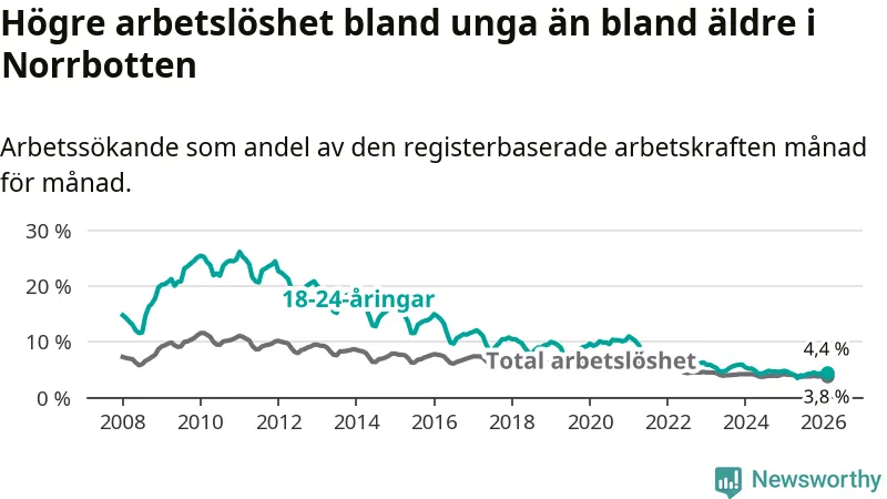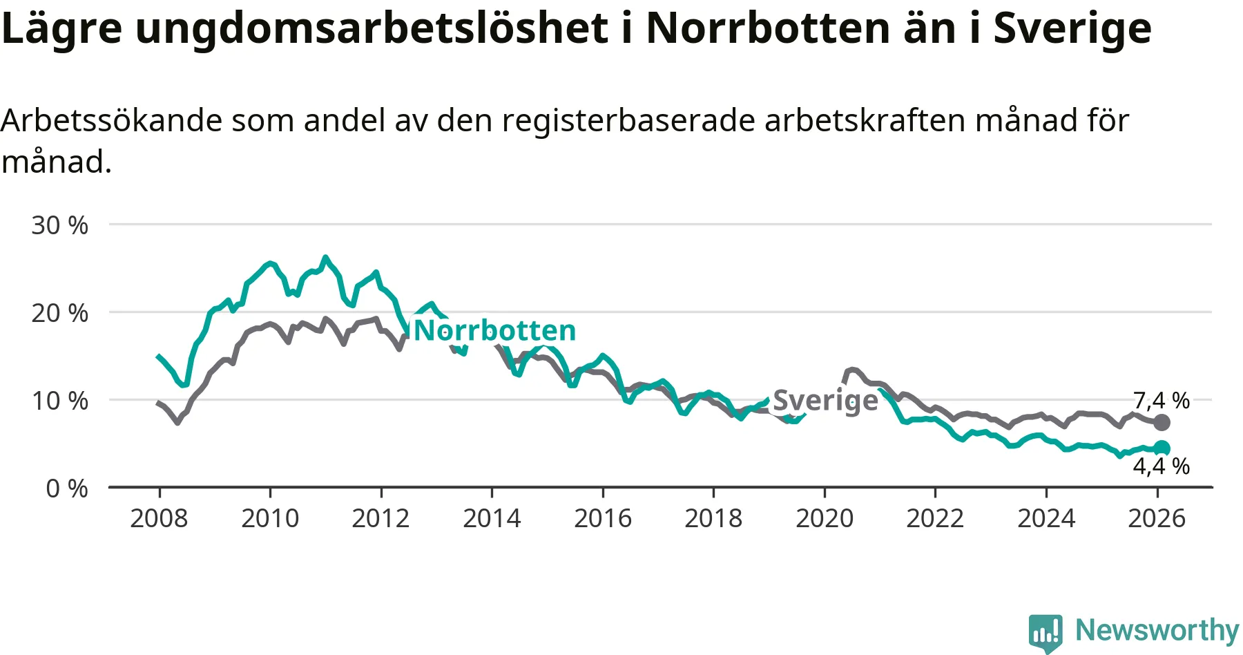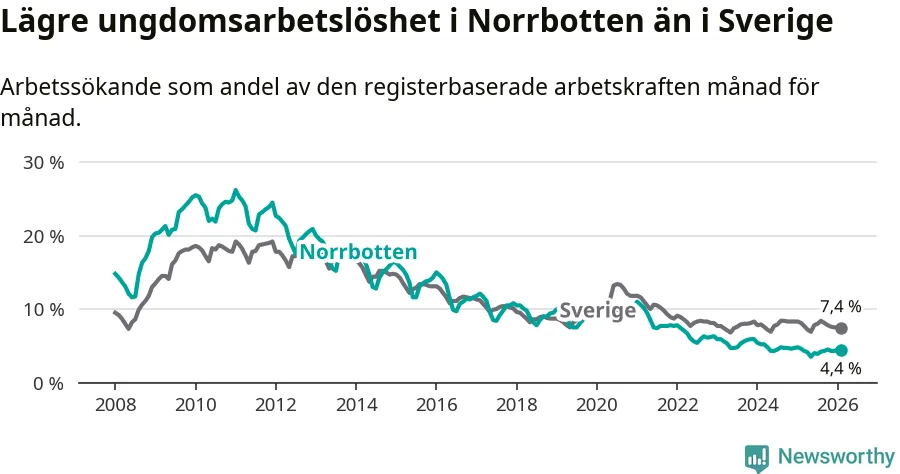 I och med den senaste månadens nedgång har de ungas arbetslöshet i Norrbotten sjunkit över fyra år i sträck (ner från 10,2 procent i mars 2021 till 4,4 procent nu).