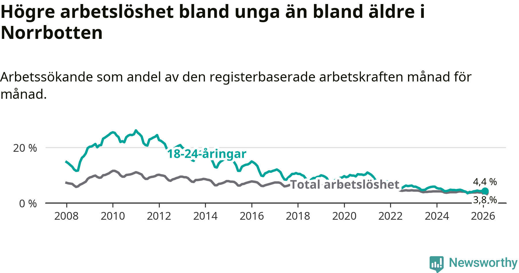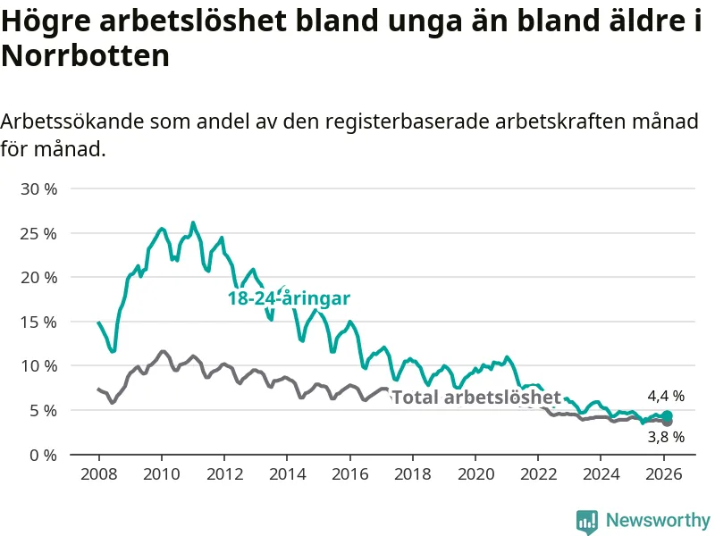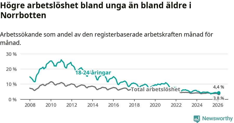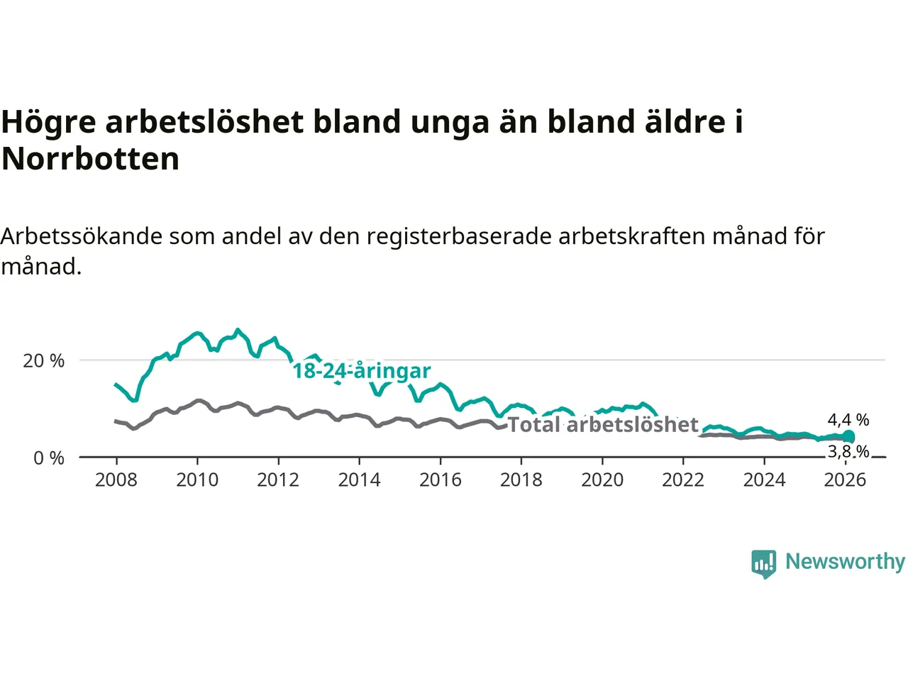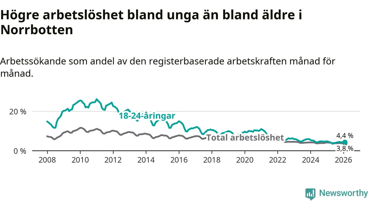 I och med den senaste månadens nedgång har de ungas arbetslöshet i Norrbotten sjunkit över fyra år i sträck (ner från 10,2 procent i mars 2021 till 4,4 procent nu).