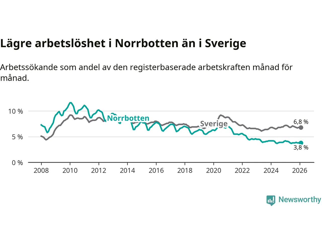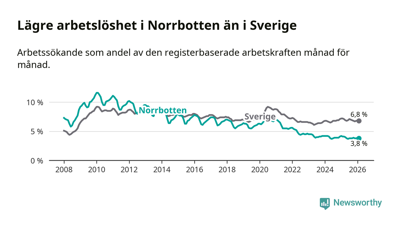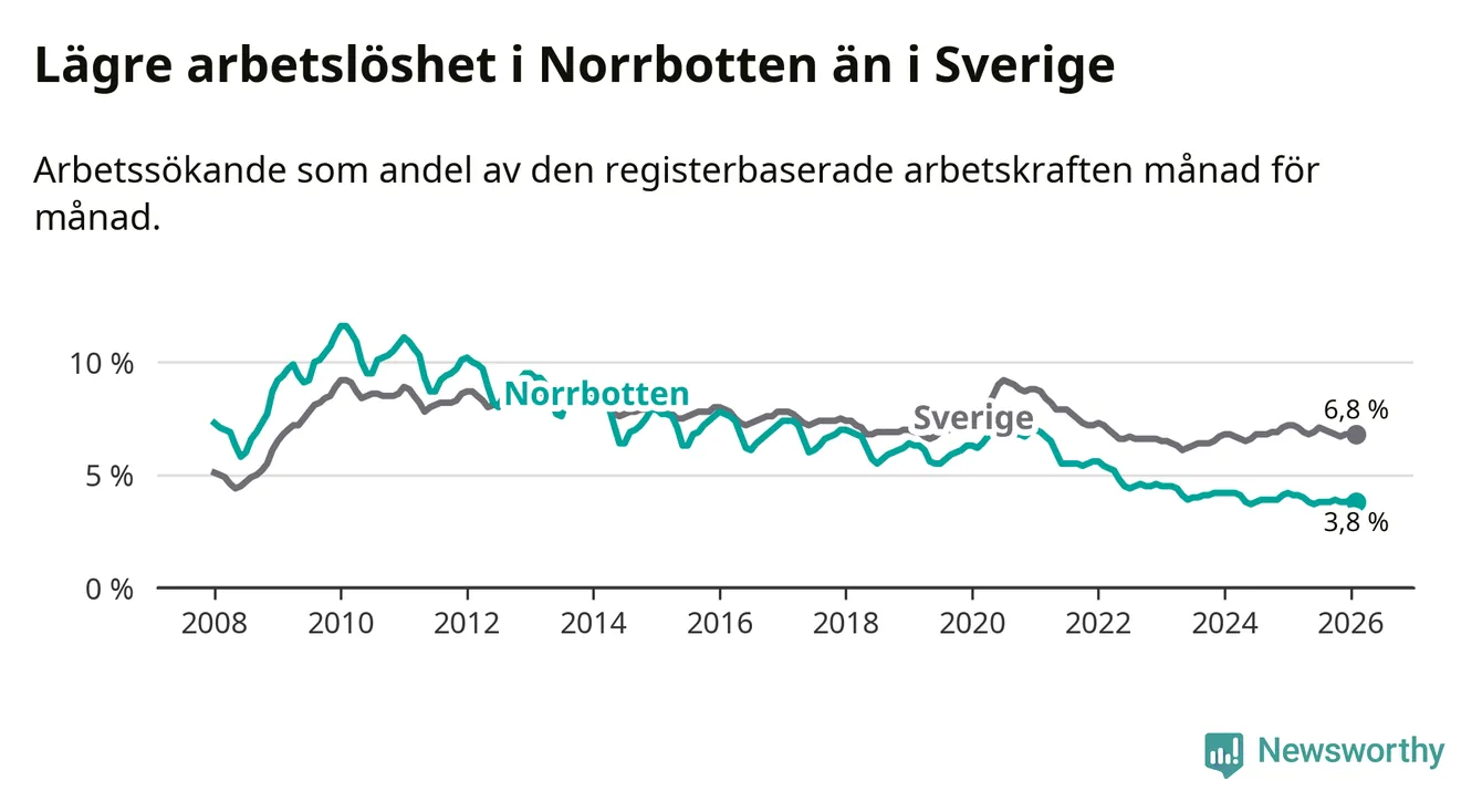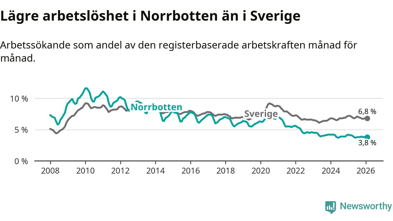 Under februari månad rapporterade Norrbottens län en total arbetslöshet på 3,8 procent. Det är en minskning jämfört med samma tidpunkt i fjol (−0,3 procentenheter). Även i Sverige sjunker arbetslösheten .