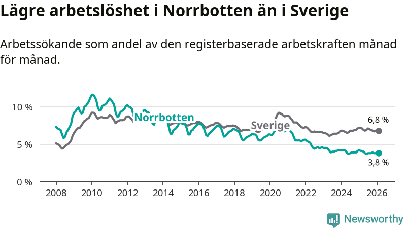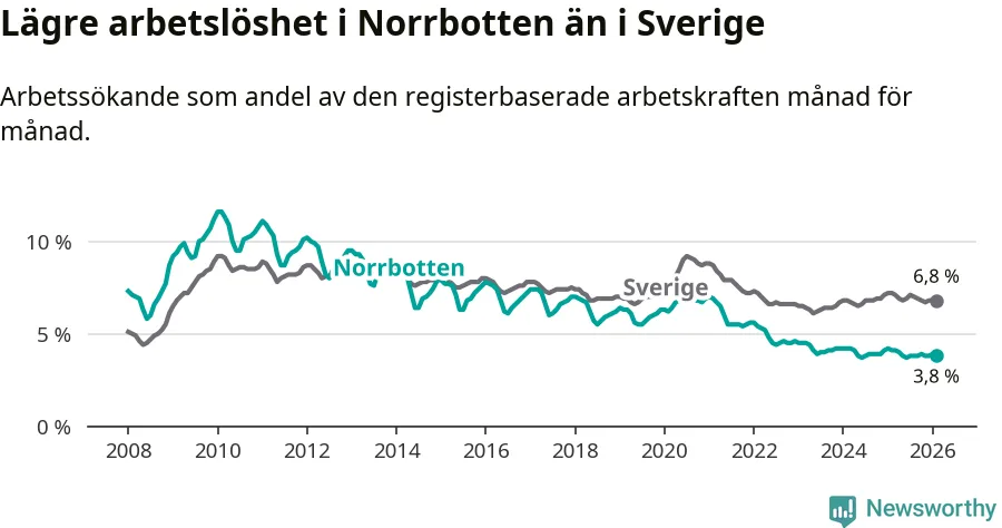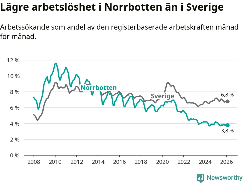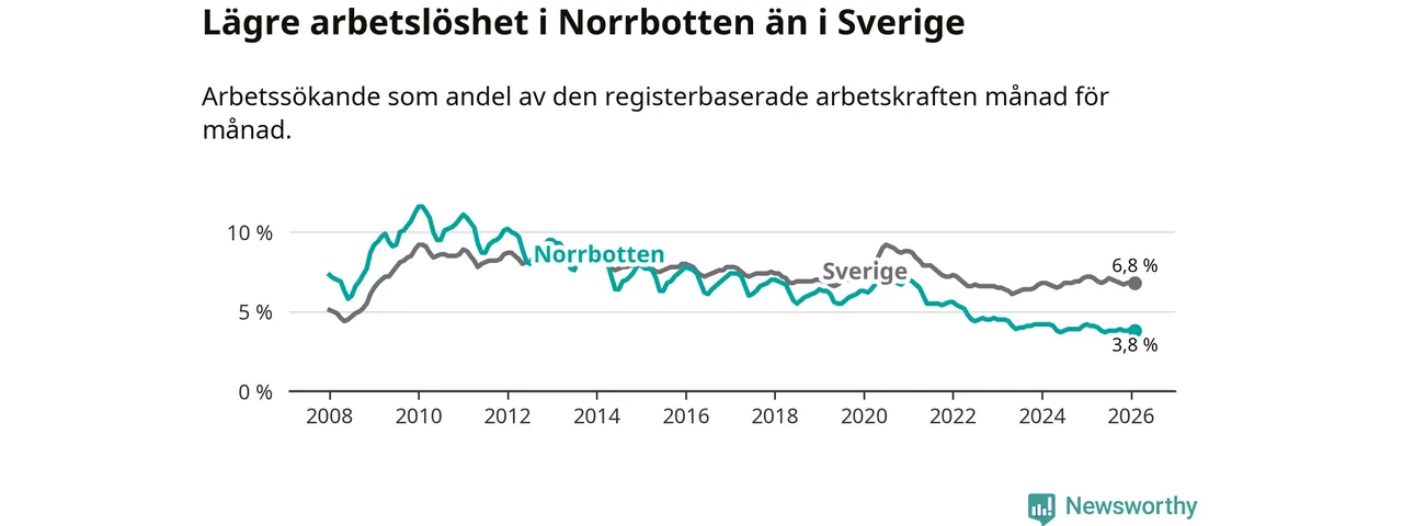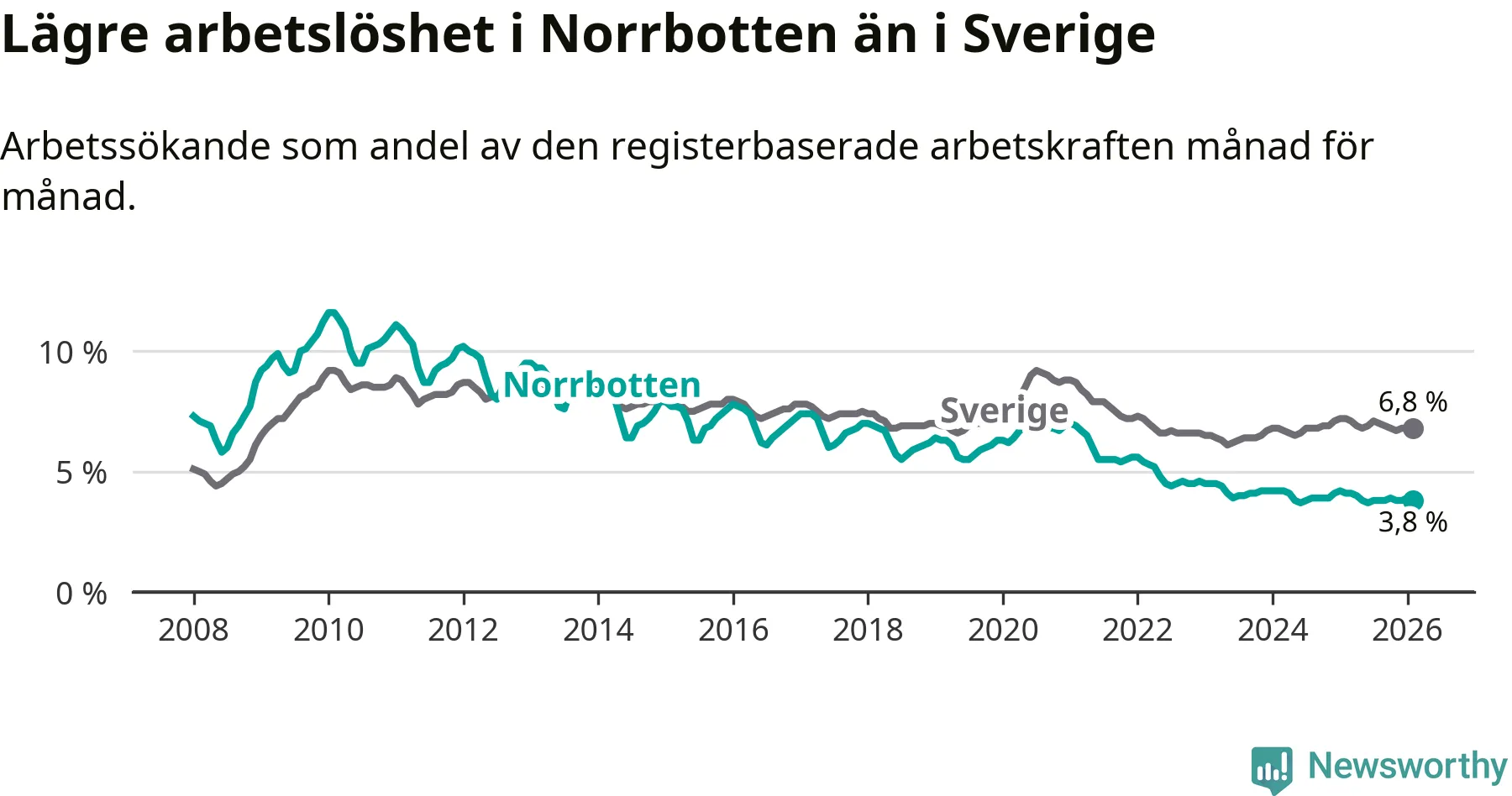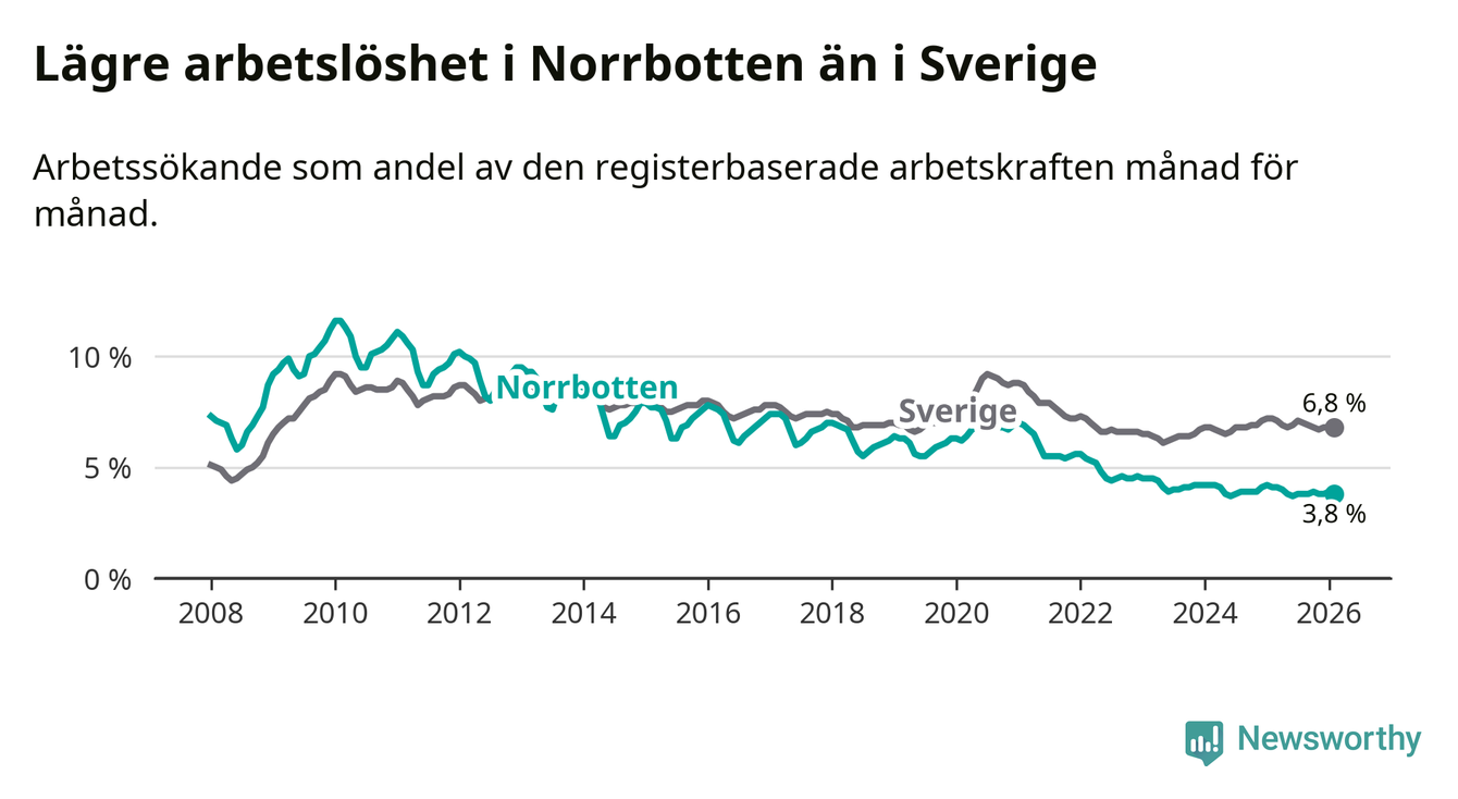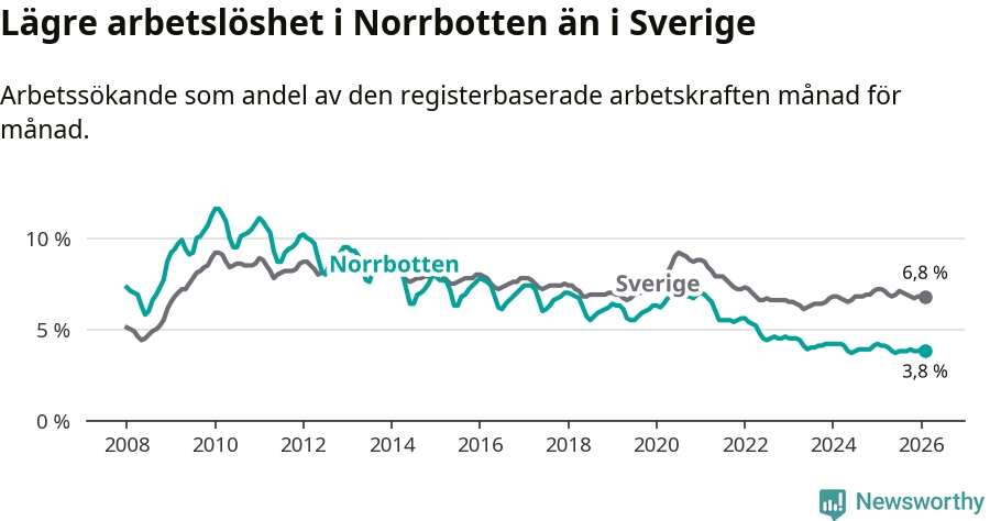 Under februari månad rapporterade Norrbottens län en total arbetslöshet på 3,8 procent. Det är en minskning jämfört med samma tidpunkt i fjol (−0,3 procentenheter). Även i Sverige sjunker arbetslösheten .