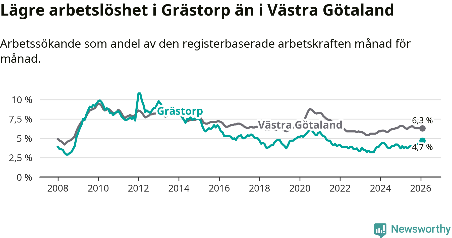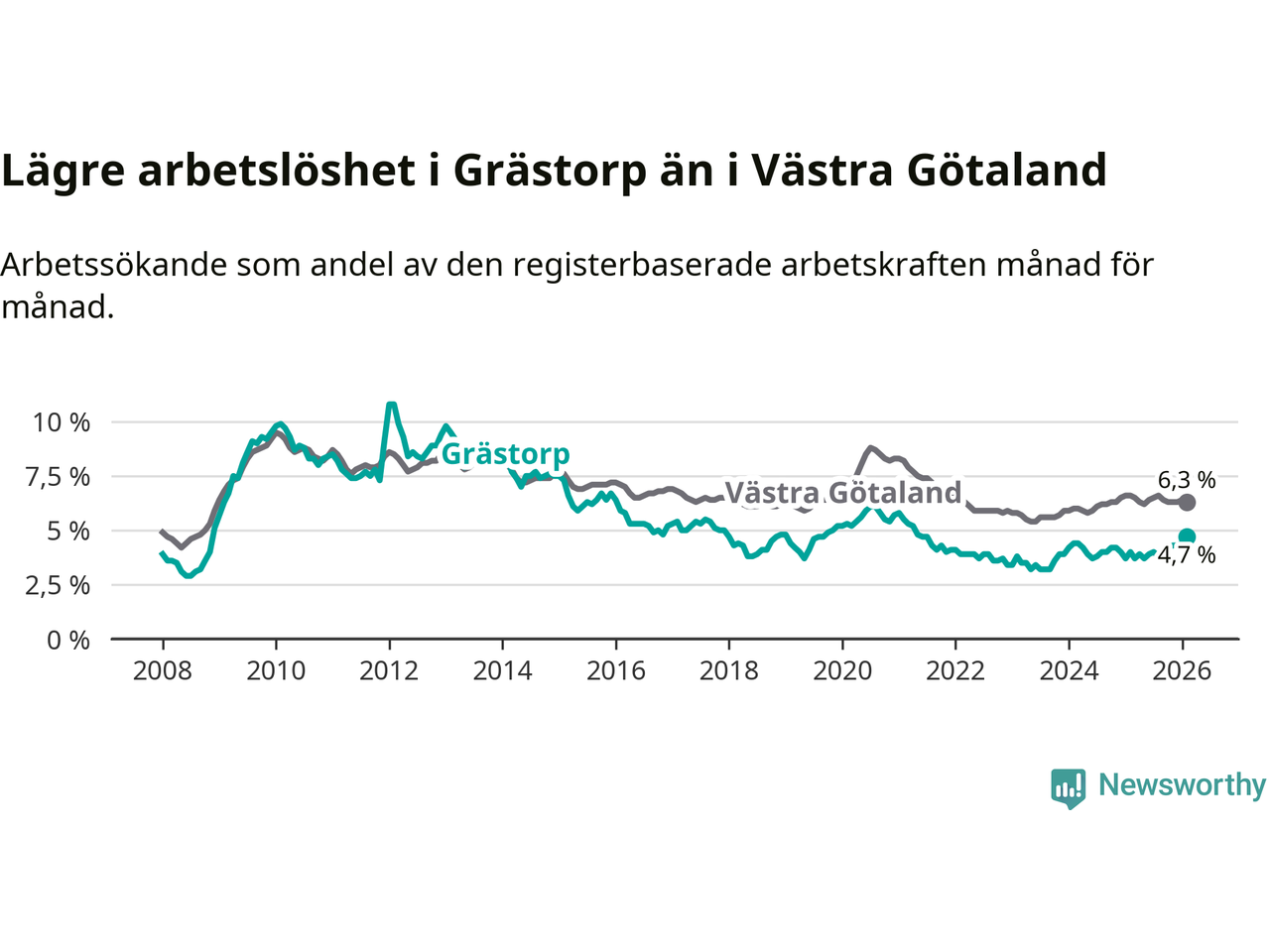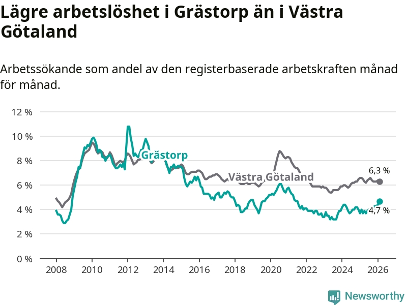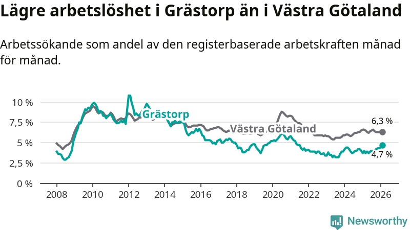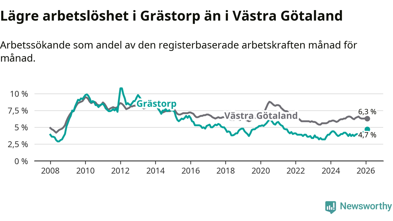 Under februari månad rapporterade Grästorps kommun en total arbetslöshet på 4,7 procent. Det är en ökning jämfört med samma tidpunkt i fjol (+0,7 procentenheter). I Västra Götalands län däremot sjunker arbetslösheten .