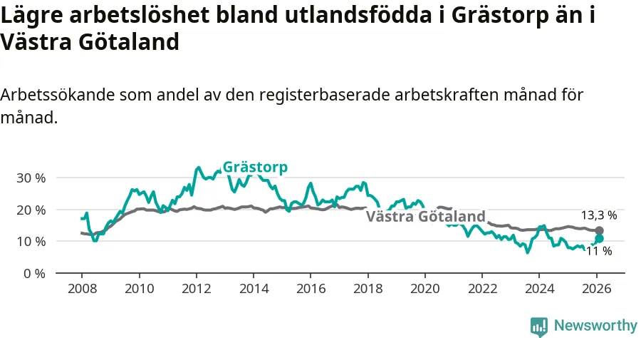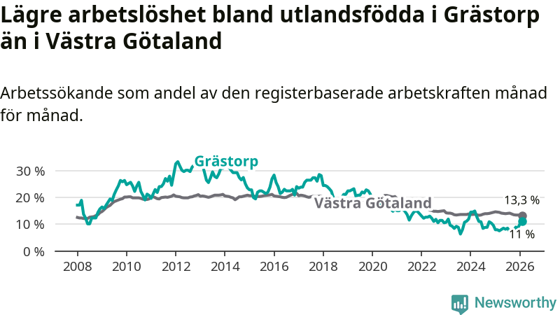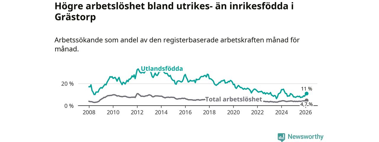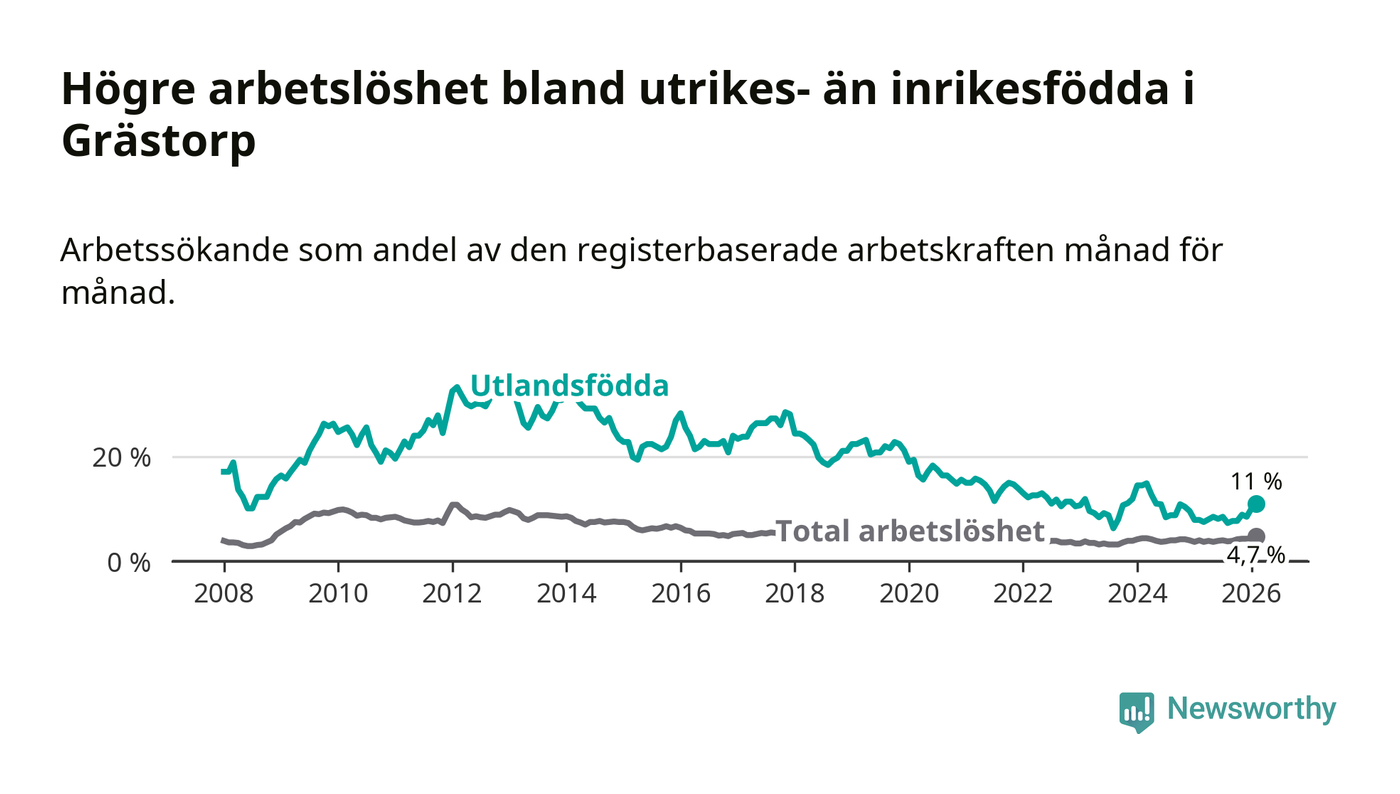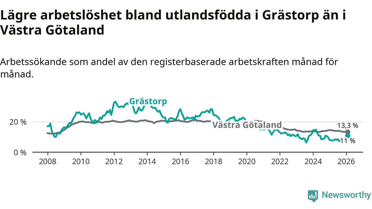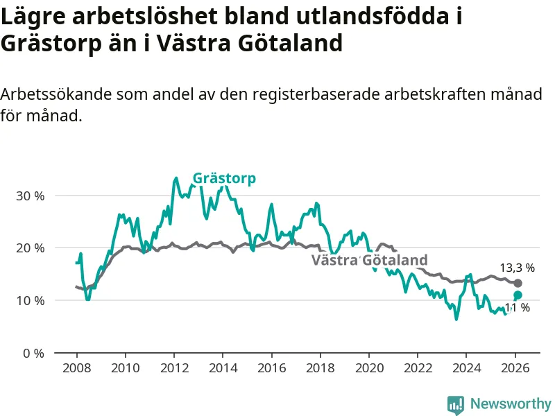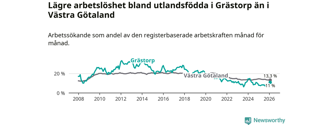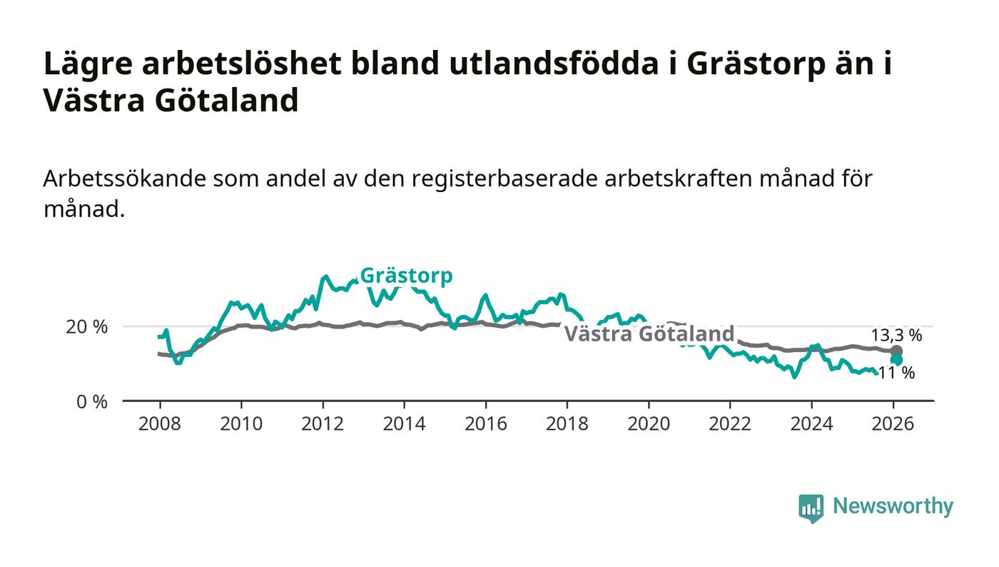 Medan arbetslösheten bland utlandsfödda alltså ökar i Grästorp så minskar den i Västra Götaland. Jämfört med februari förra året har andelen arbetslösa utlandsfödda i länet minskat med 1,2 procentenheter (till 13,3 procent). Trots den senaste uppgången har Grästorp med andra ord fortfarande lägre arbetslöshet bland utlandsfödda än Västra Götaland.