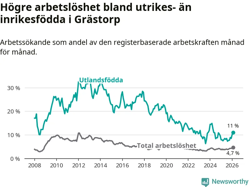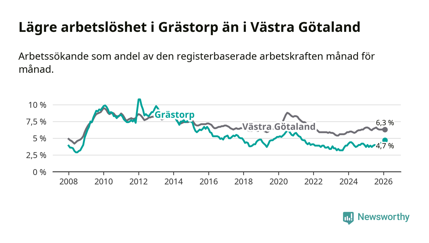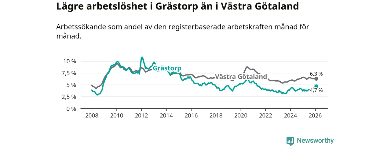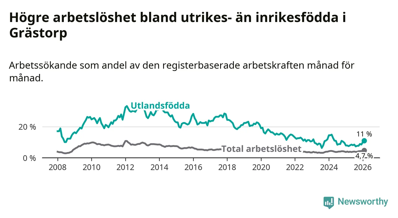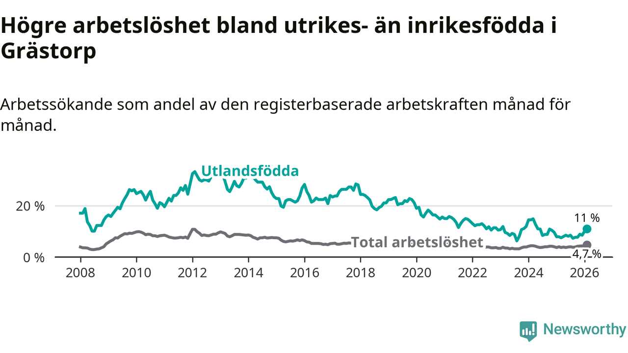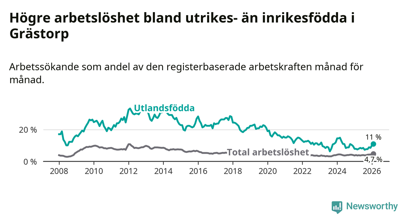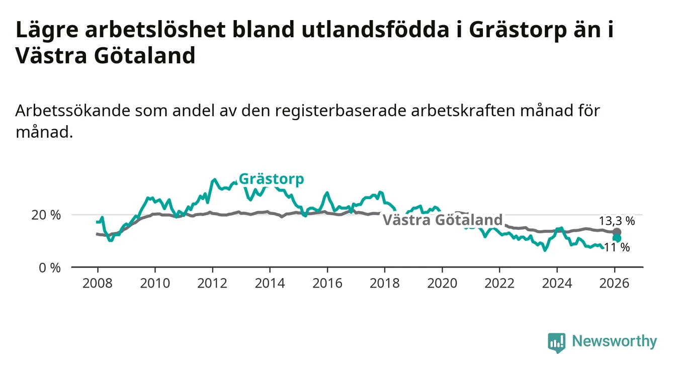 Medan arbetslösheten bland utlandsfödda alltså ökar i Grästorp så minskar den i Västra Götaland. Jämfört med februari förra året har andelen arbetslösa utlandsfödda i länet minskat med 1,2 procentenheter (till 13,3 procent). Trots den senaste uppgången har Grästorp med andra ord fortfarande lägre arbetslöshet bland utlandsfödda än Västra Götaland.