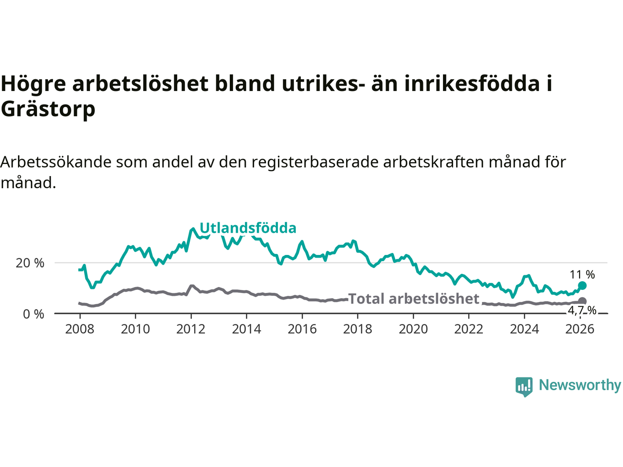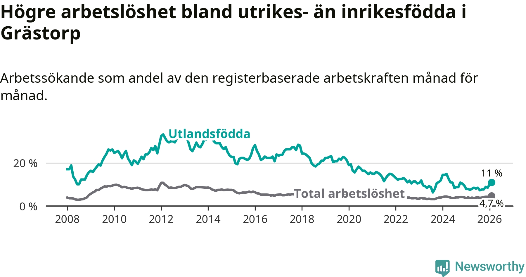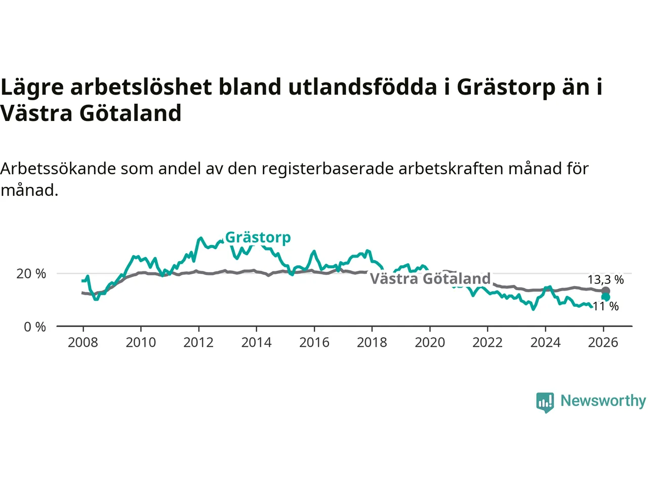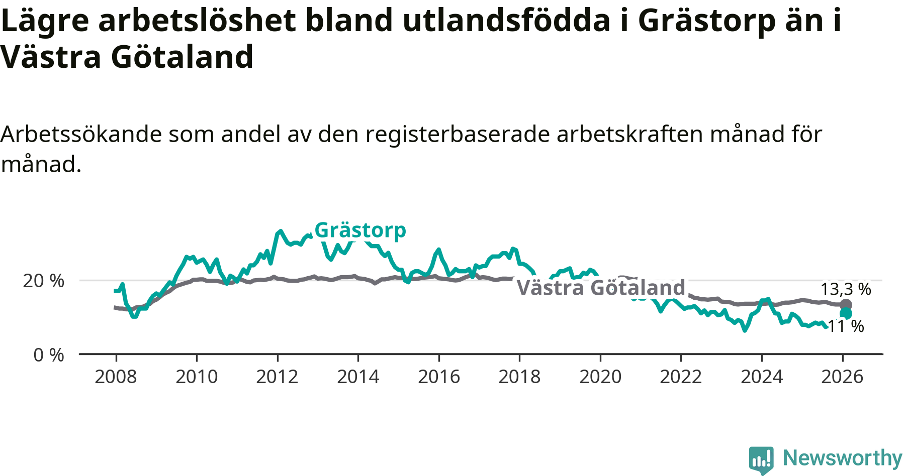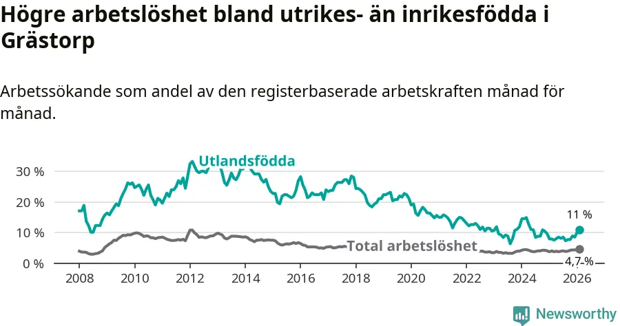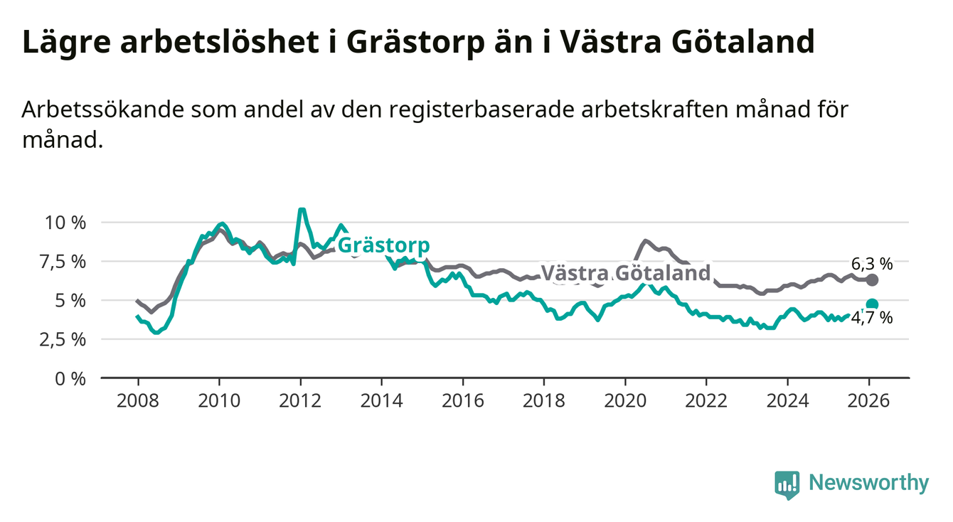 Medan arbetslösheten bland utlandsfödda alltså ökar i Grästorp så minskar den i Västra Götaland. Jämfört med februari förra året har andelen arbetslösa utlandsfödda i länet minskat med 1,2 procentenheter (till 13,3 procent). Trots den senaste uppgången har Grästorp med andra ord fortfarande lägre arbetslöshet bland utlandsfödda än Västra Götaland.
