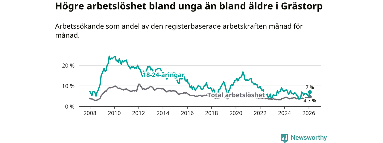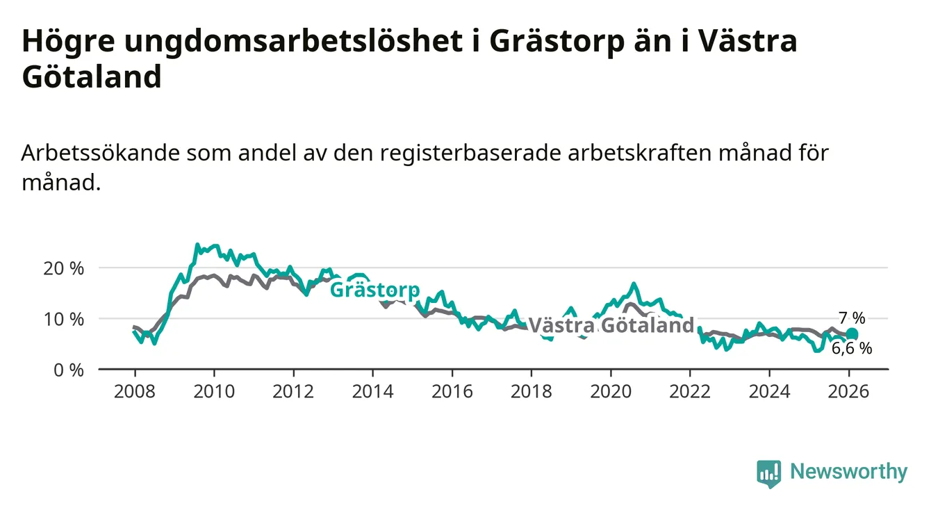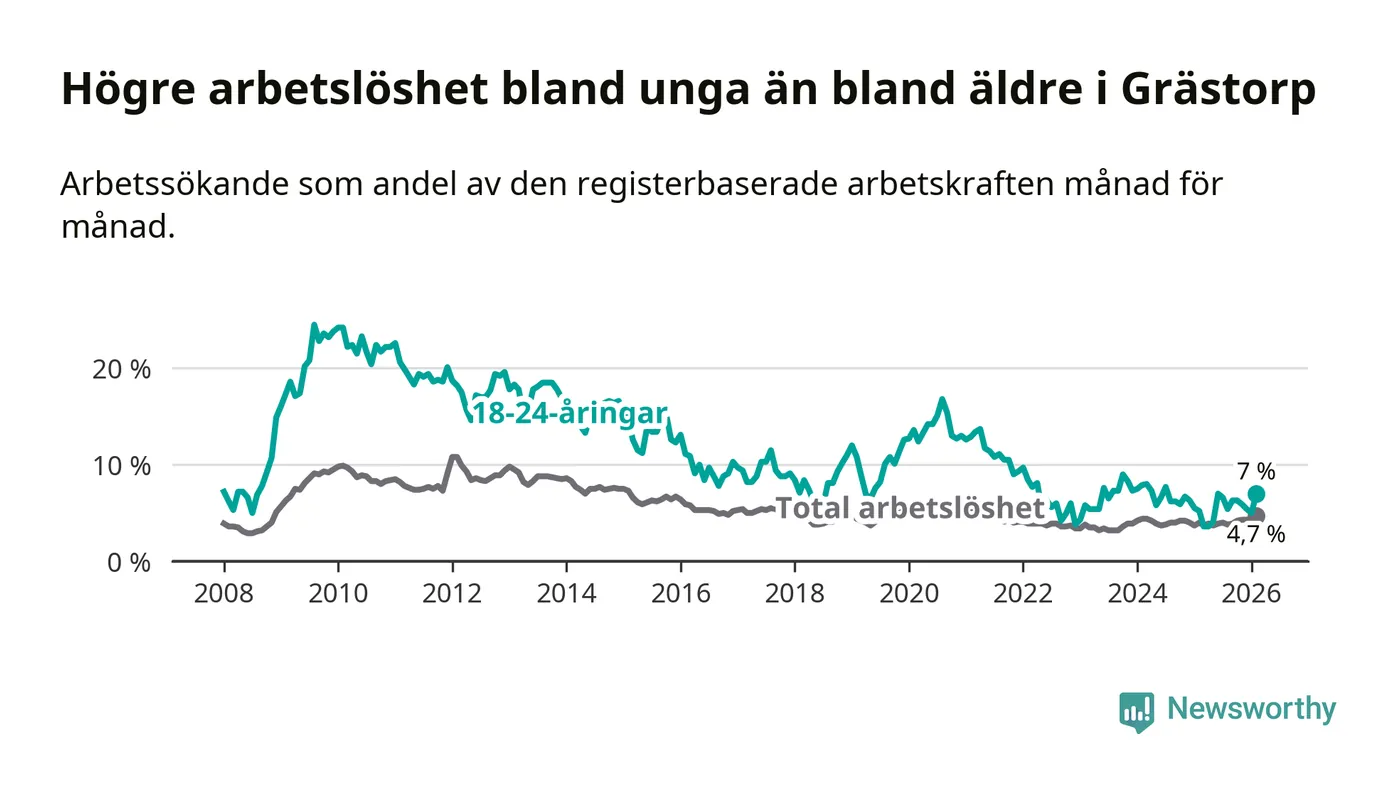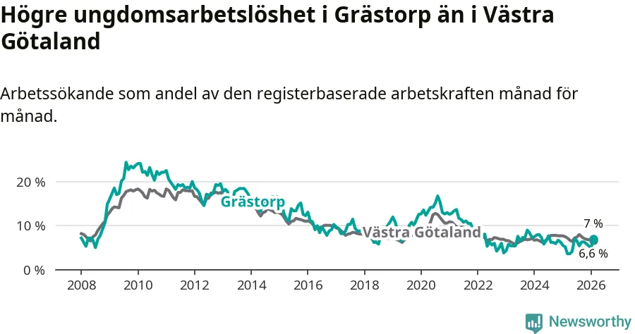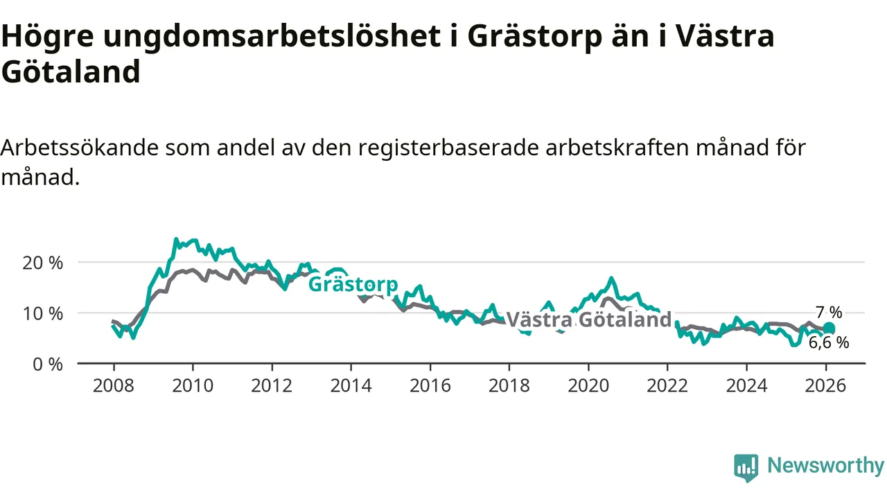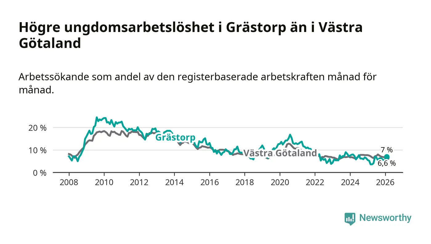 Medan Grästorp har lägre total arbetslöshet än Västra Götaland, ligger ungdomsarbetslösheten 0,4 procentenheter högre i Grästorp.