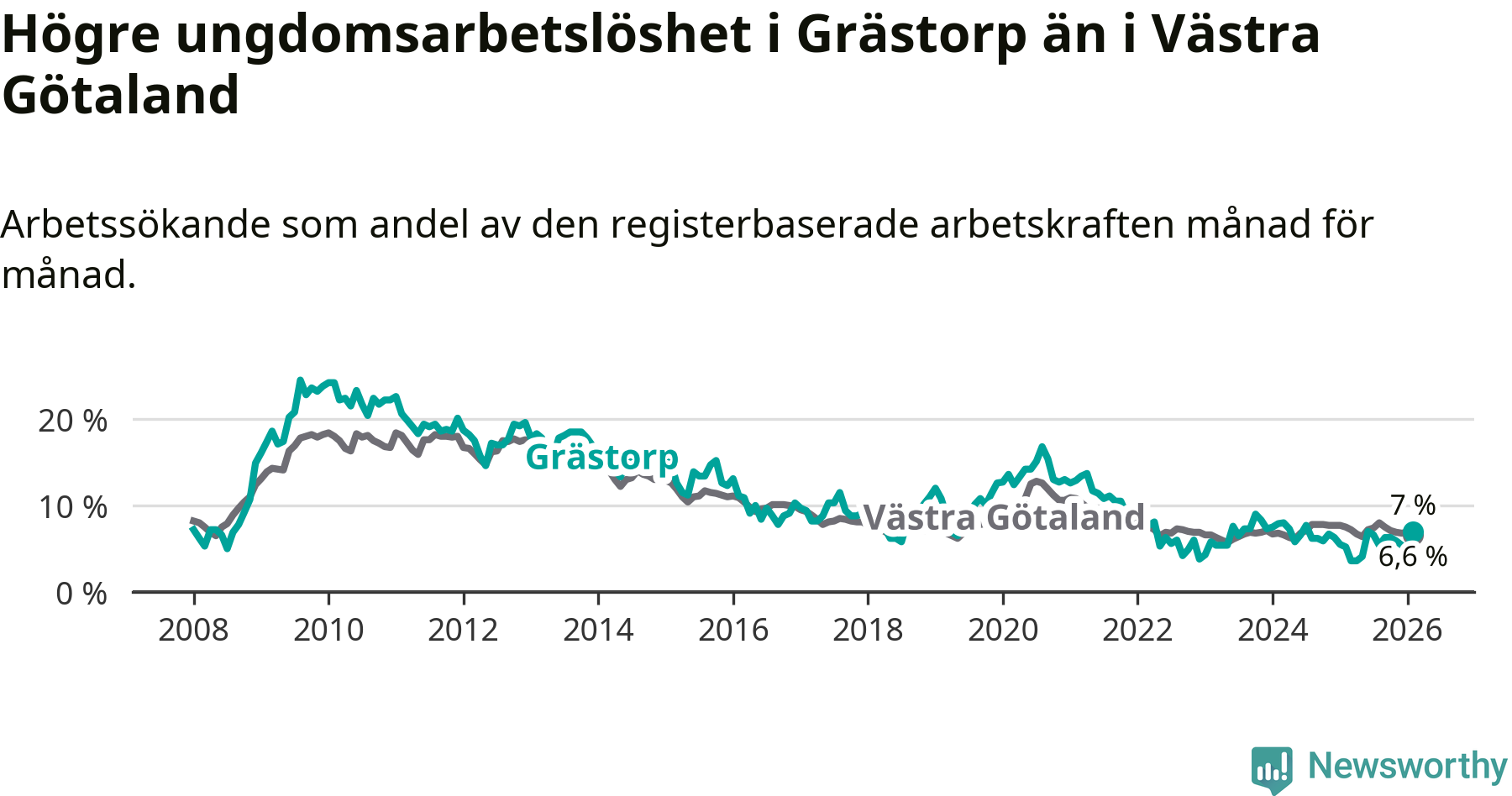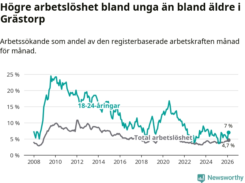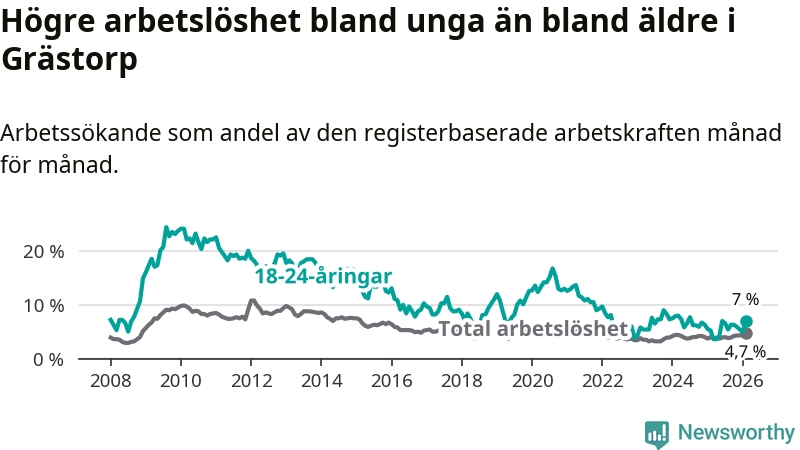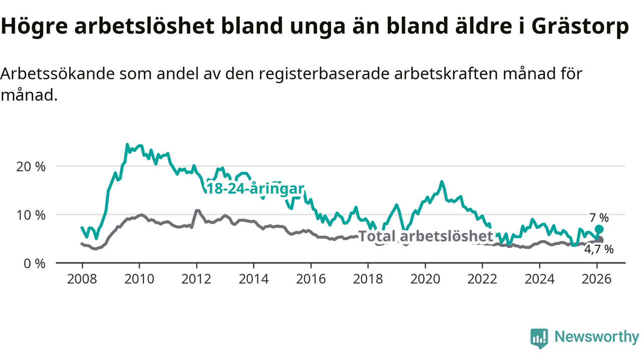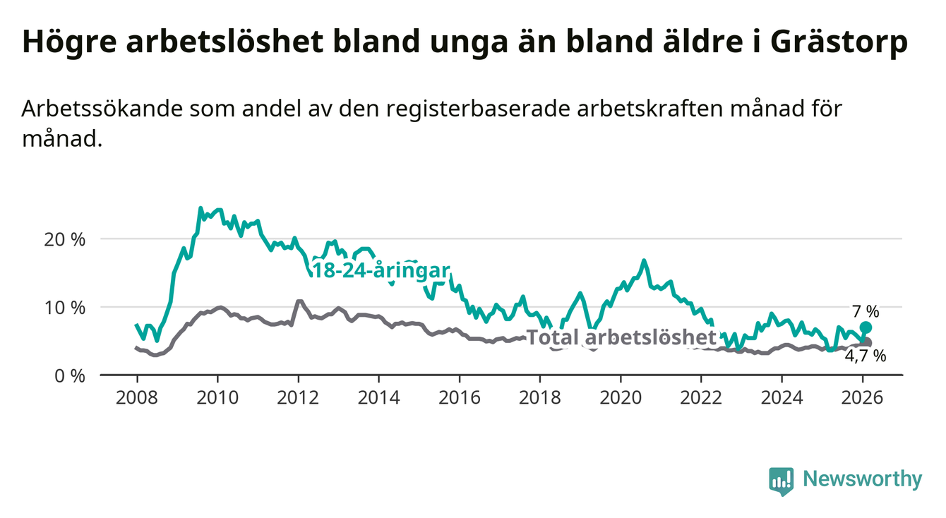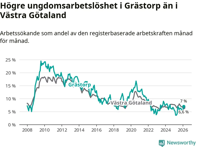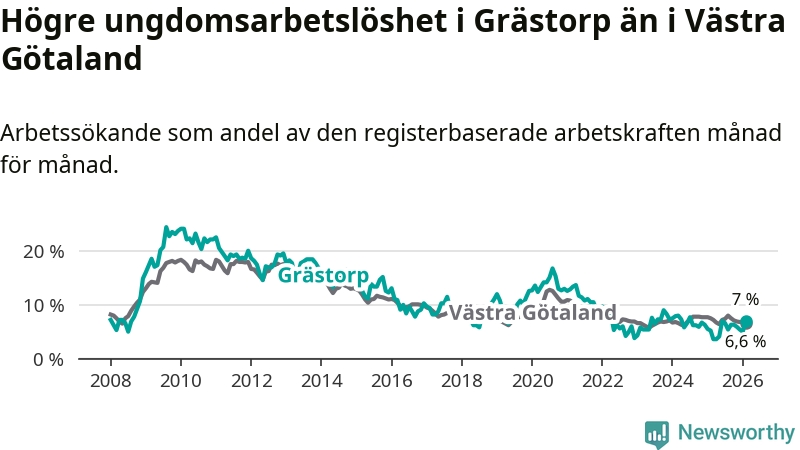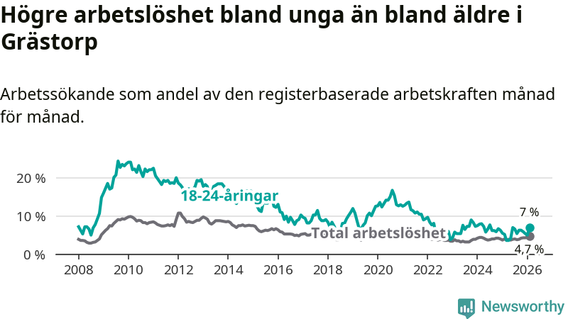 Medan Grästorp har lägre total arbetslöshet än Västra Götaland, ligger ungdomsarbetslösheten 0,4 procentenheter högre i Grästorp.