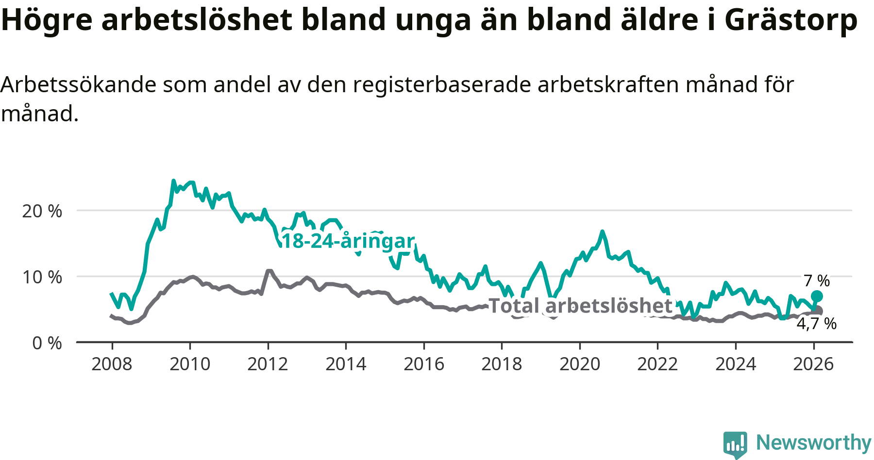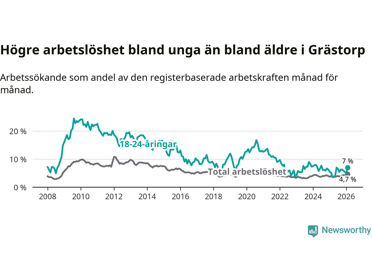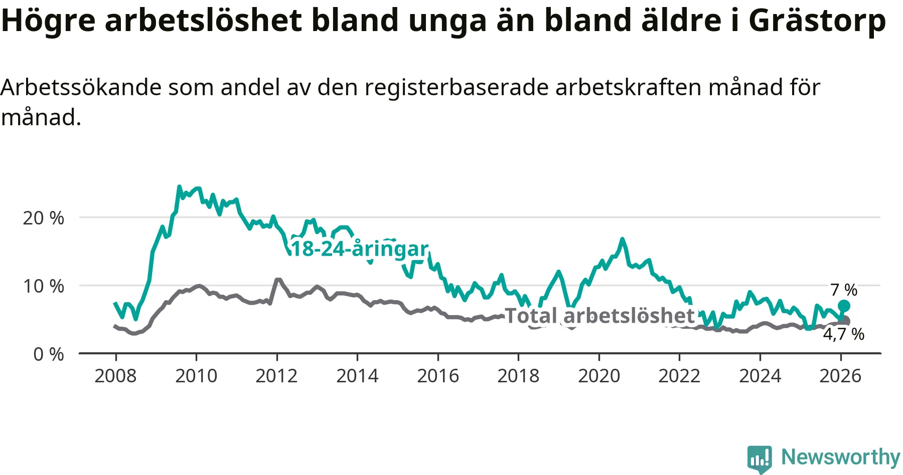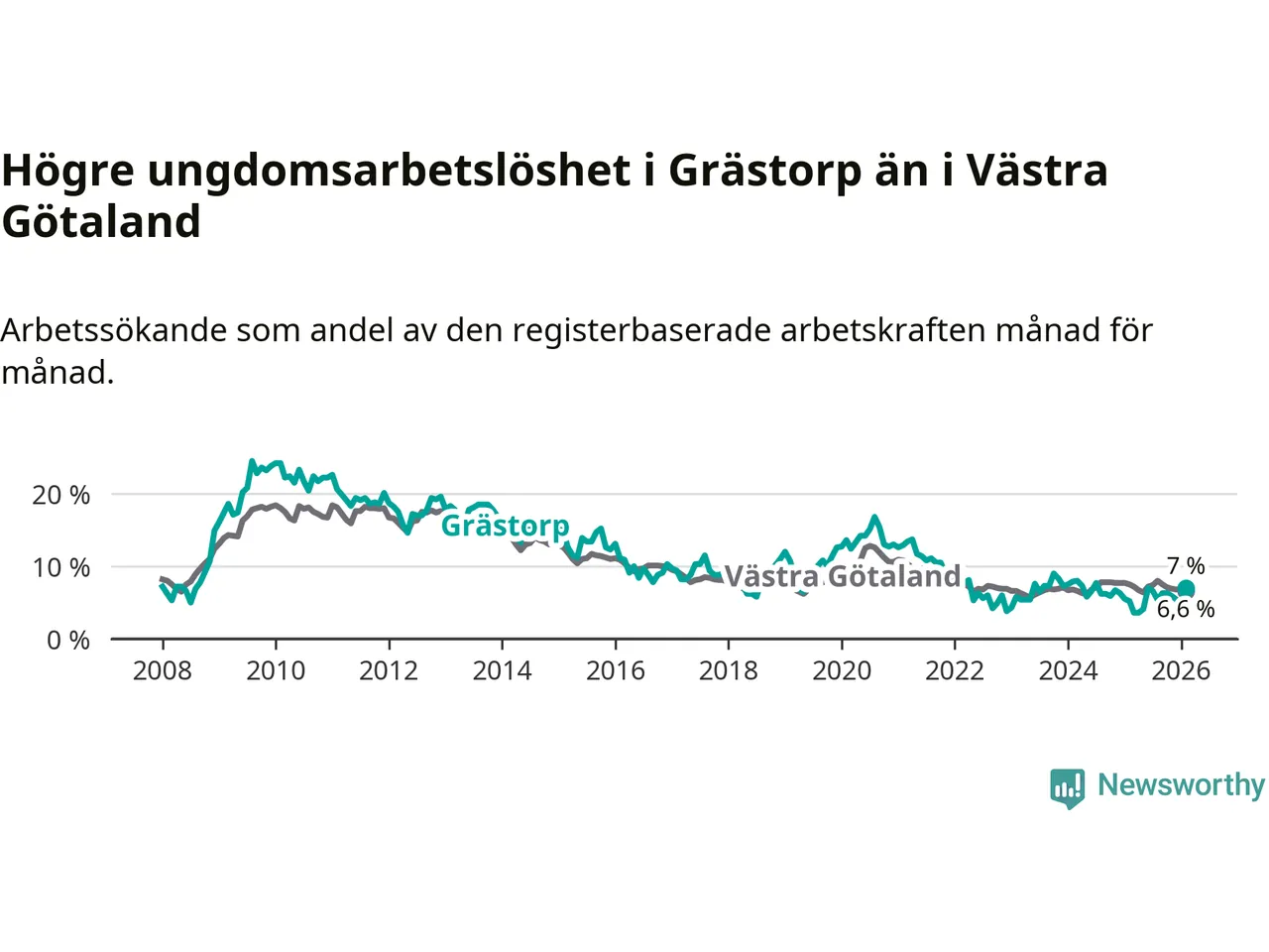 Medan Grästorp har lägre total arbetslöshet än Västra Götaland, ligger ungdomsarbetslösheten 0,4 procentenheter högre i Grästorp.