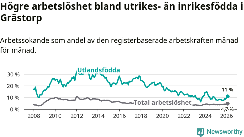 Arbetslösheten bland utlandsfödda var 11,0 procent i Grästorp under februari månad, motsvarande 26 av 236 personer. Det är 3,1 procentenheter fler än vid samma tidpunkt i fjol (+7 om man räknar personer).