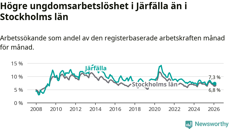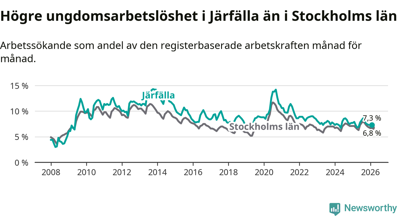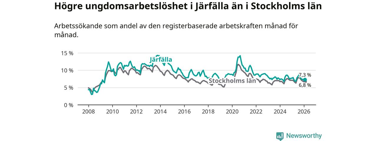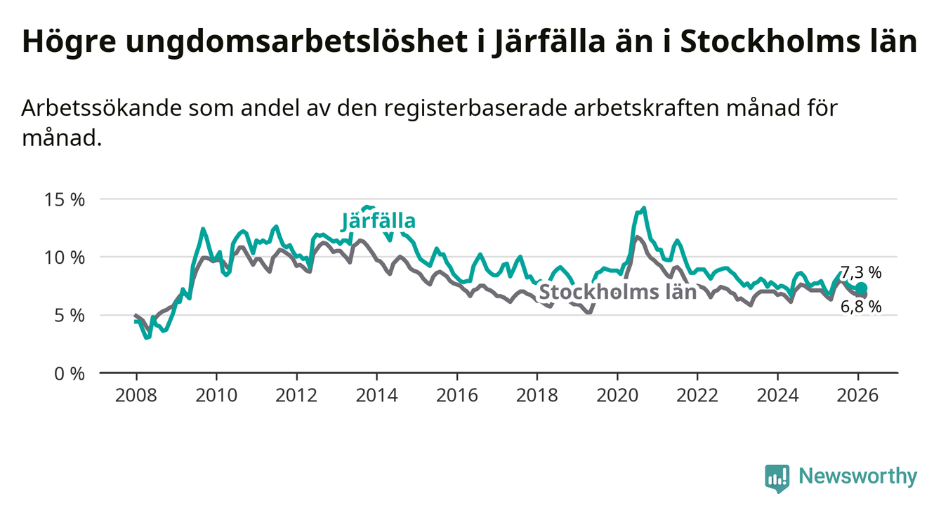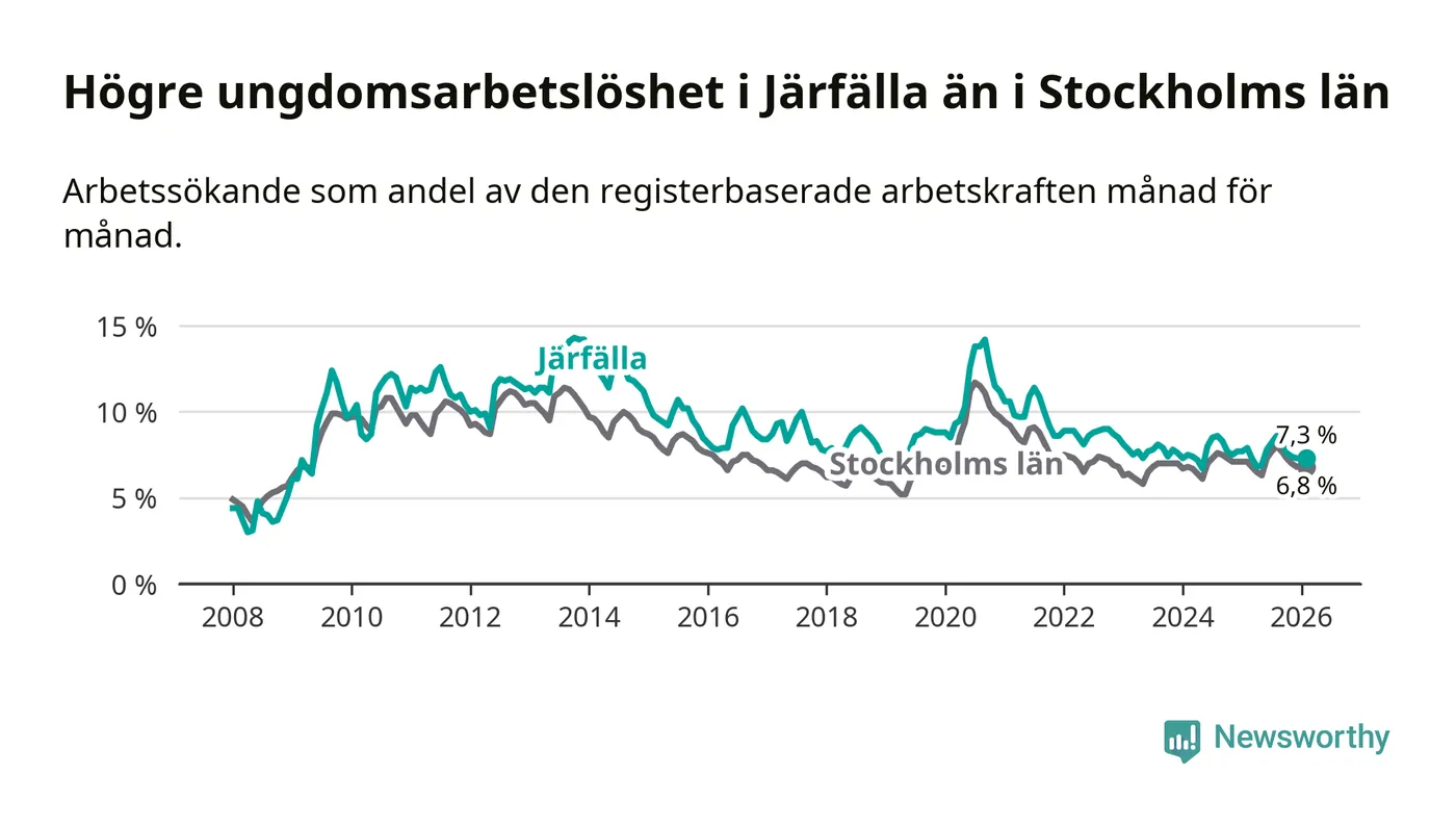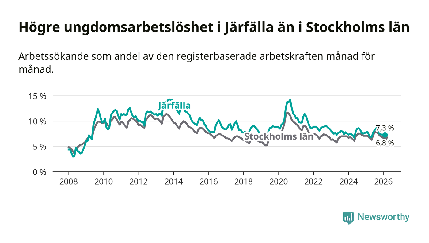 Precis som den totala arbetslösheten ligger ungdomsarbetslösheten i Järfälla högre än i Stockholms län som helhet. Skillnaden mellan kommunen och länet är 0,5 procentenheter.
