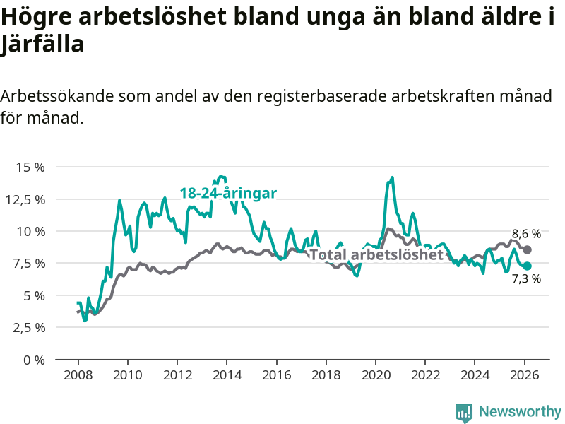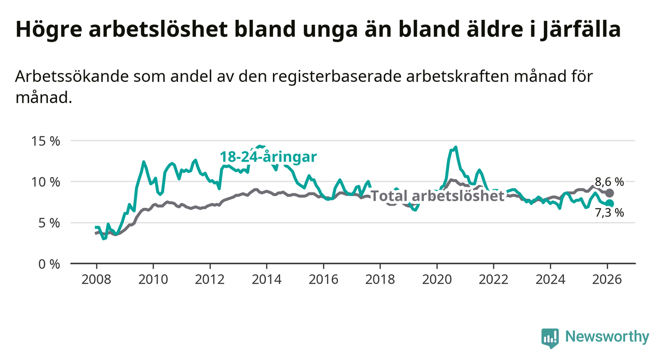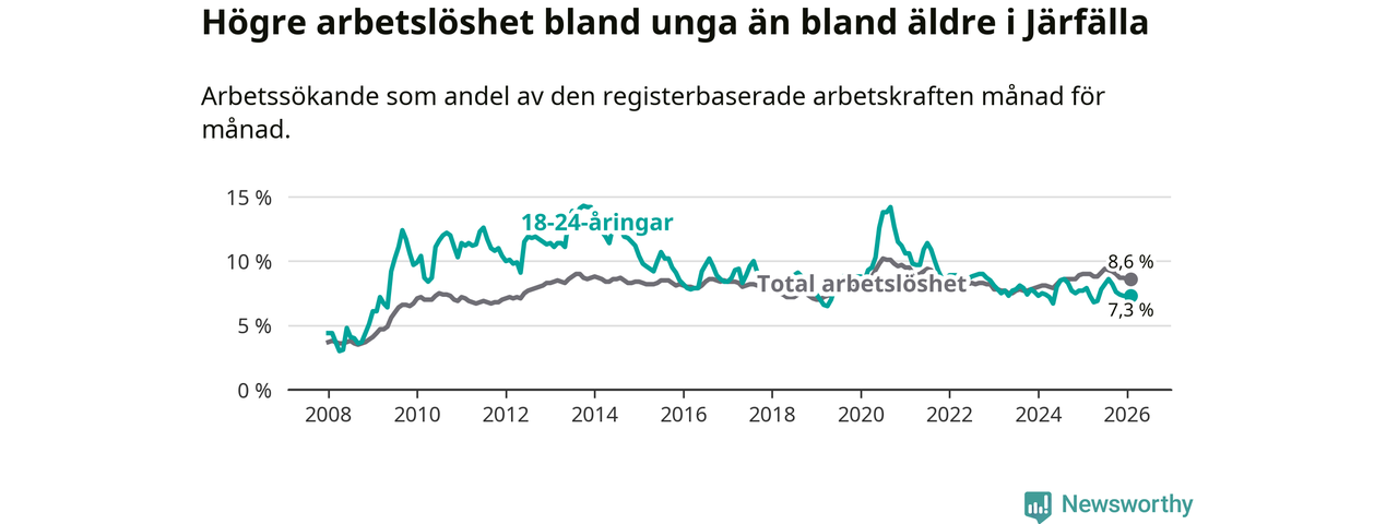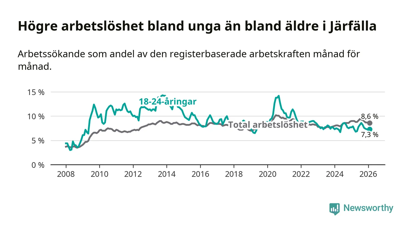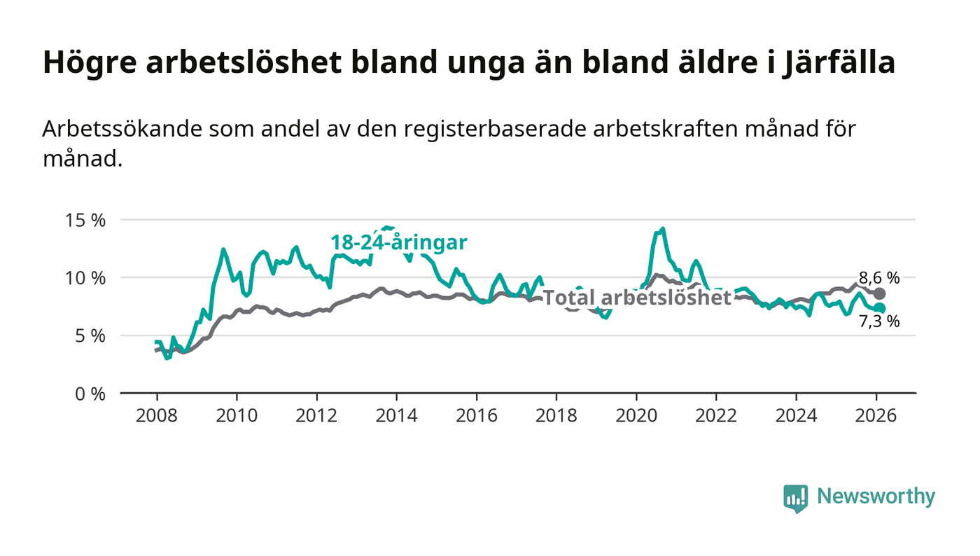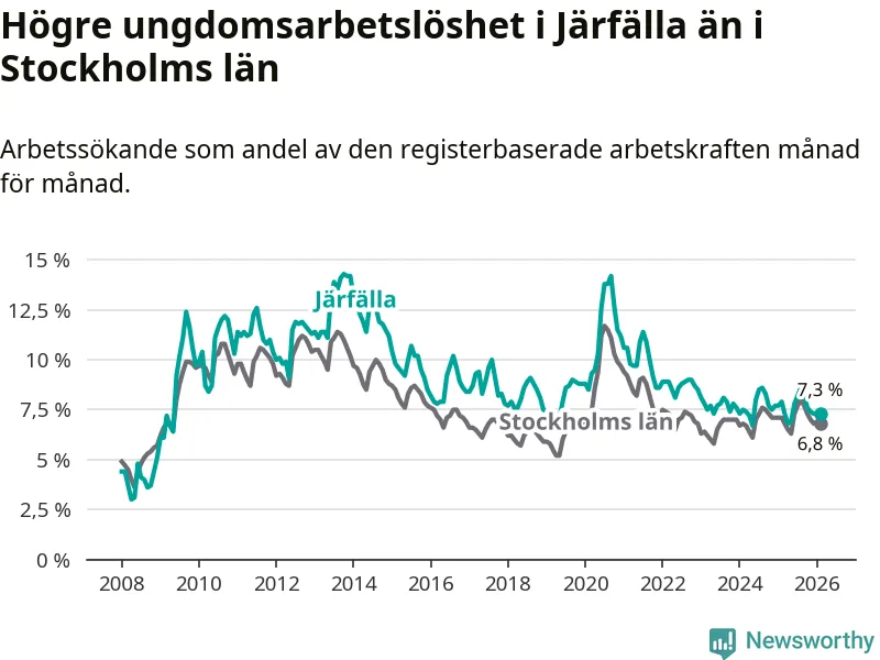 Precis som den totala arbetslösheten ligger ungdomsarbetslösheten i Järfälla högre än i Stockholms län som helhet. Skillnaden mellan kommunen och länet är 0,5 procentenheter.