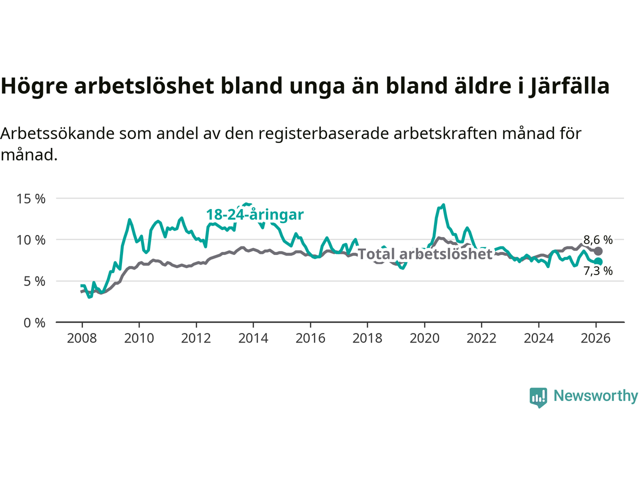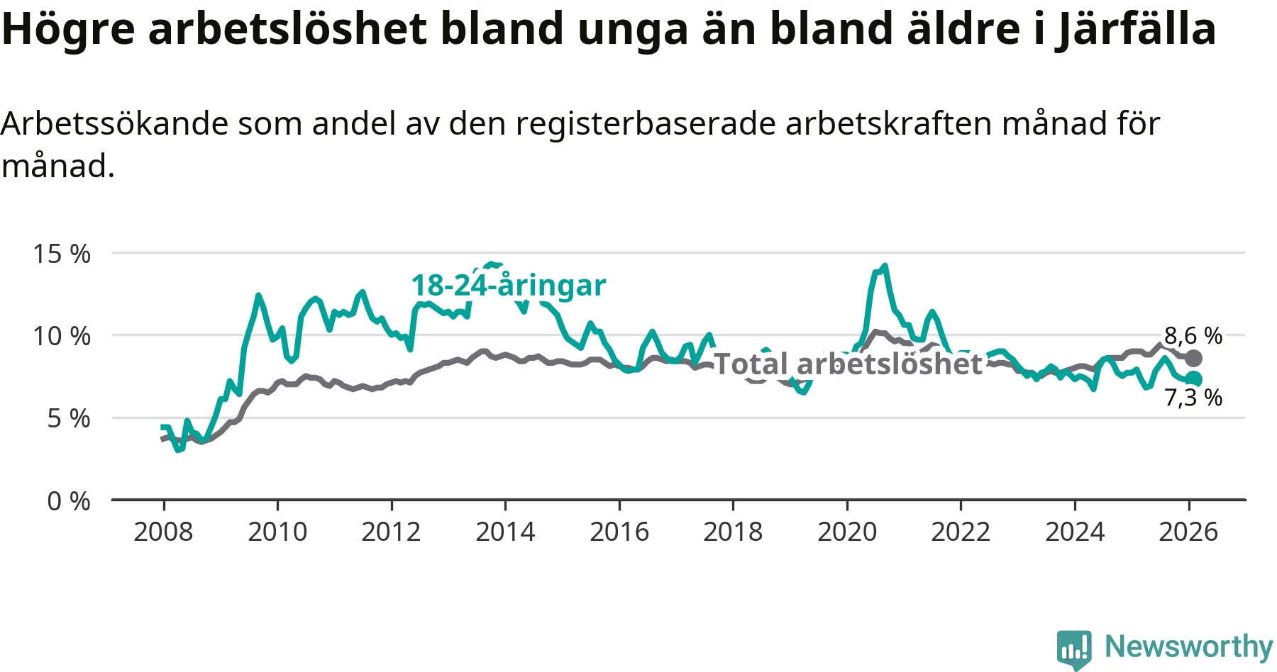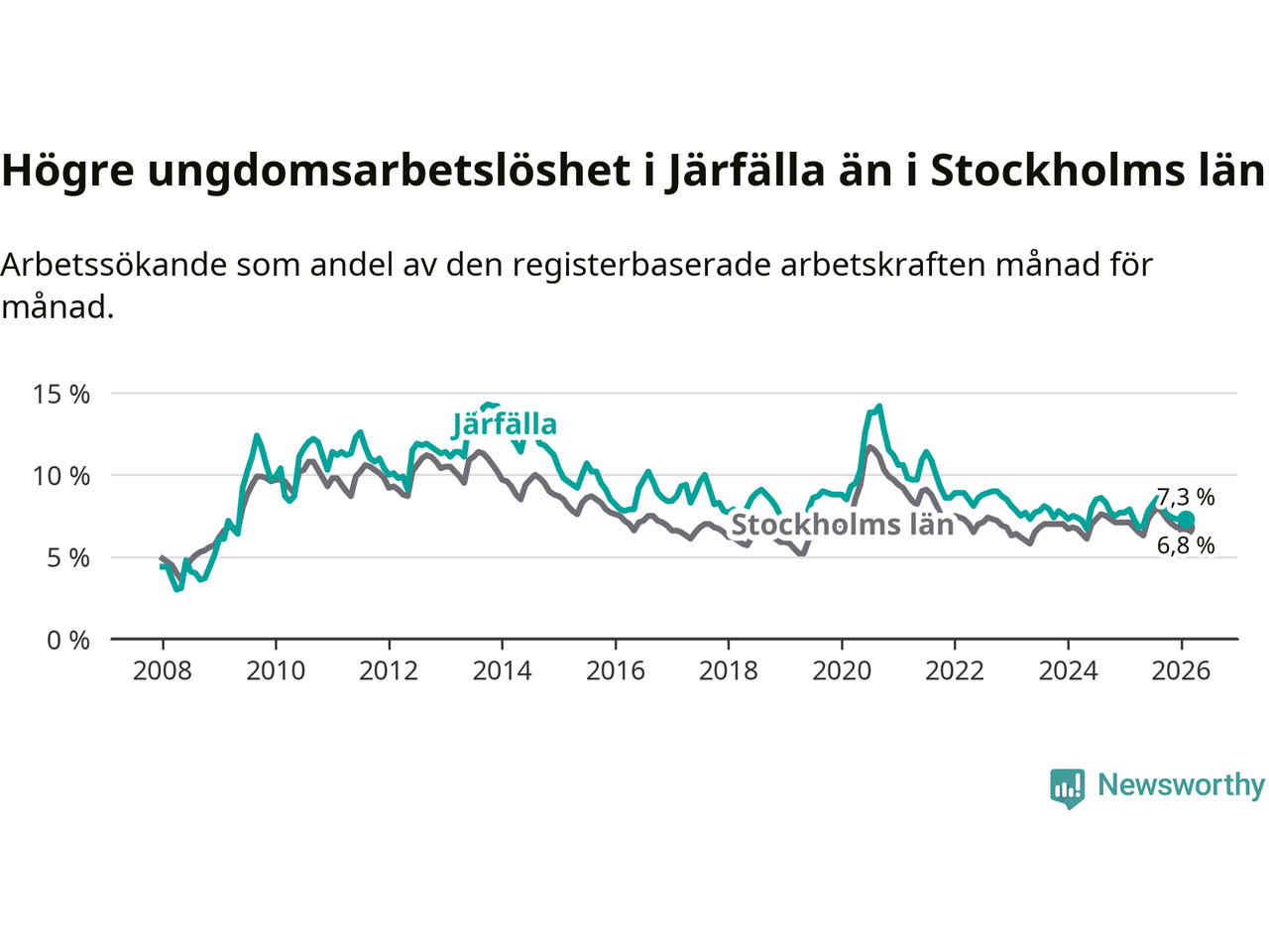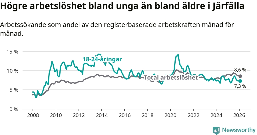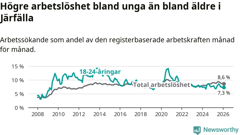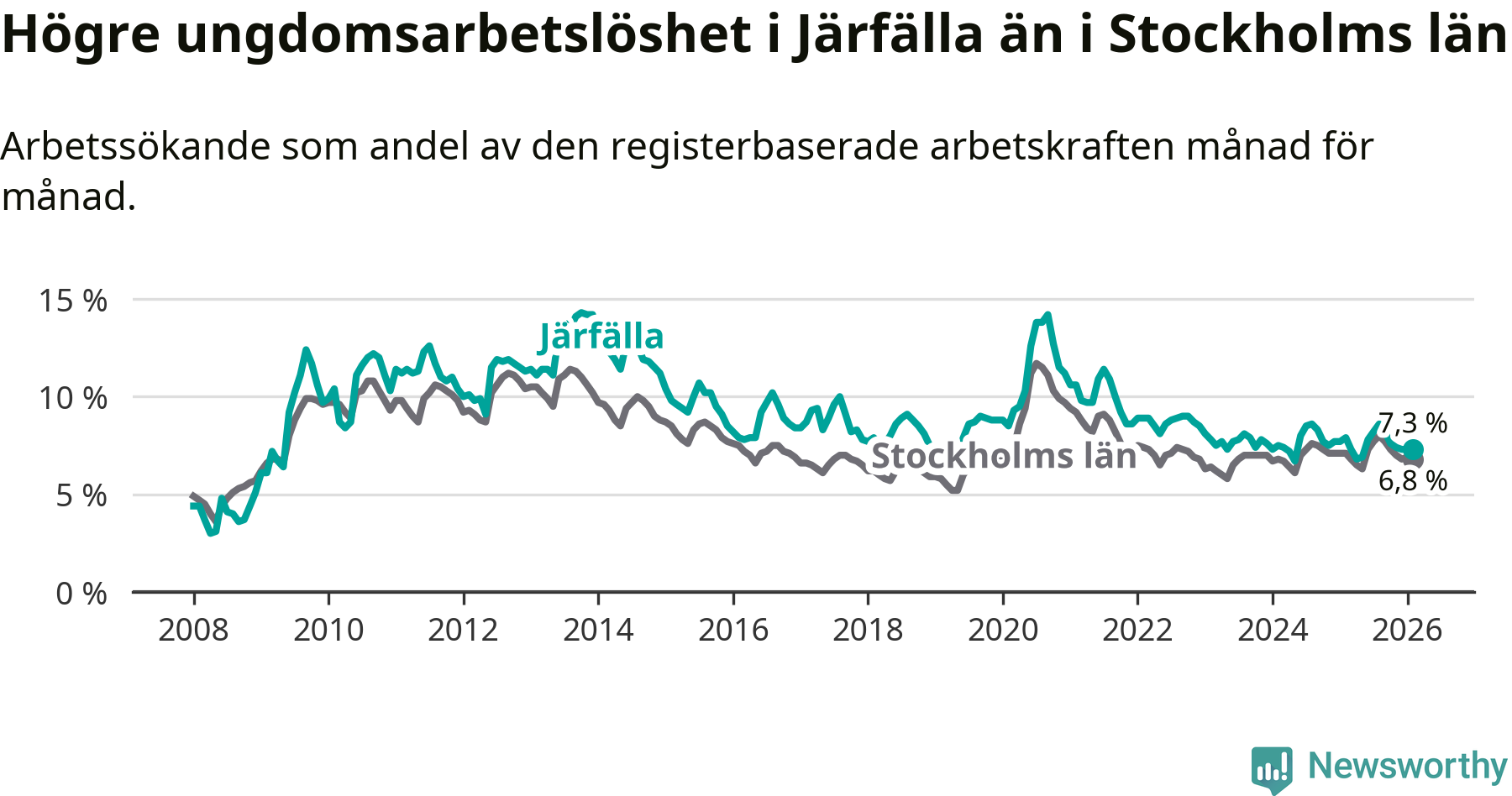 Precis som den totala arbetslösheten ligger ungdomsarbetslösheten i Järfälla högre än i Stockholms län som helhet. Skillnaden mellan kommunen och länet är 0,5 procentenheter.